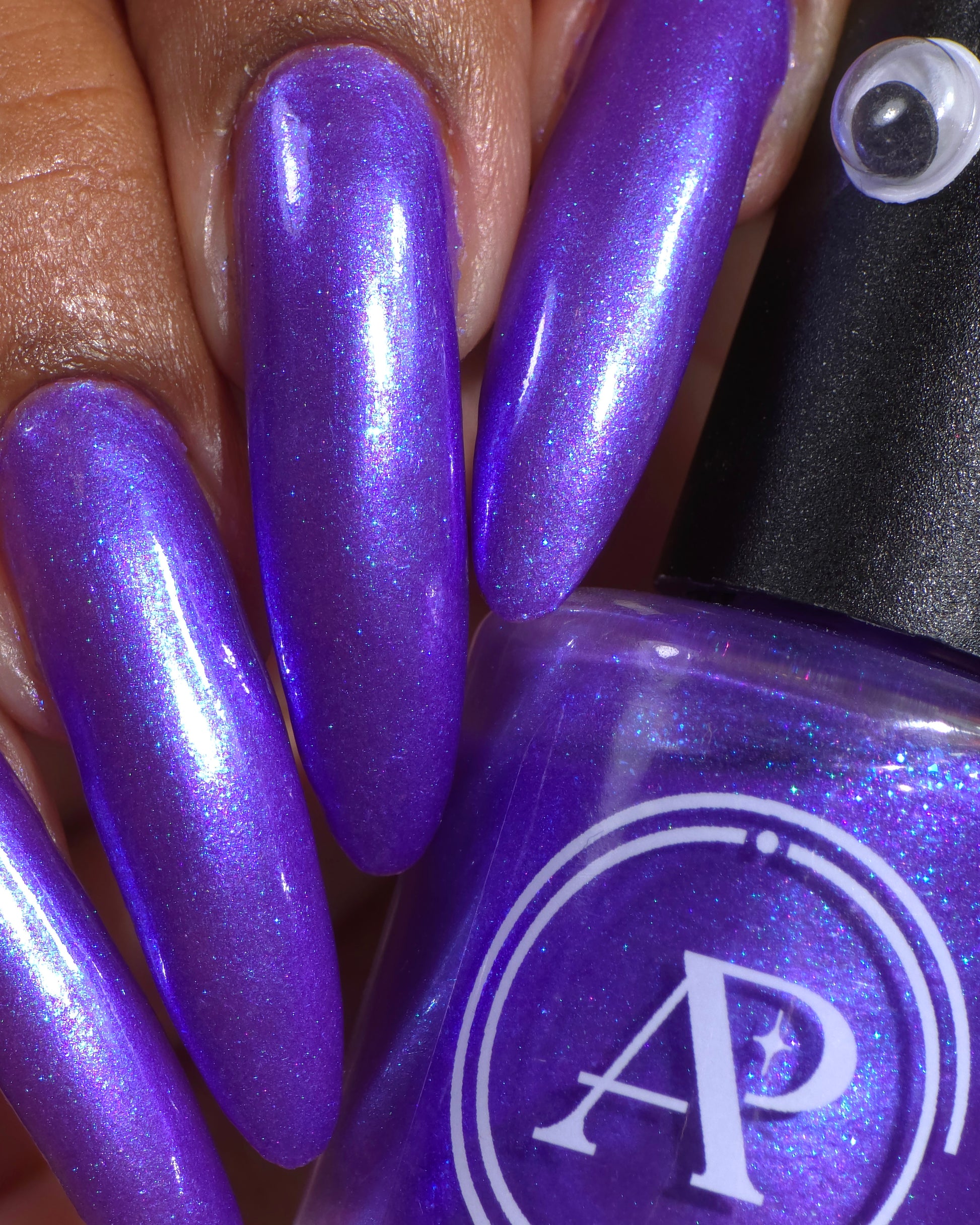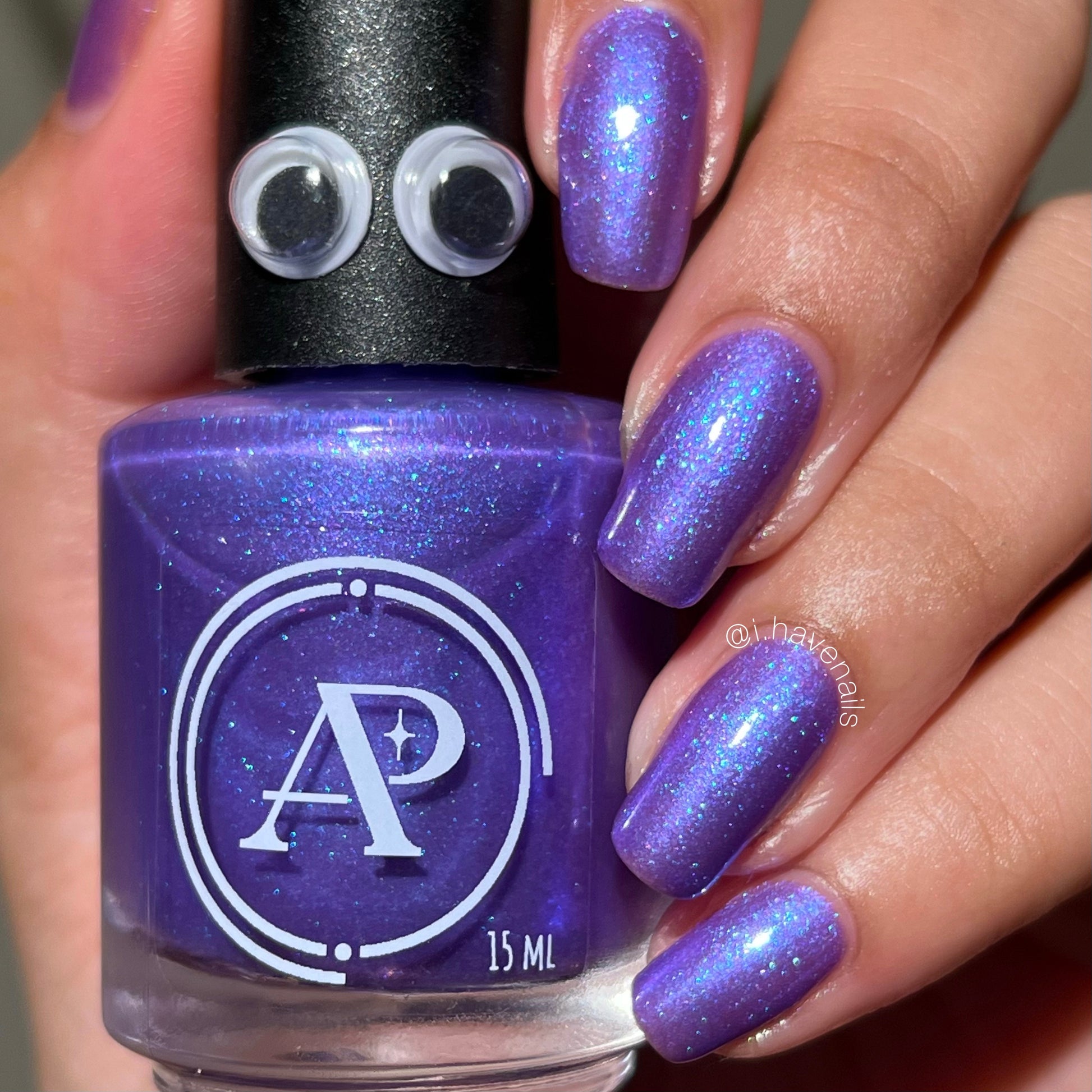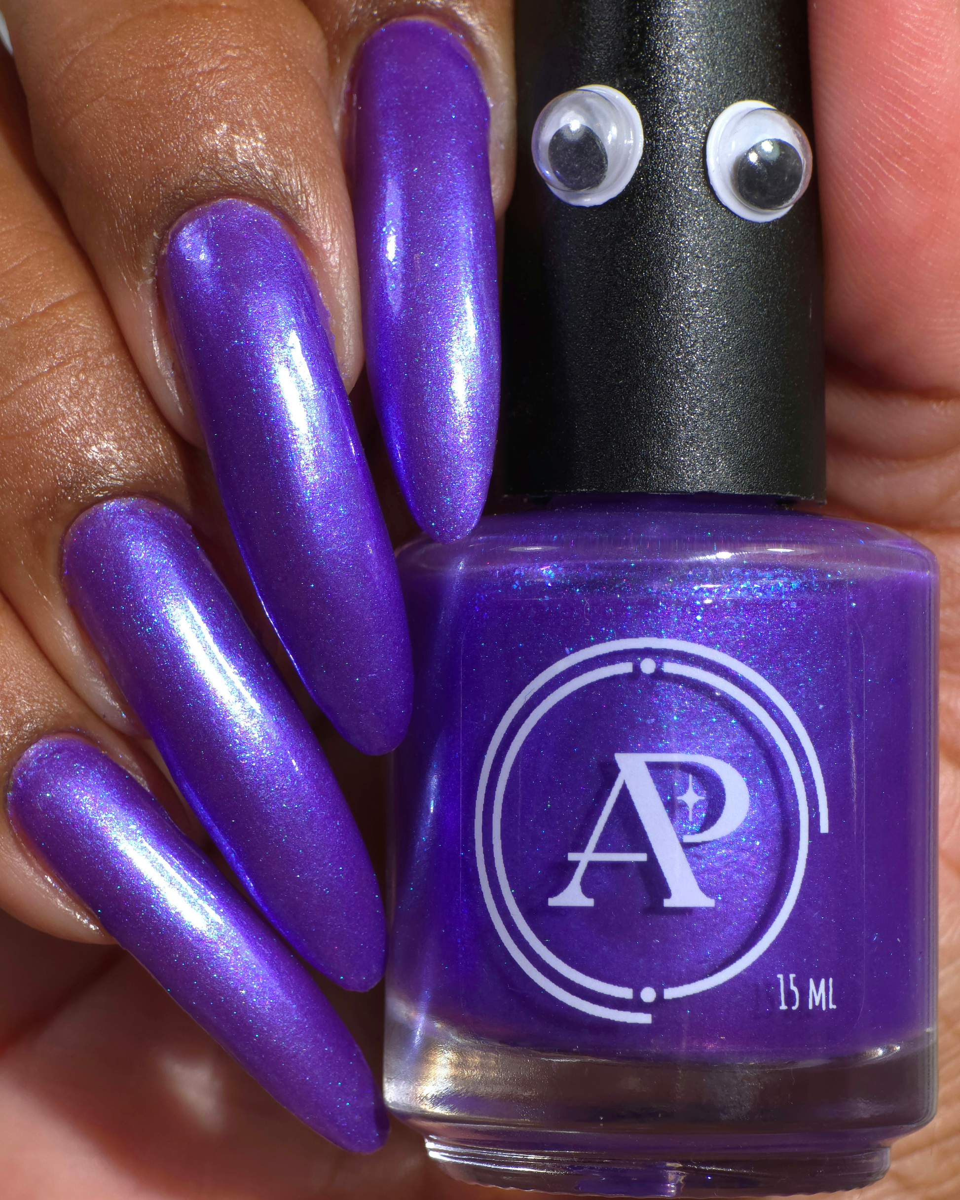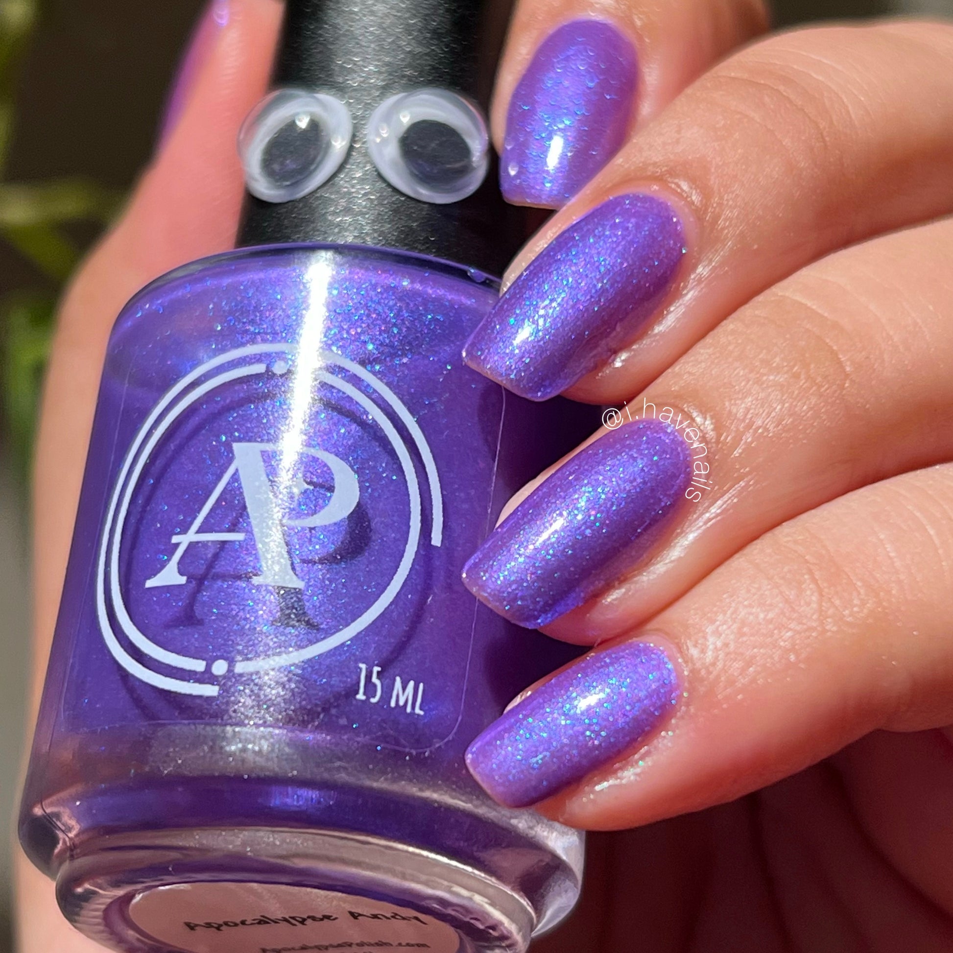 Apocalypse Andy is a shade that is a combination of Andy's favorite things -- vivid purple with large particle blue shimmer, and blue aurora shimmer. It is inspired by real Andy’s love of purple, and the dark depths of the ocean where Cthulhu sleeps.
