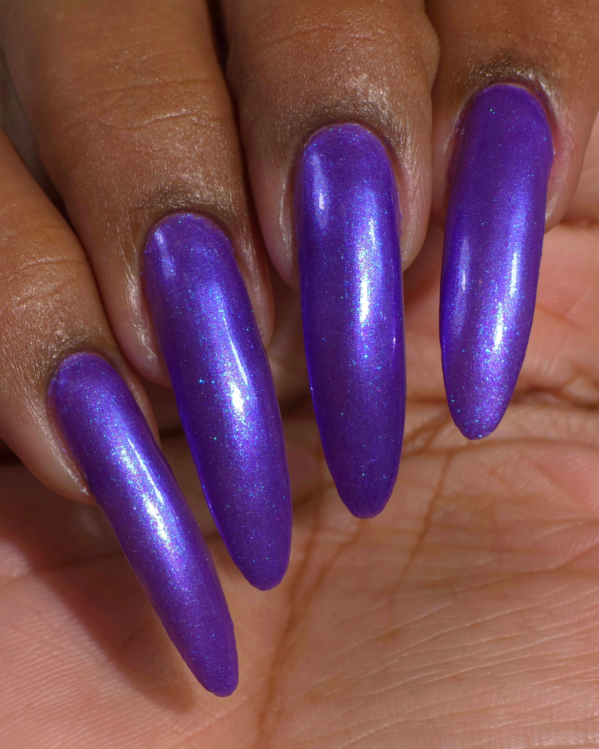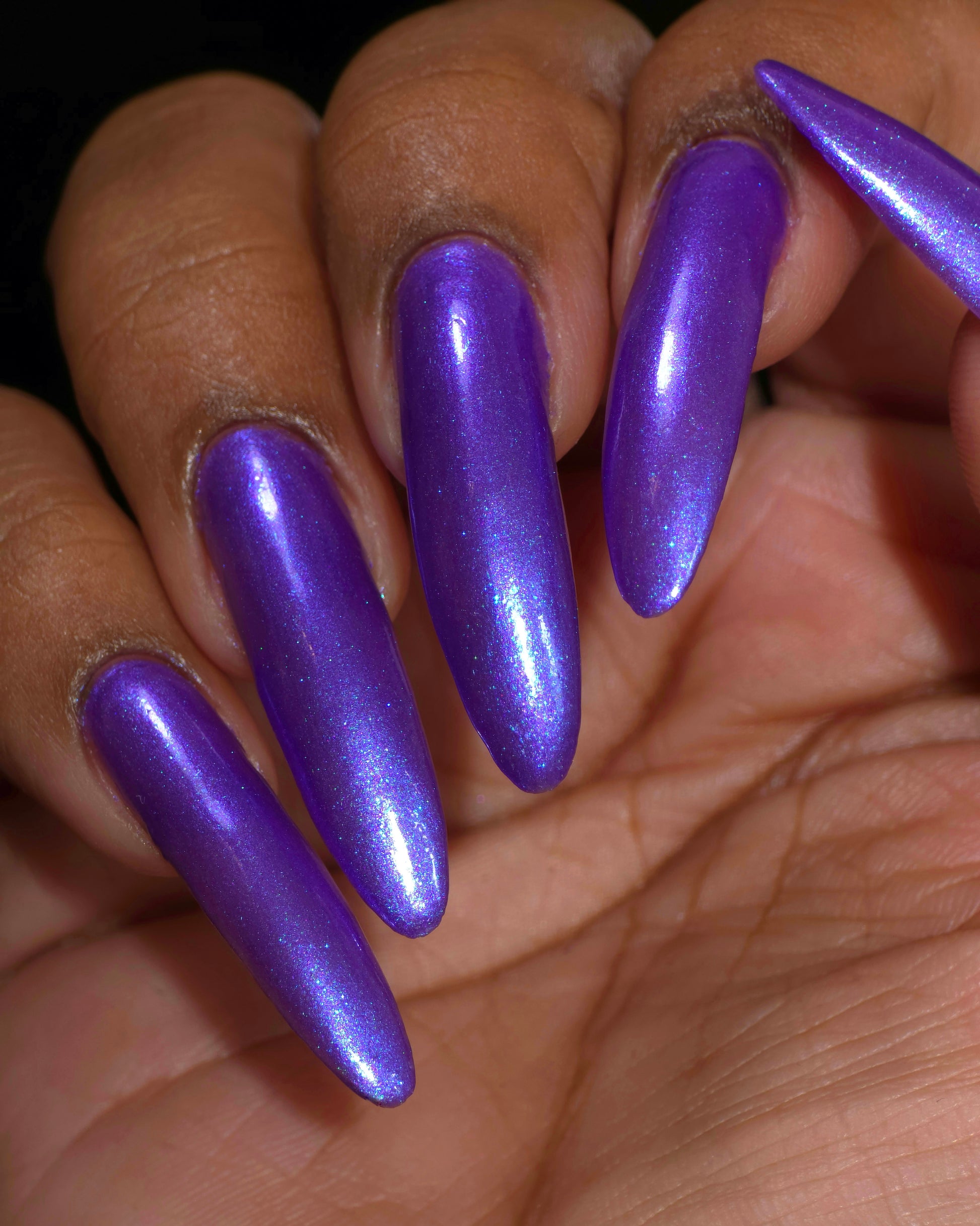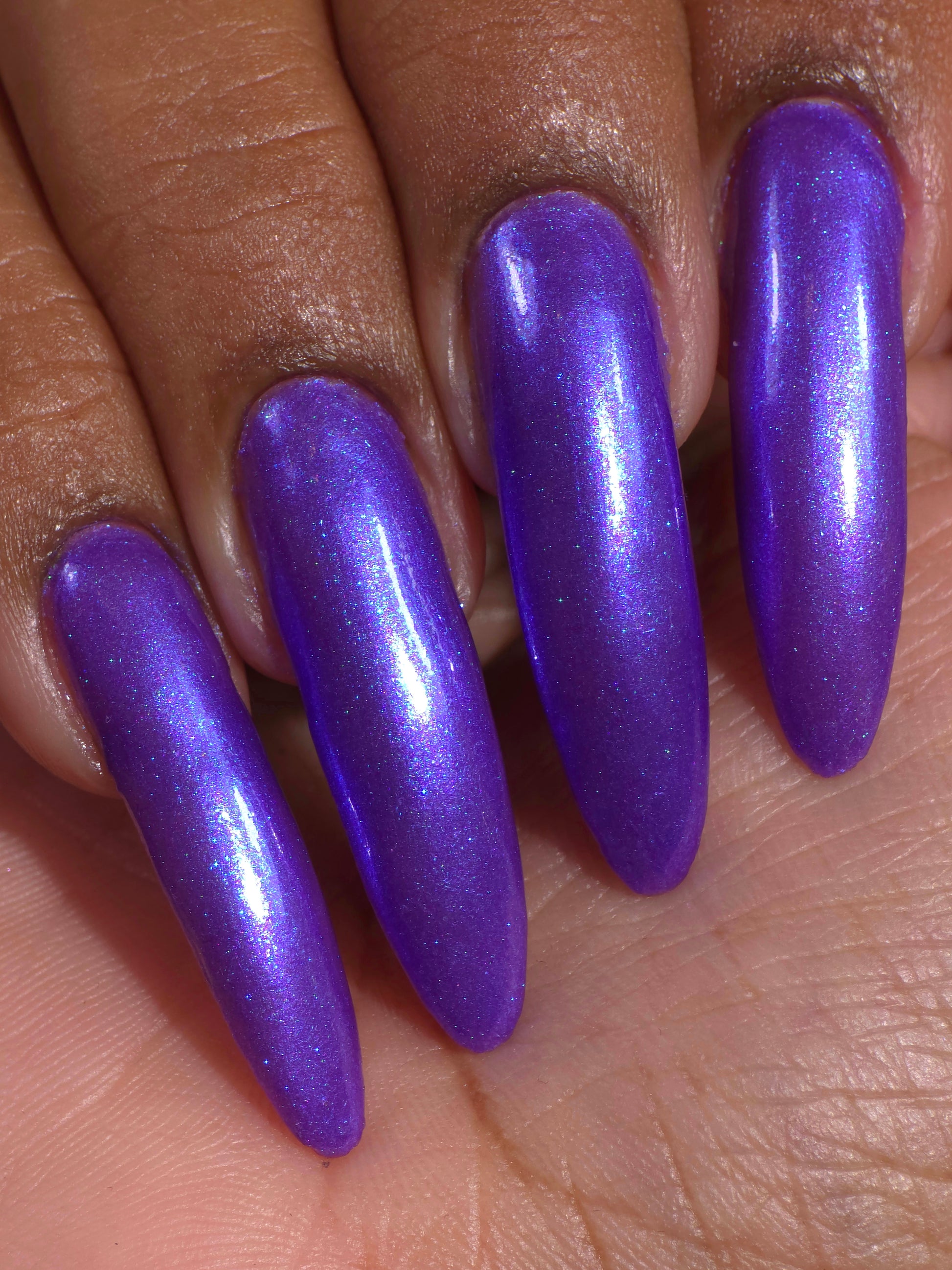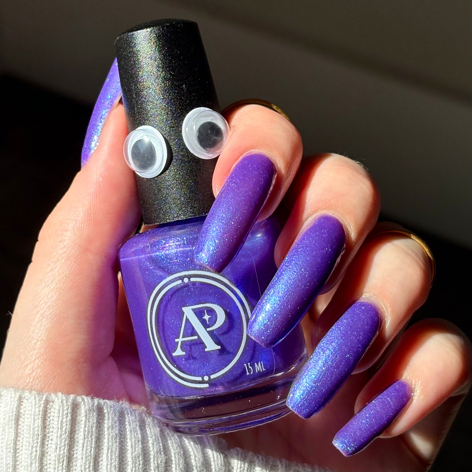 Apocalypse Andy is a shade that is a combination of Andy's favorite things -- vivid purple with large particle blue shimmer, and blue aurora shimmer. It is inspired by real Andy’s love of purple, and the dark depths of the ocean where Cthulhu sleeps.