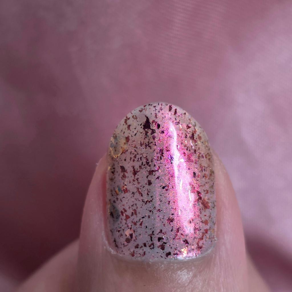 A sheer shimmer with flakes, this polish works great alone, or a a topper to spice up a manicure. Subtle enough to work as a palate cleanser, but enough punch to have it not be boring. Using it as a topper transforms what's underneath, and is fun to experiment with.
