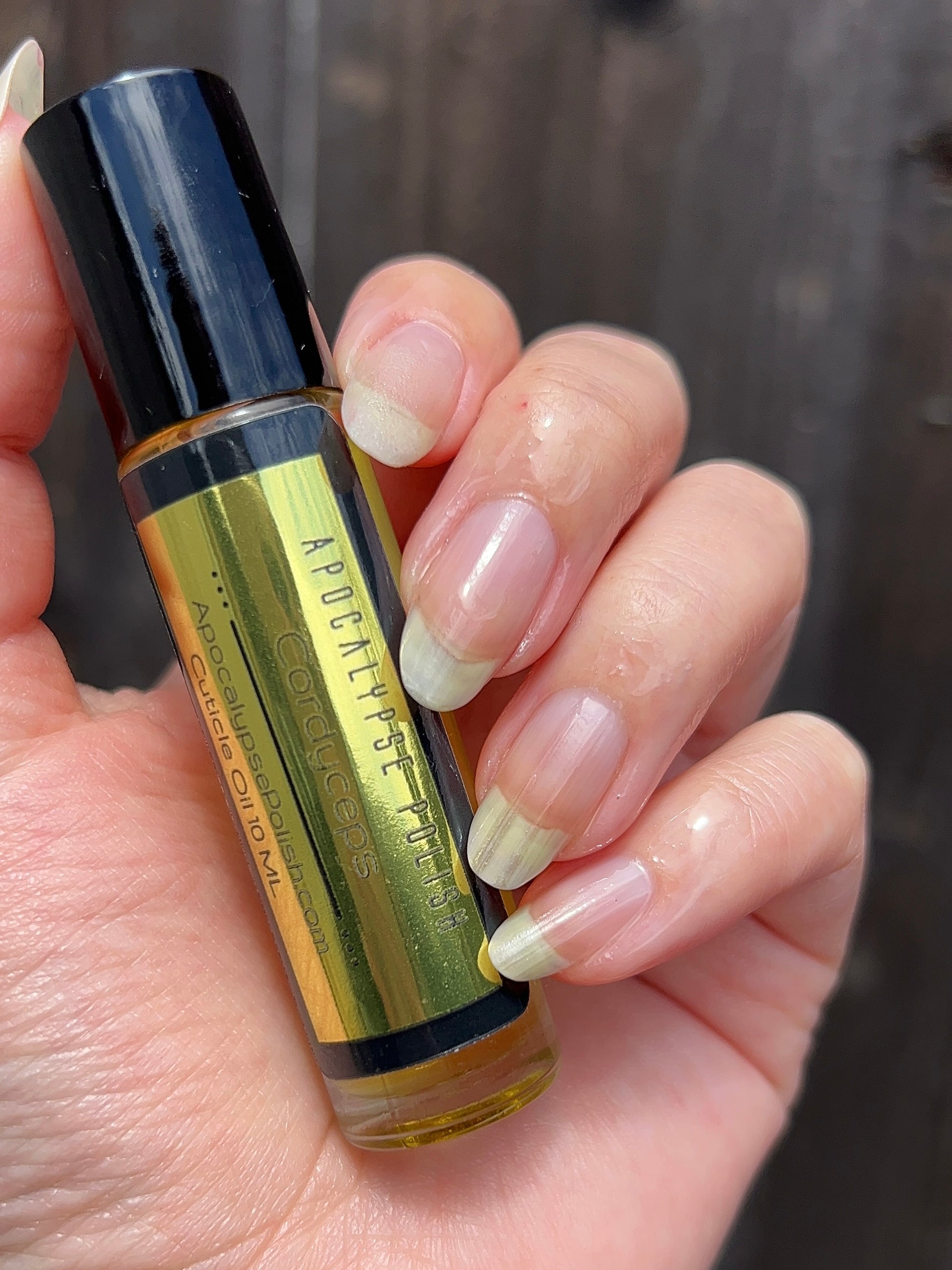 Our cuticle oils come in a 10 ml glass tube, with a stainless steel roller ball. Each cuticle oil has the base ingredients of almond oil, jojoba oil, and other additional oils and additives (such as vitamin E) that make your nails healthy, hydrated and conditioned. We offer a variety of scents, sometimes delicious, sometimes strange, always apocalyptic.