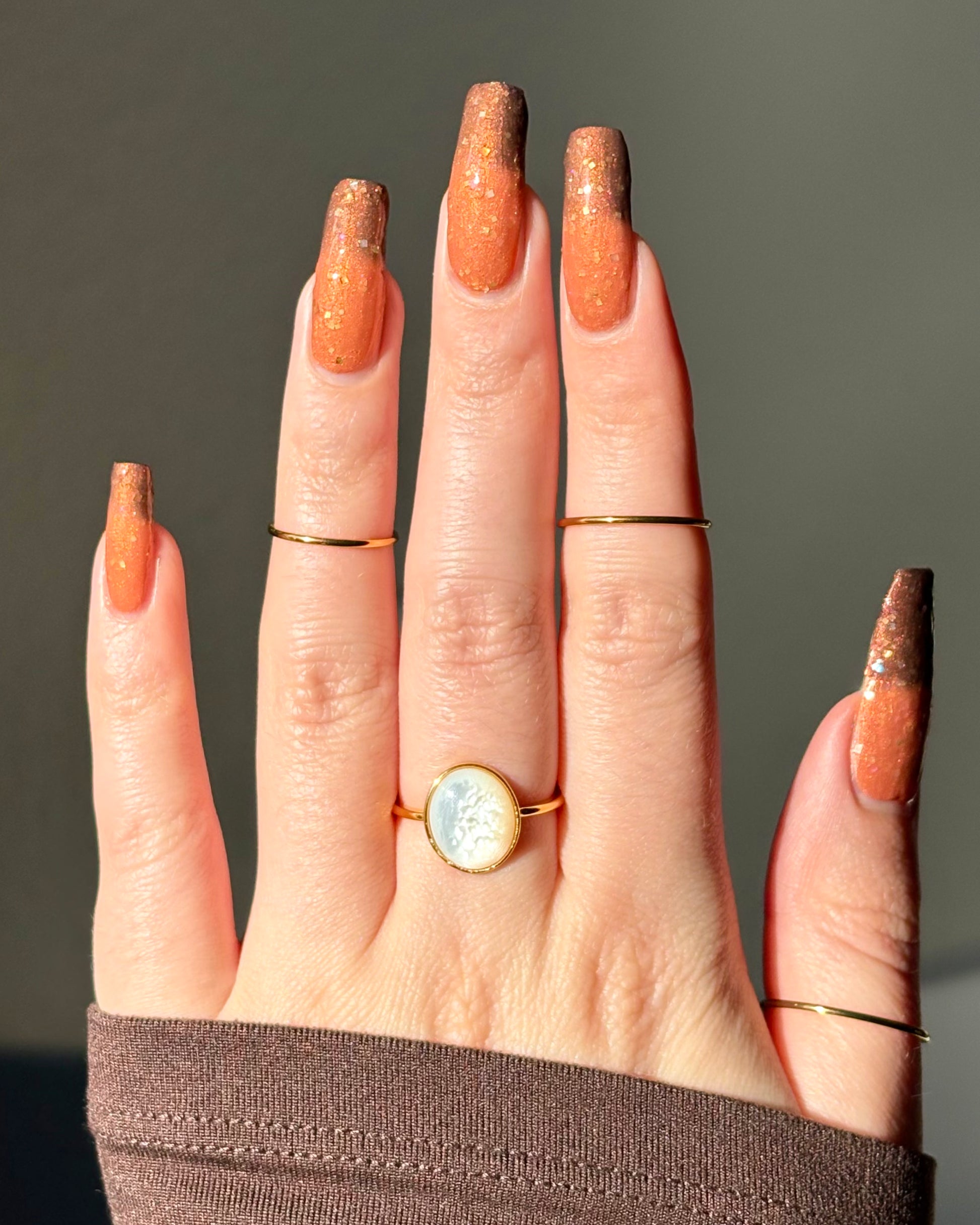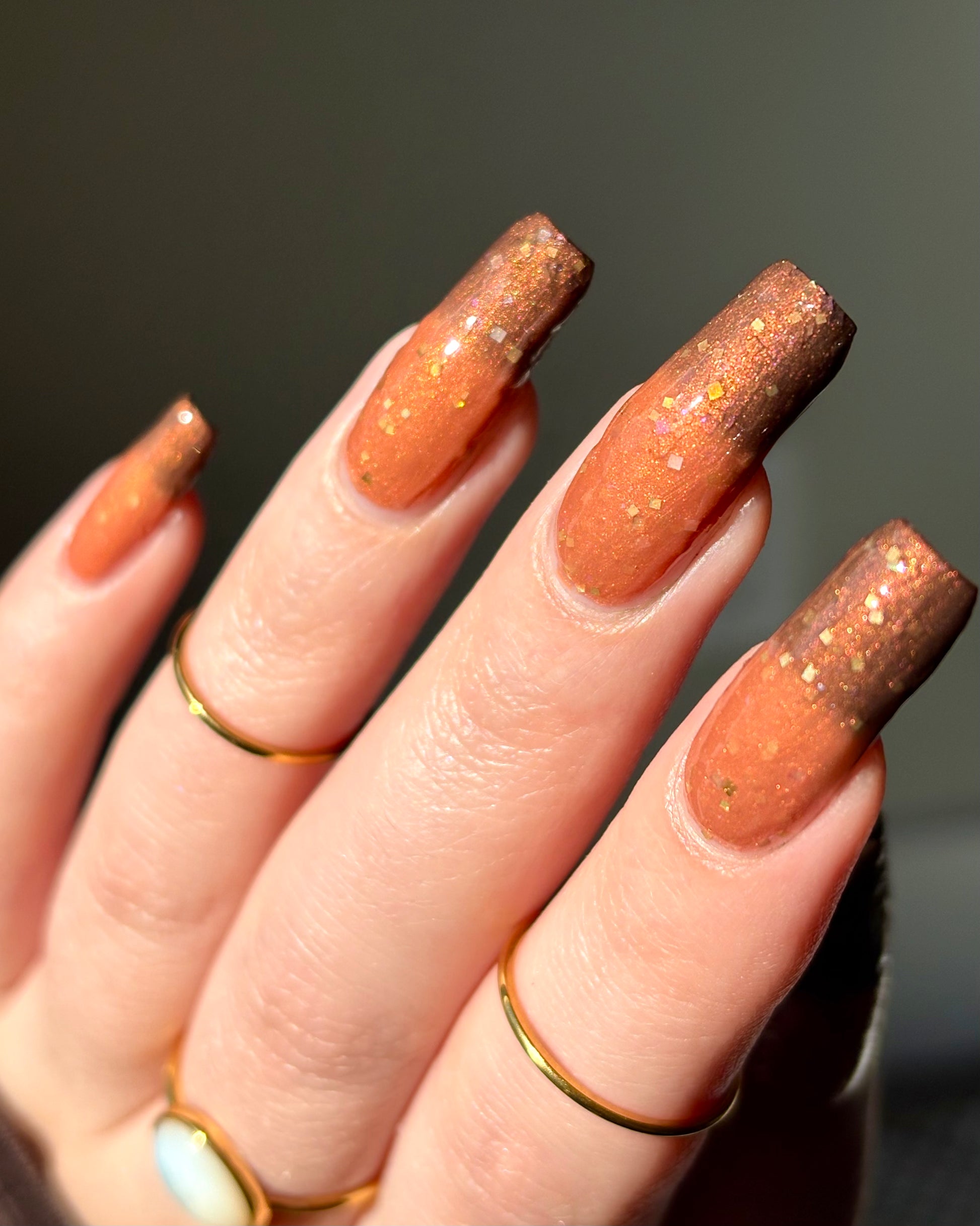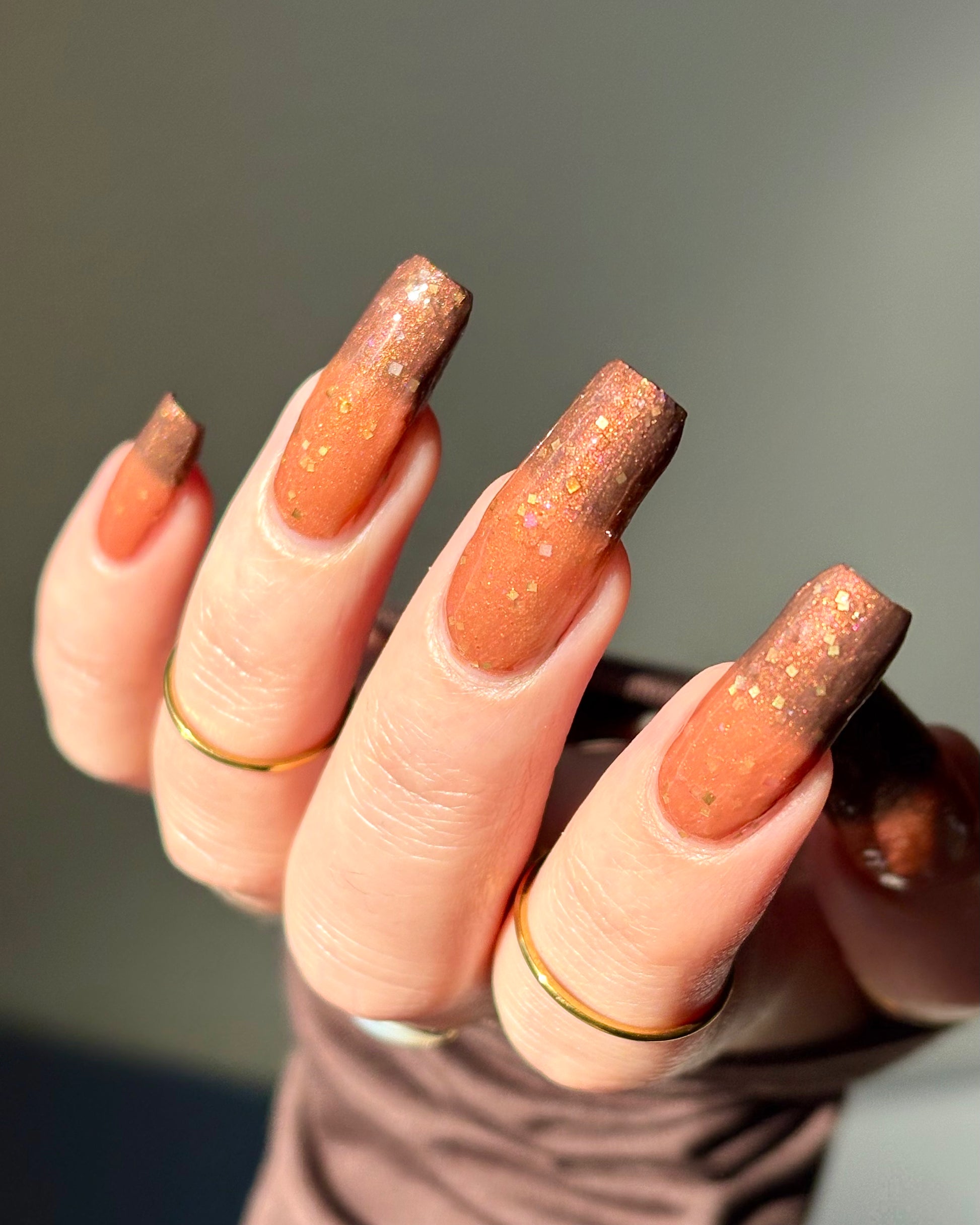 As you stroll through the fall harvest festival, or maybe sitting by the bonfire, you hold a warm, chocolate drink. What a celebration of being alive, that we can drink warm chocolate and feel the fall breeze. This thermal shifts from a caramel orange/brown (warm) to chocolate brown (cold) with copper shimmer and marshmallows of square glitters in white, rainbow, holographic and gold.