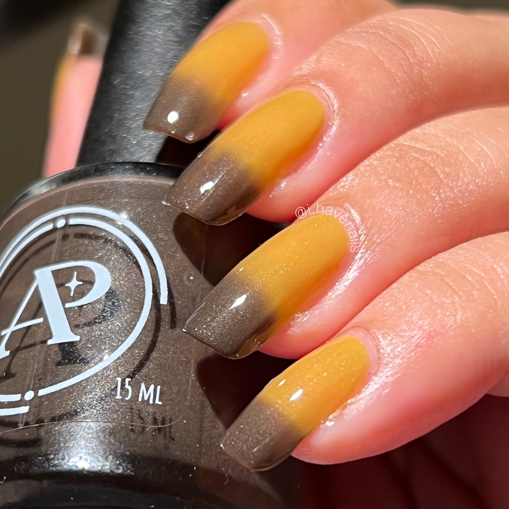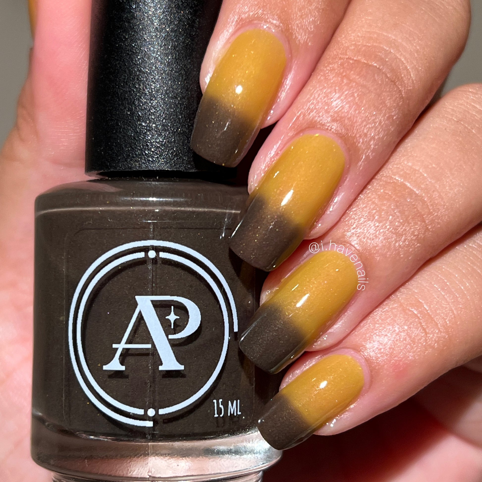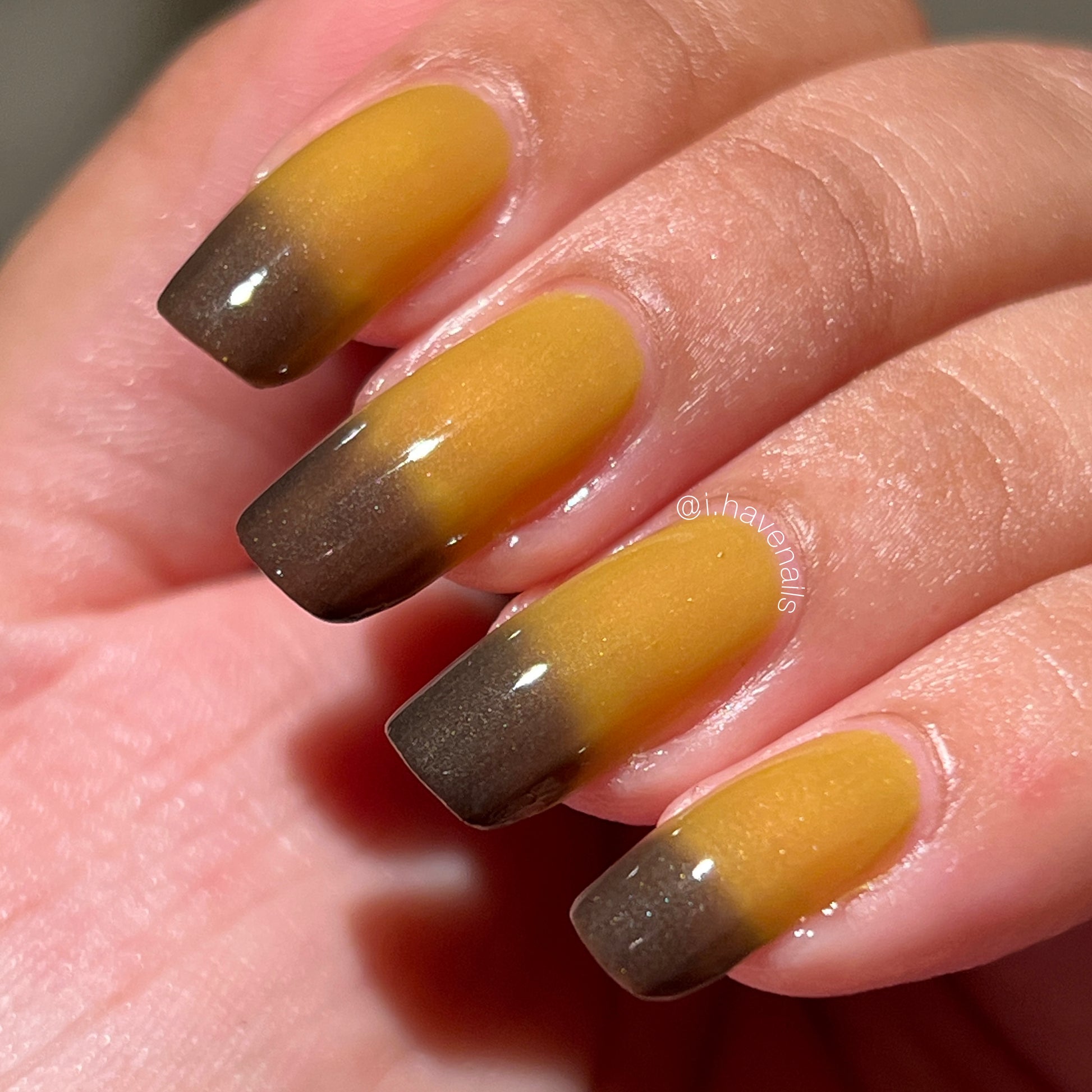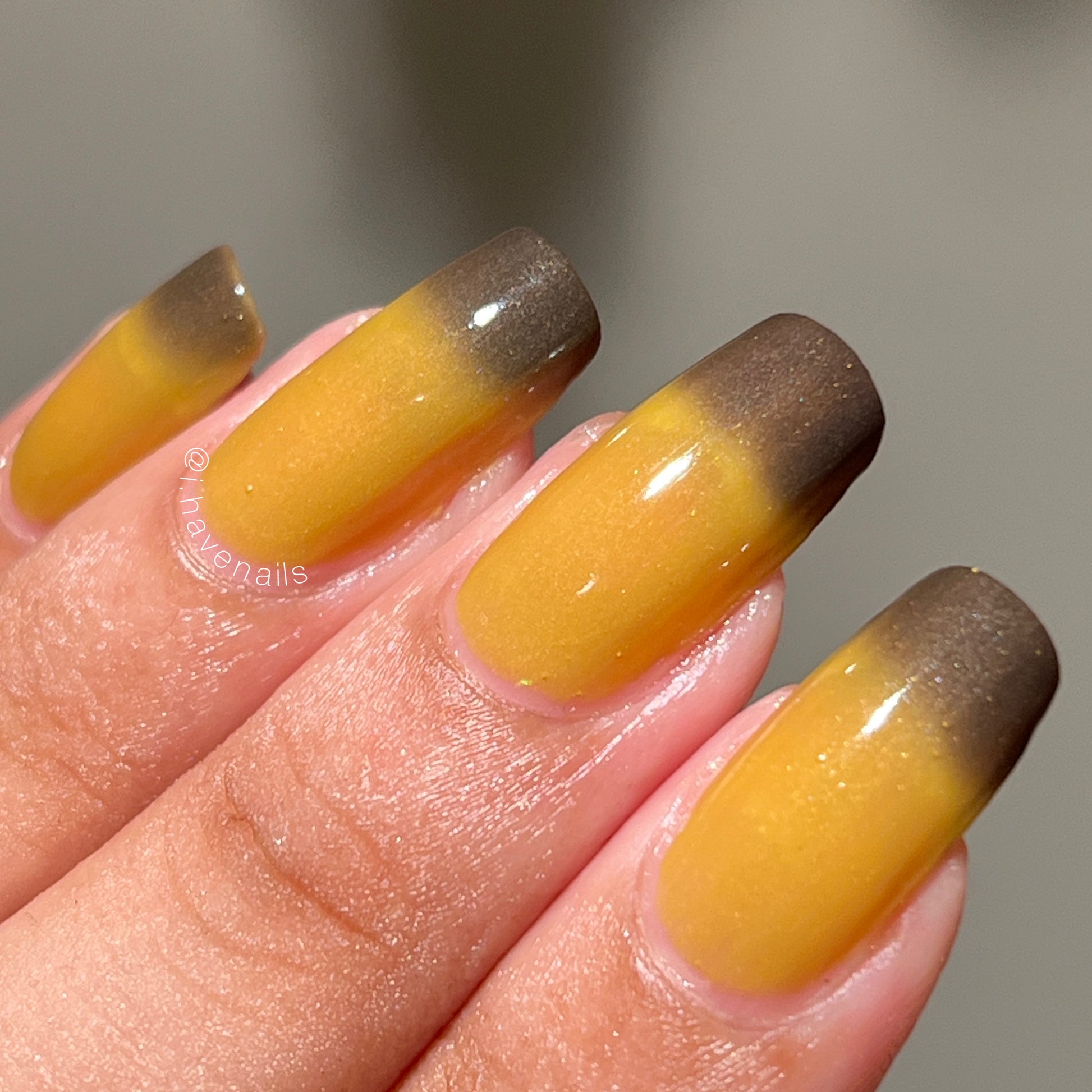 This is a mustard-y, almost green yellow (warm) to black thermal (cold), with no other added flakes or shimmers. It is the "naked" version of BBB, and is loosely inspired by the meme from Arrested Development. This banana does in fact, cost $10.