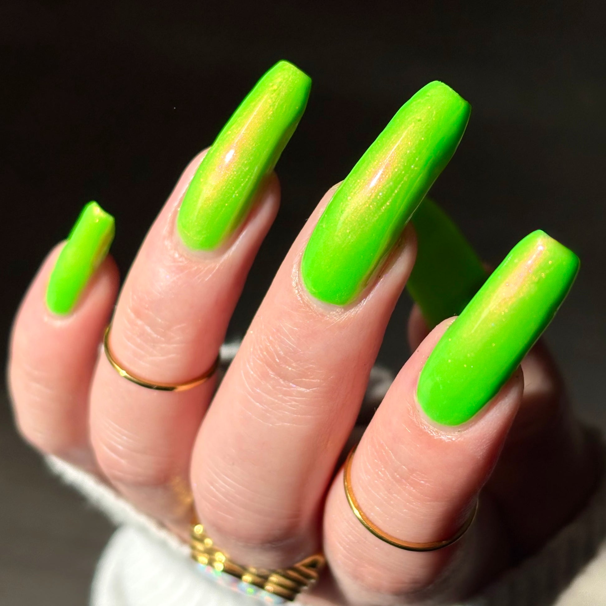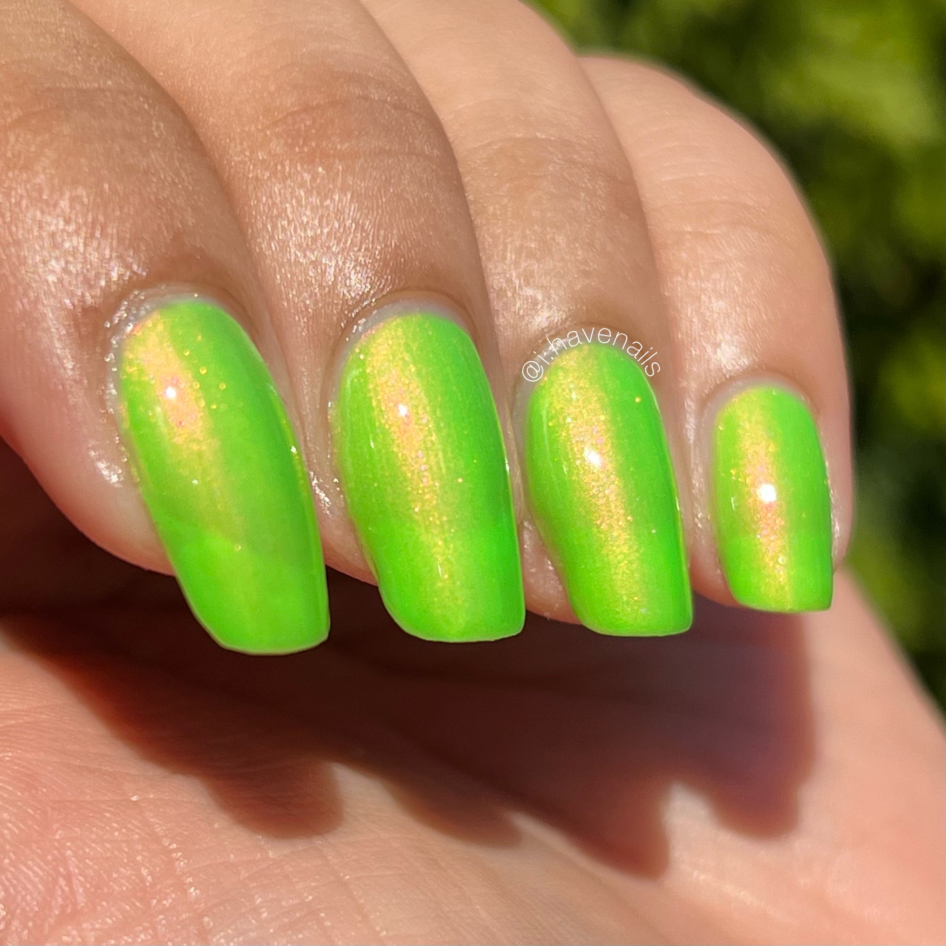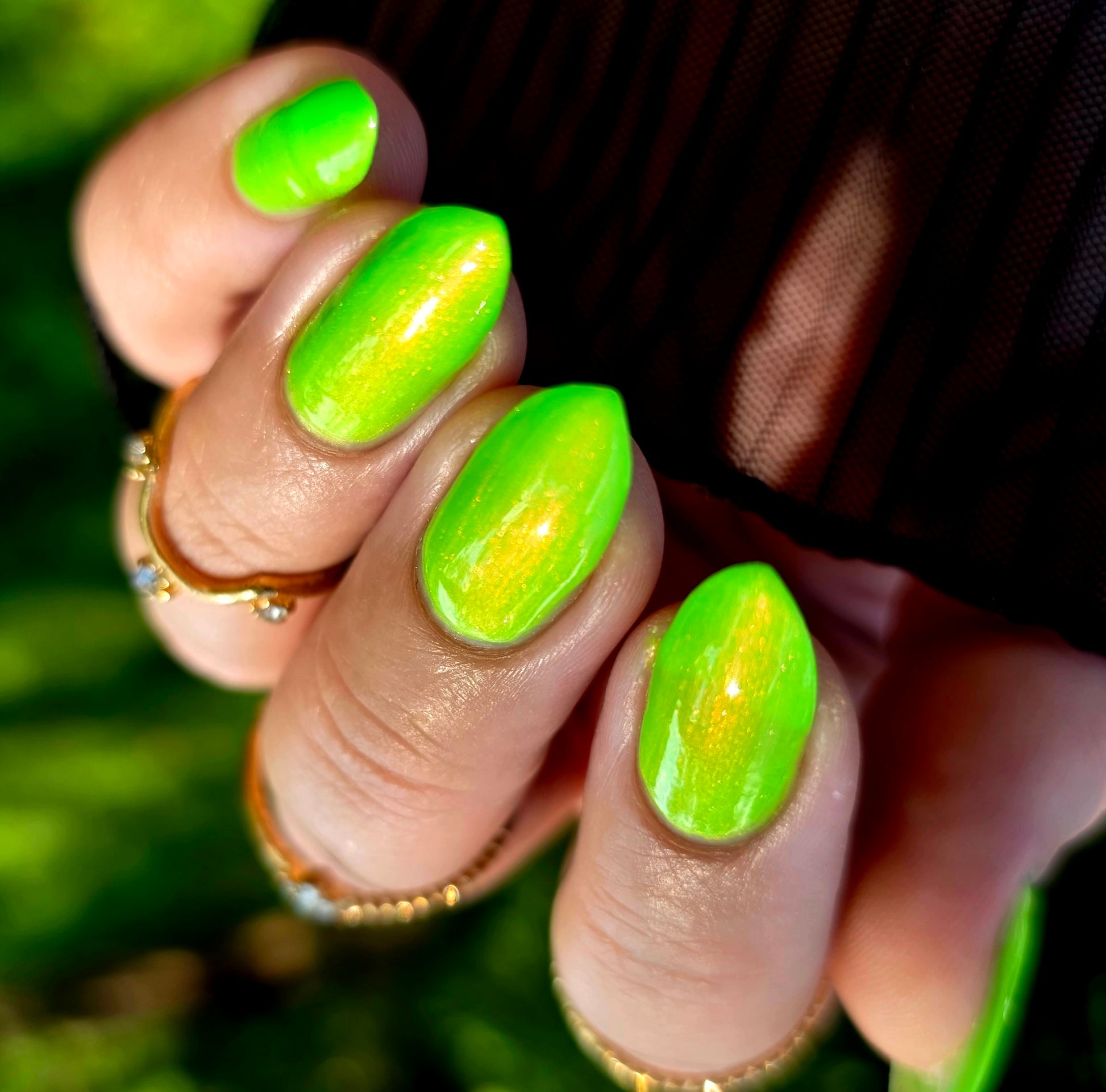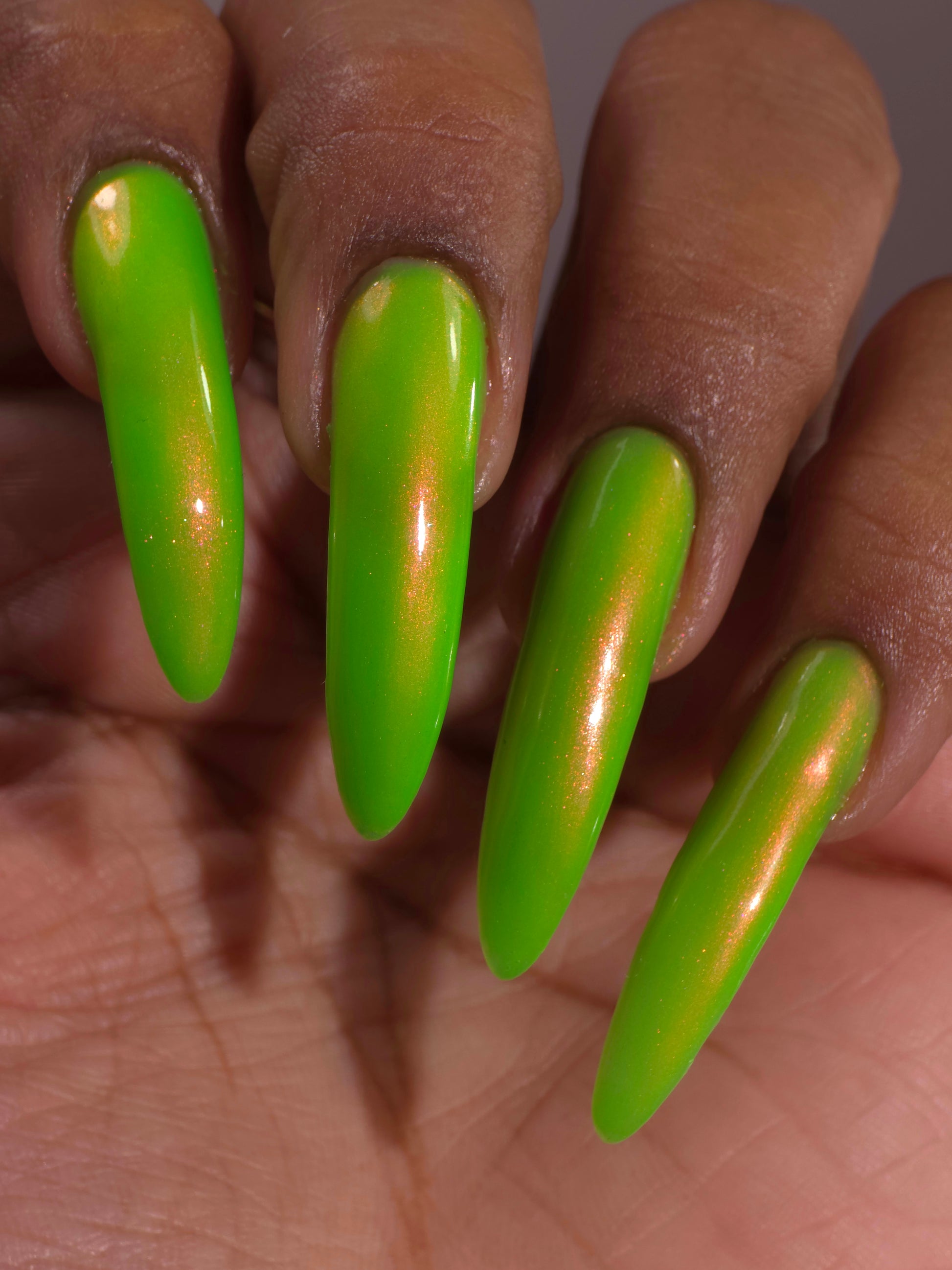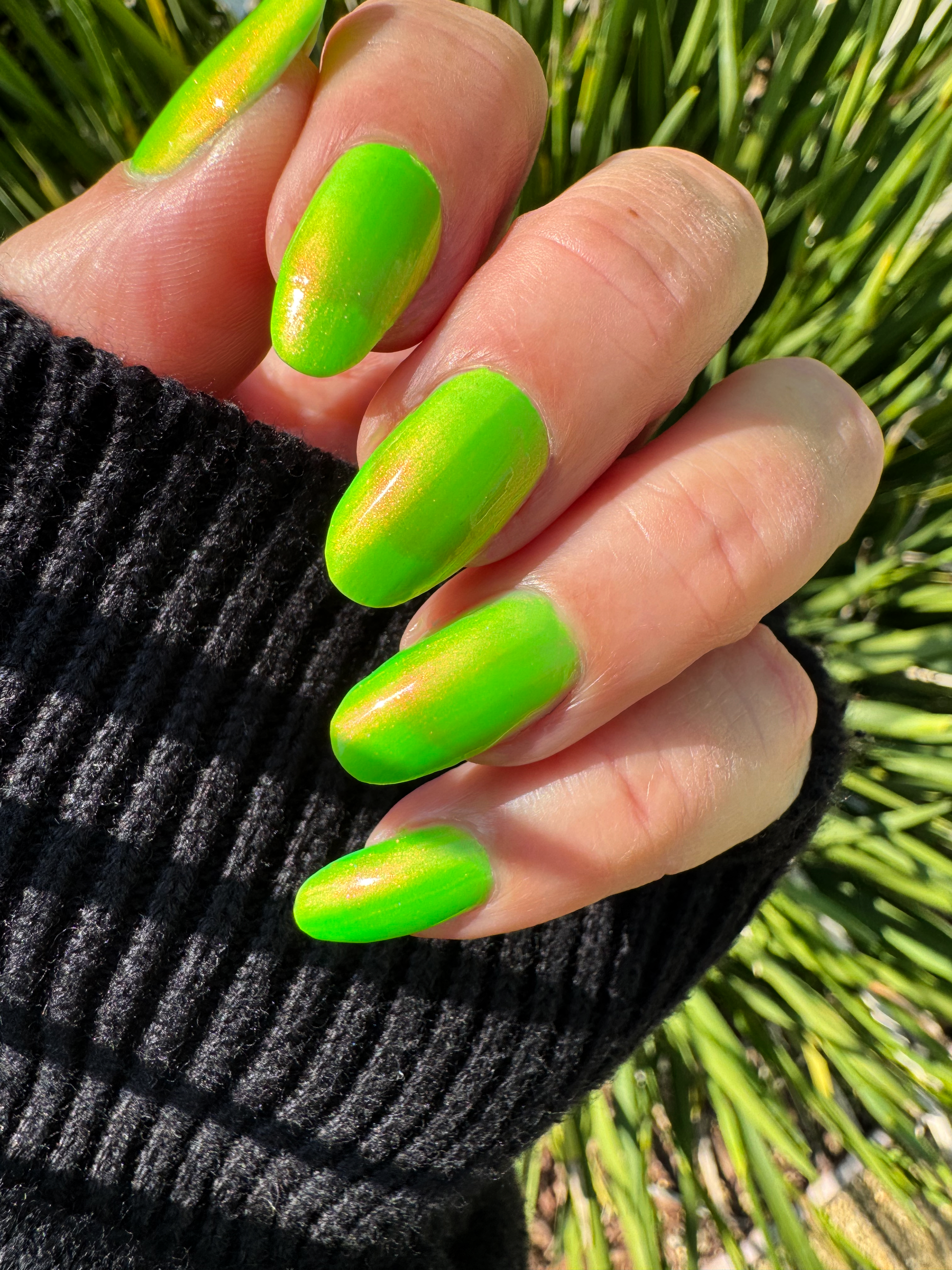 1. This shade is inspired by our favorite joke from the “No Pun Intended” joke book. This neon green has soft red to orange aurora shimmer that shifts to gold at extremes.