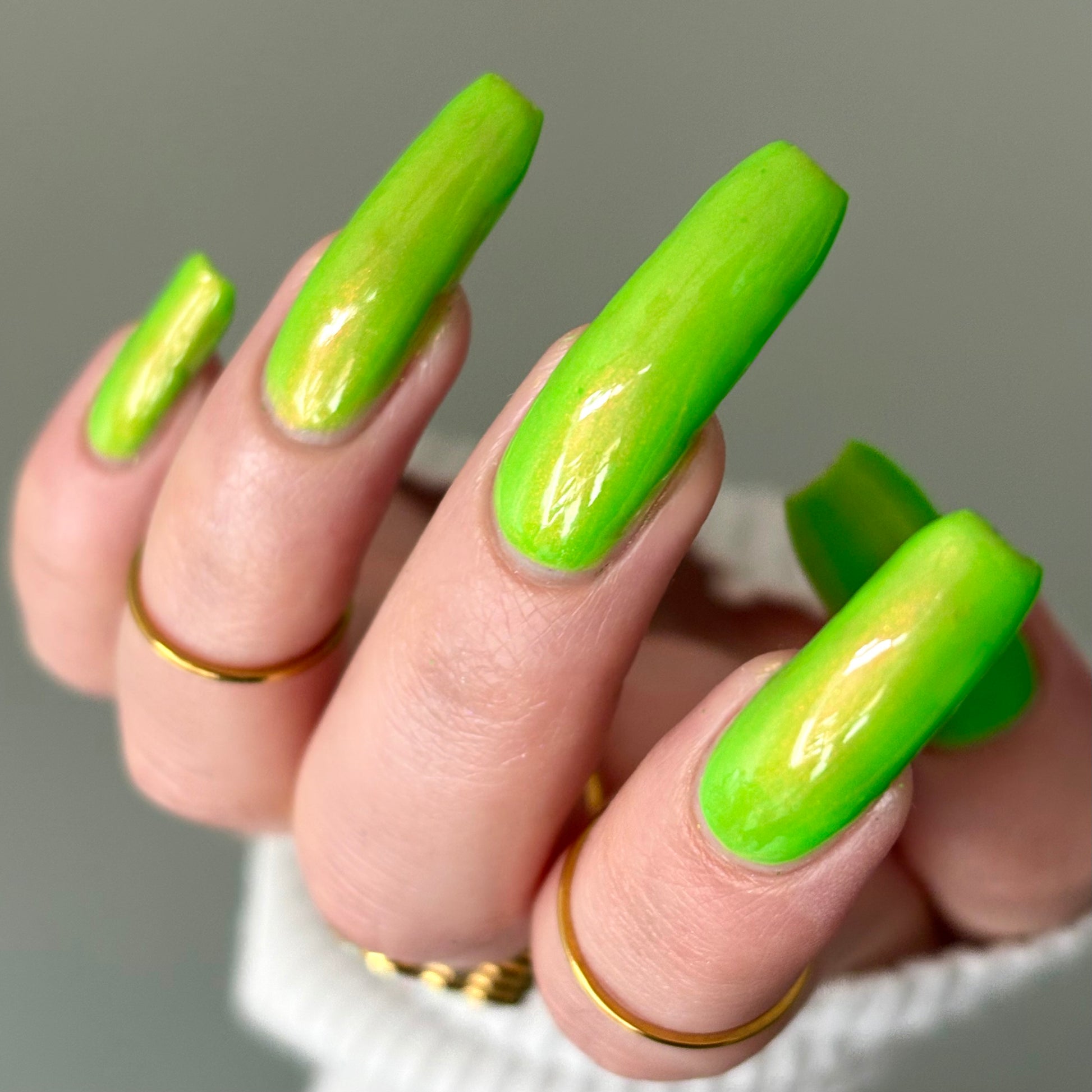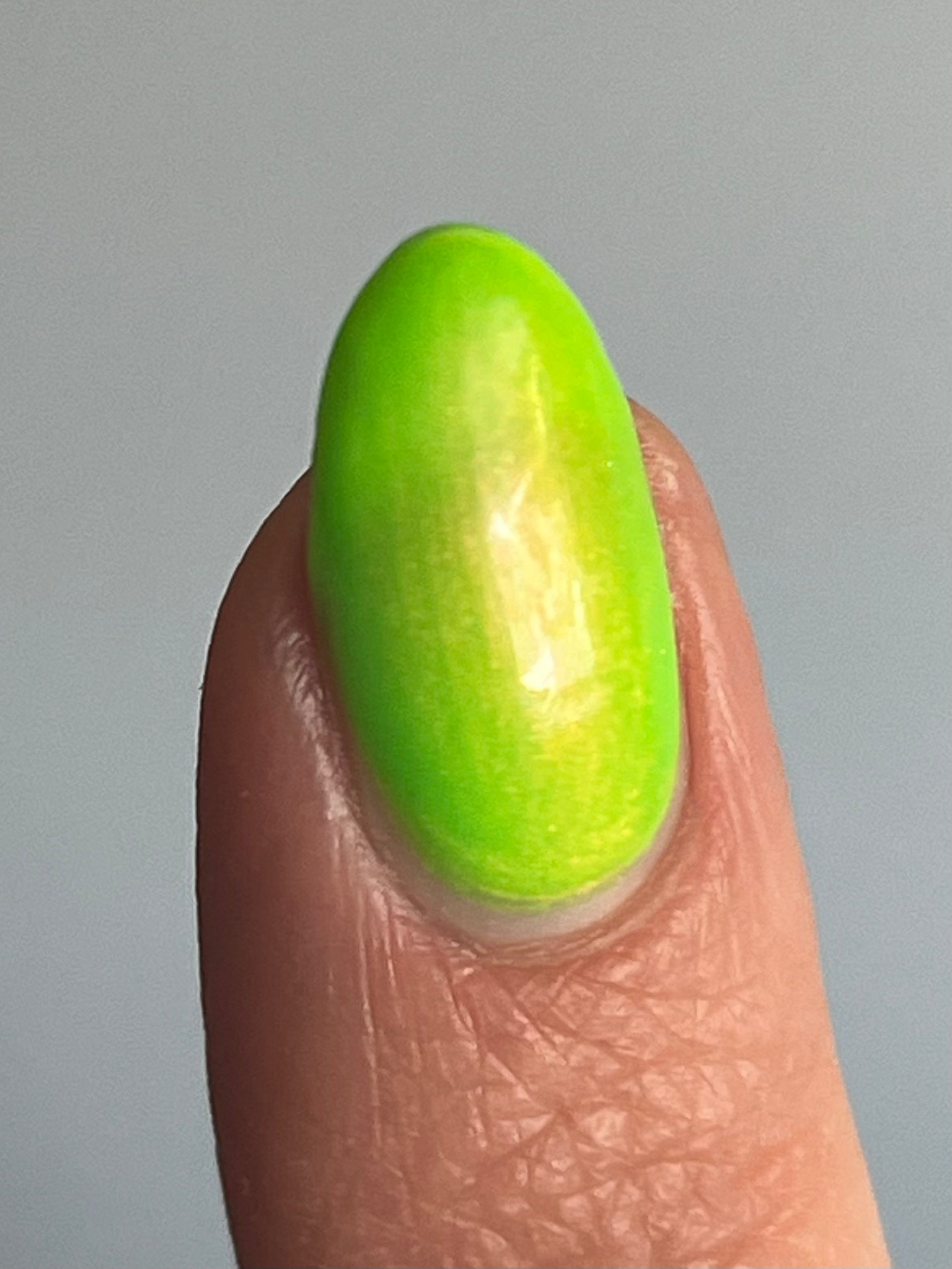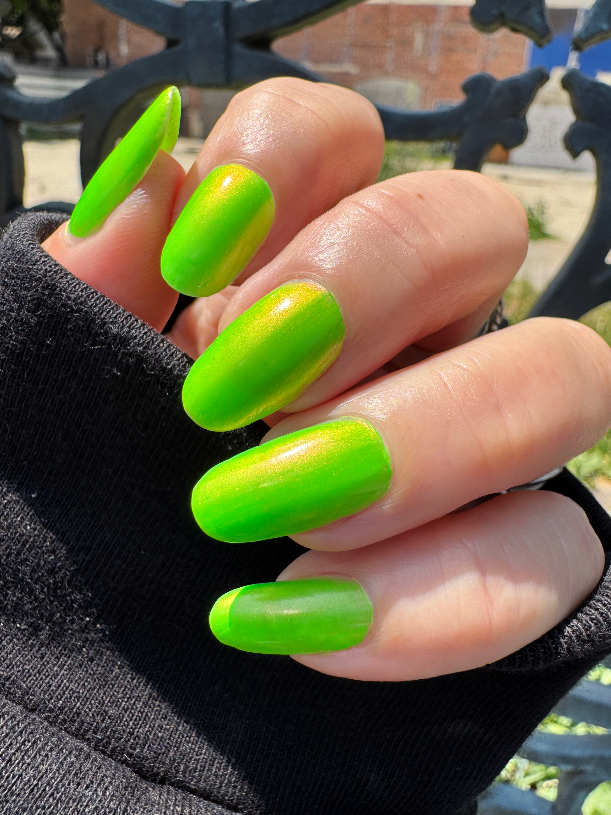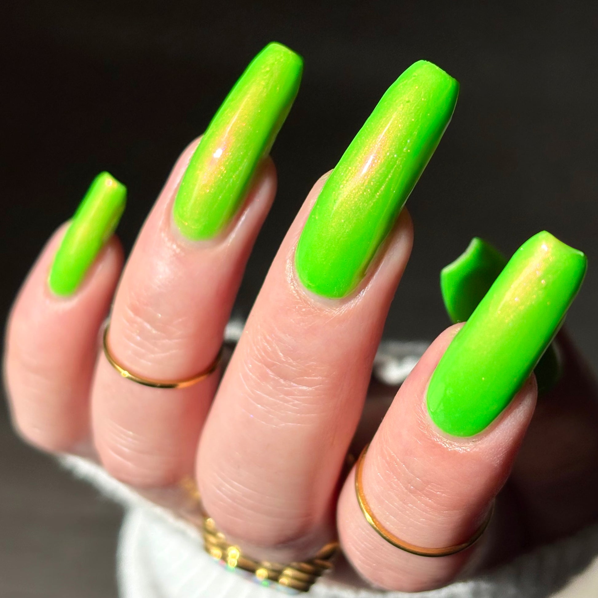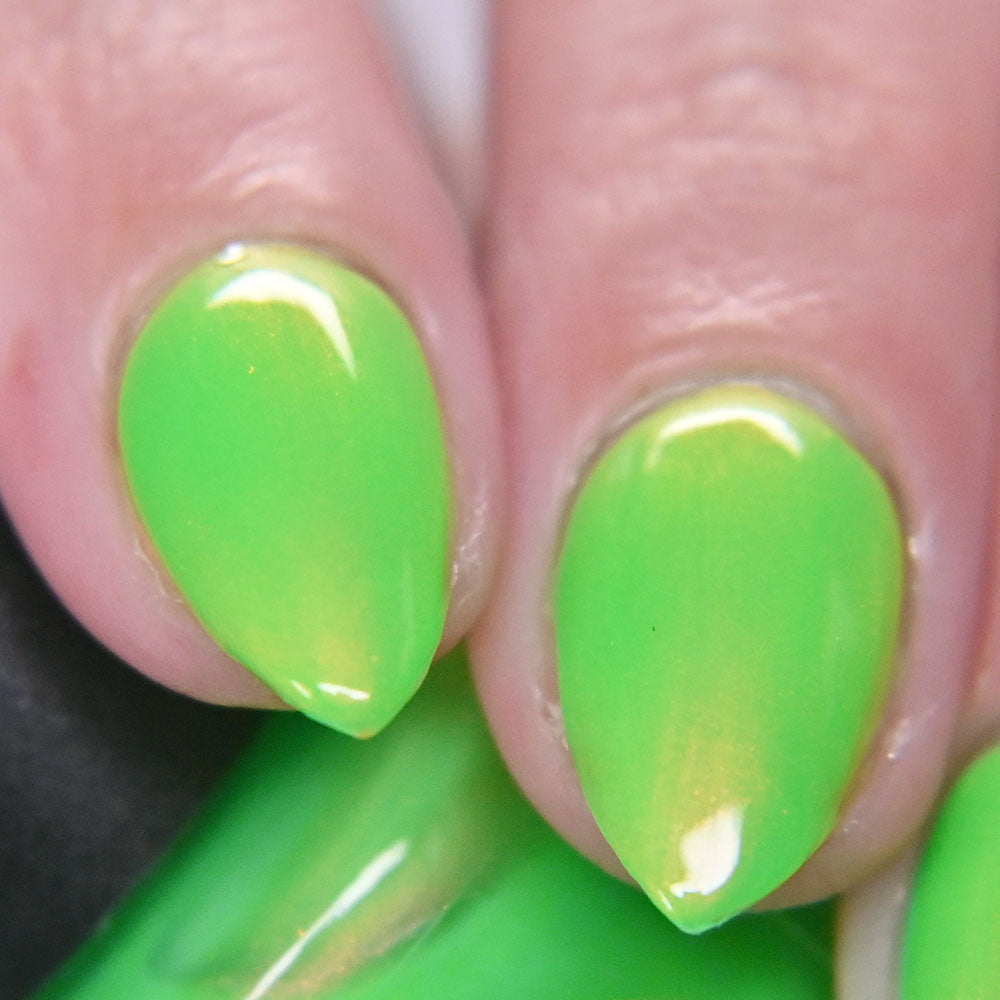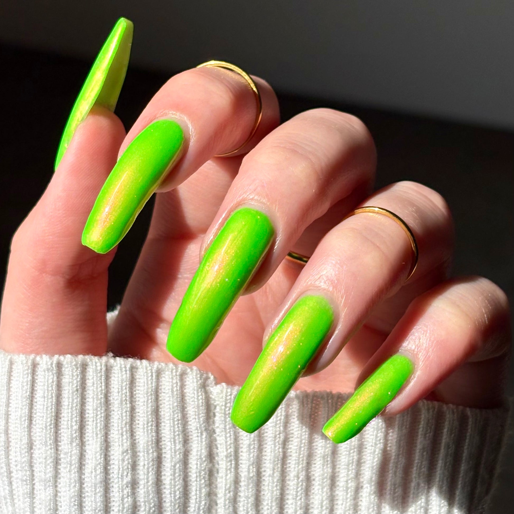 1. This shade is inspired by our favorite joke from the “No Pun Intended” joke book. This neon green has soft red to orange aurora shimmer that shifts to gold at extremes.