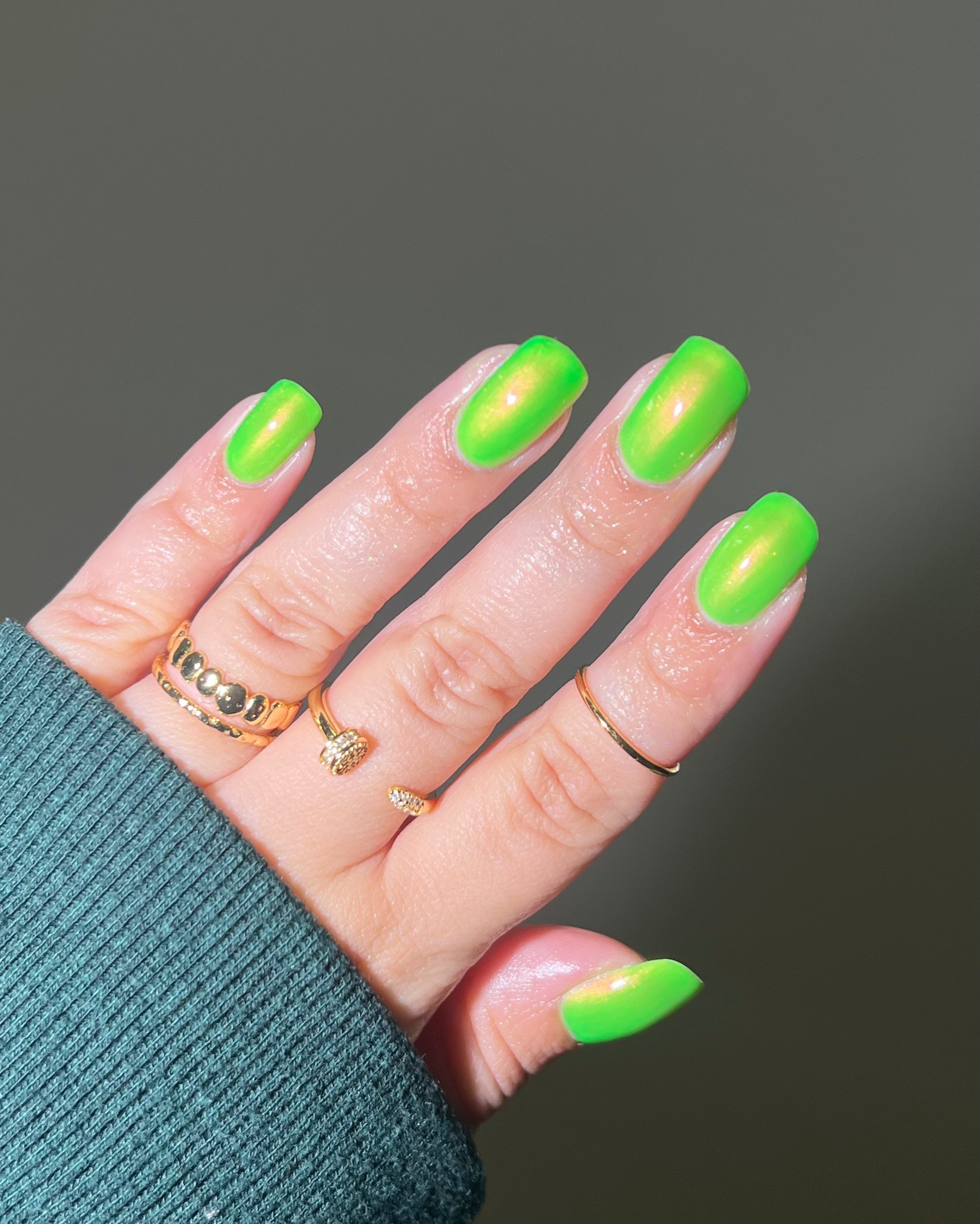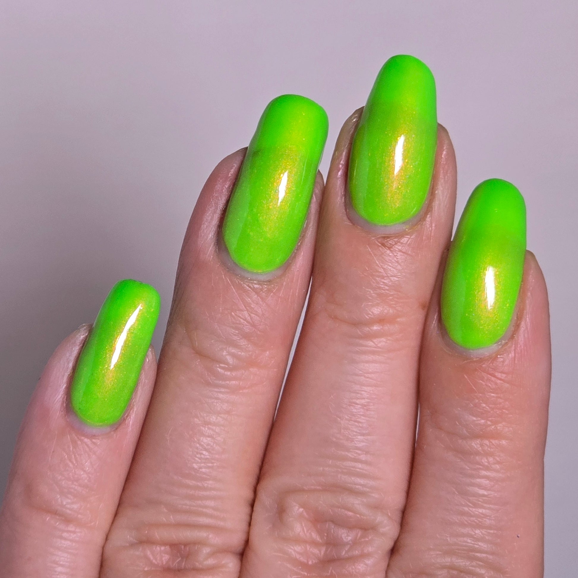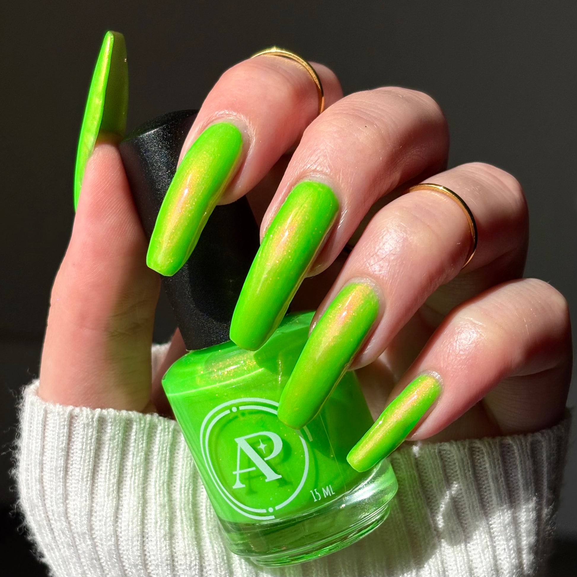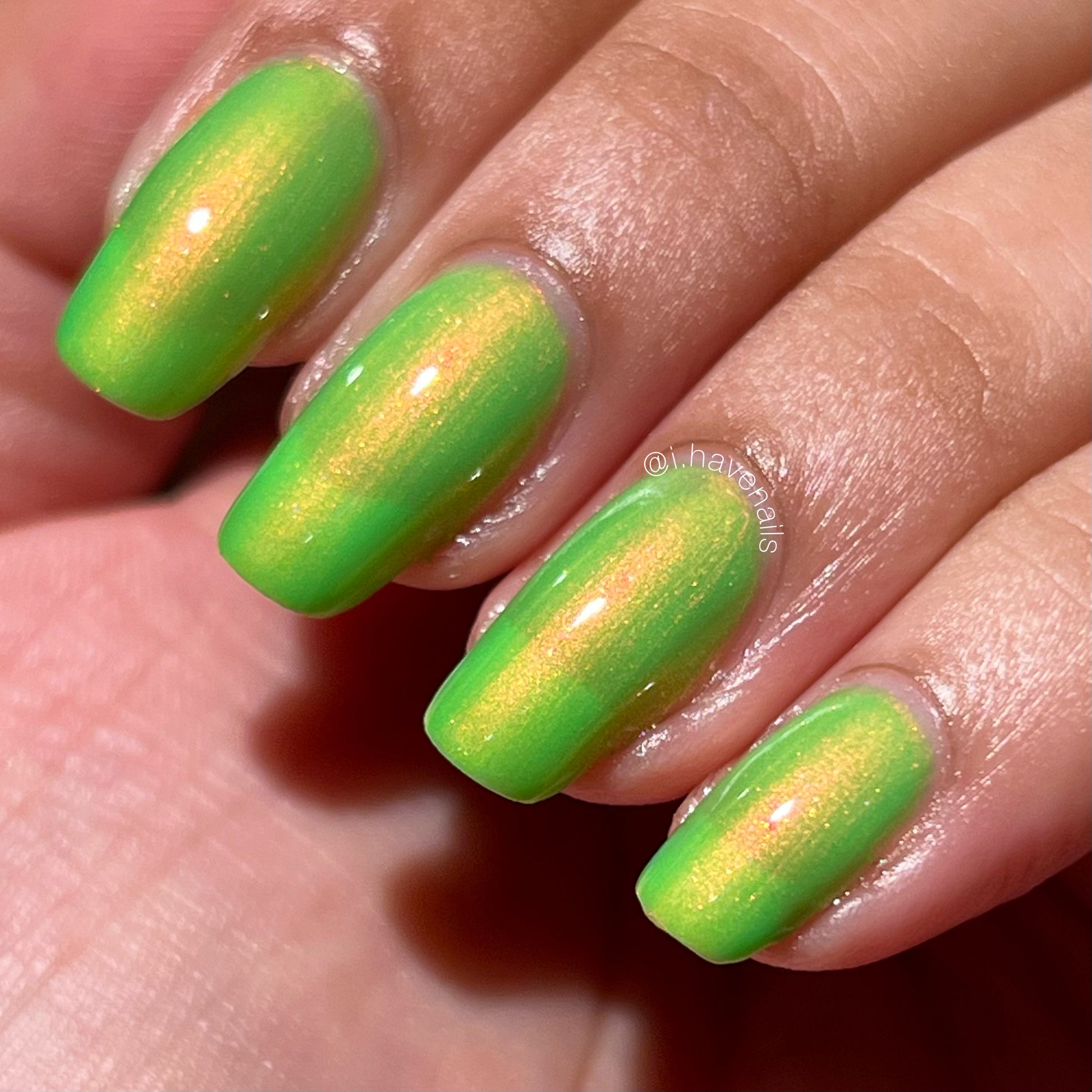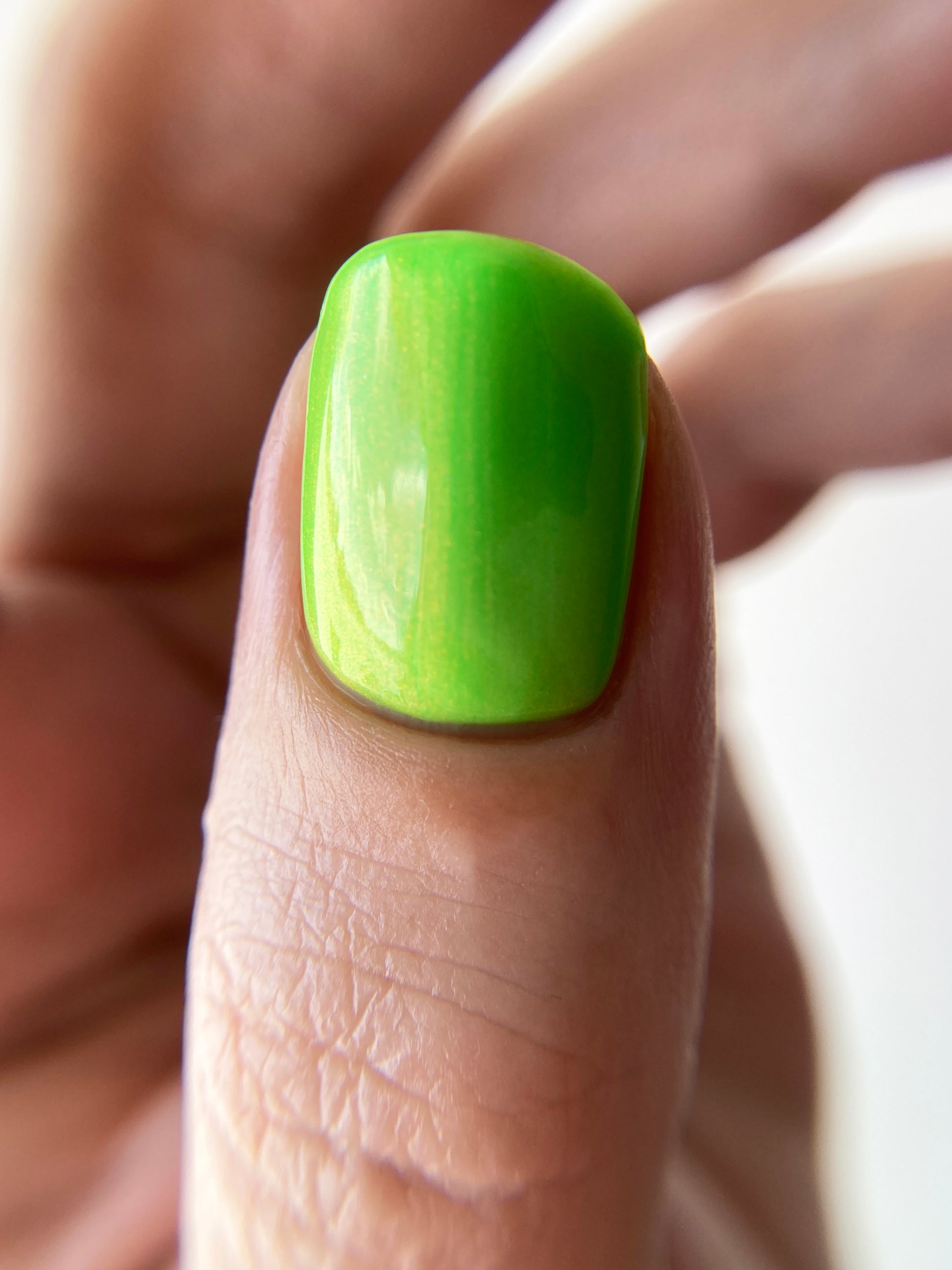 1. This shade is inspired by our favorite joke from the “No Pun Intended” joke book. This neon green has soft red to orange aurora shimmer that shifts to gold at extremes.