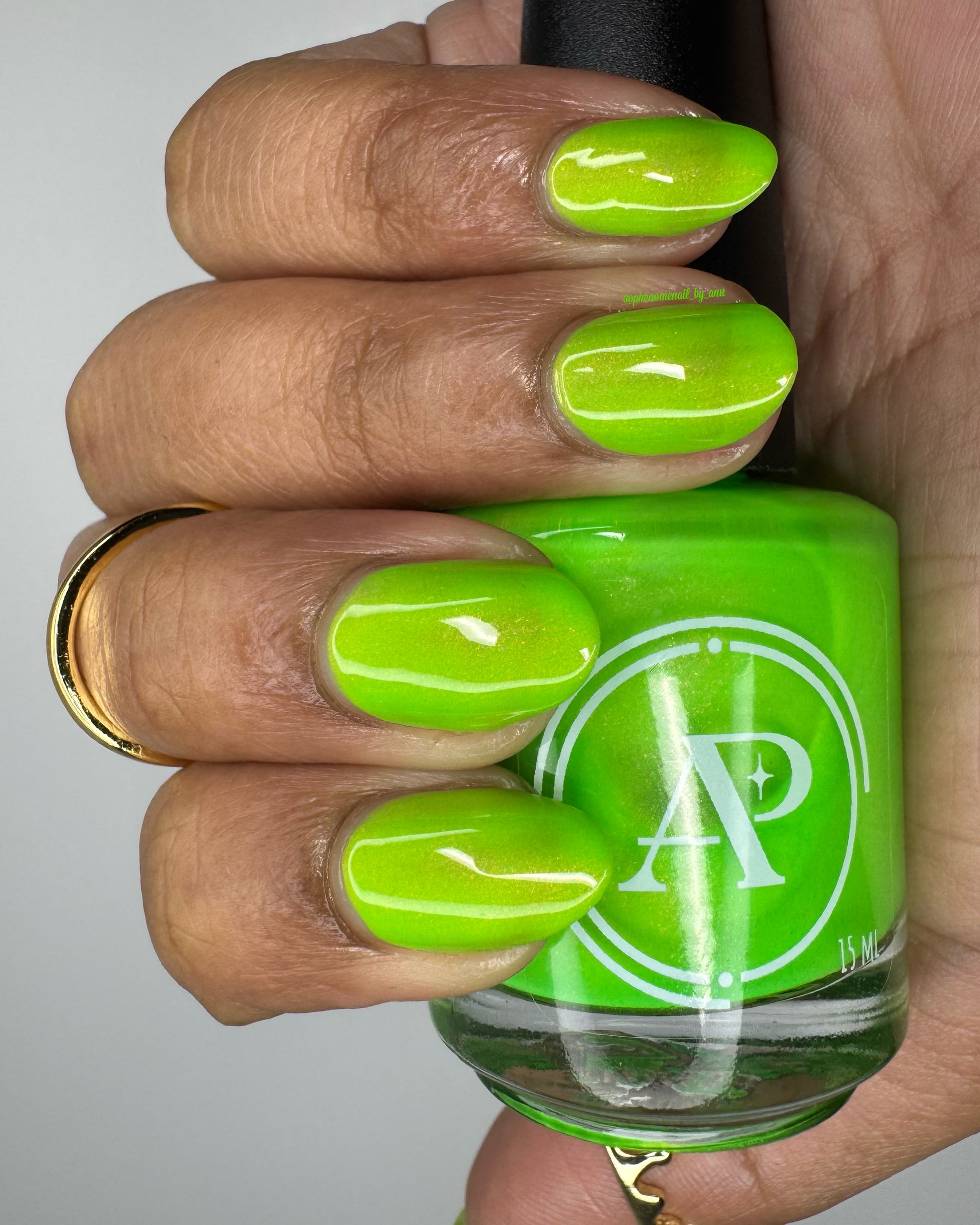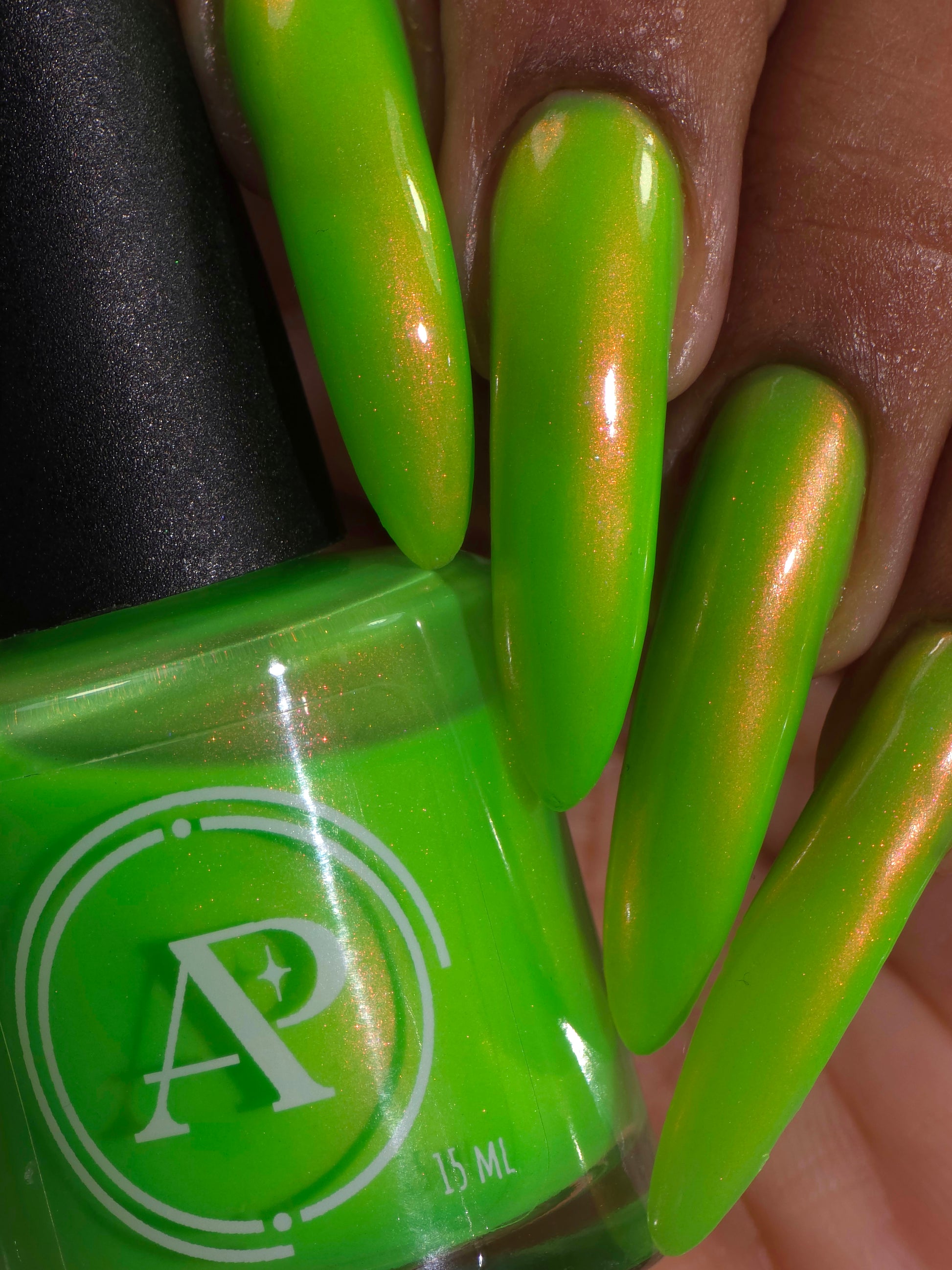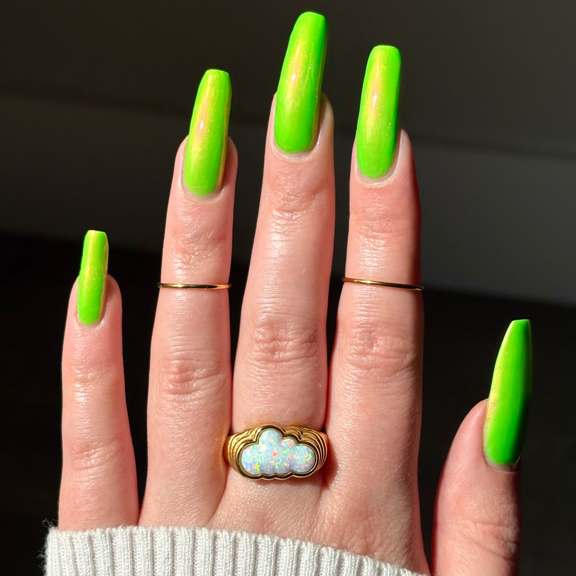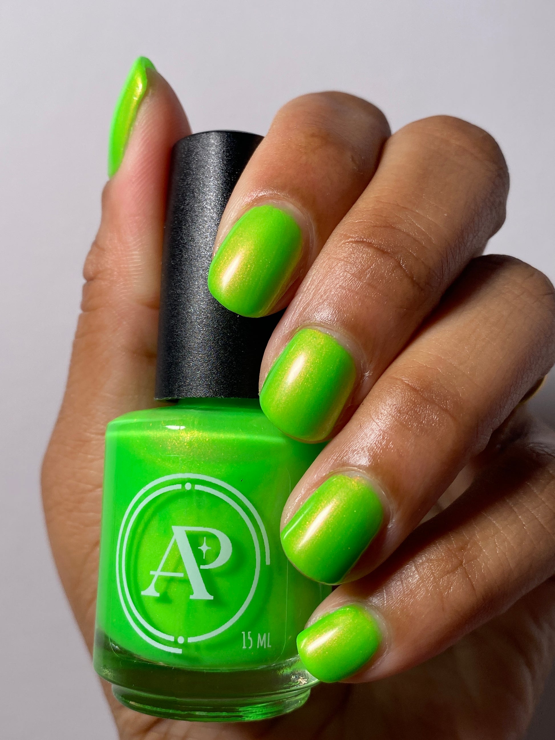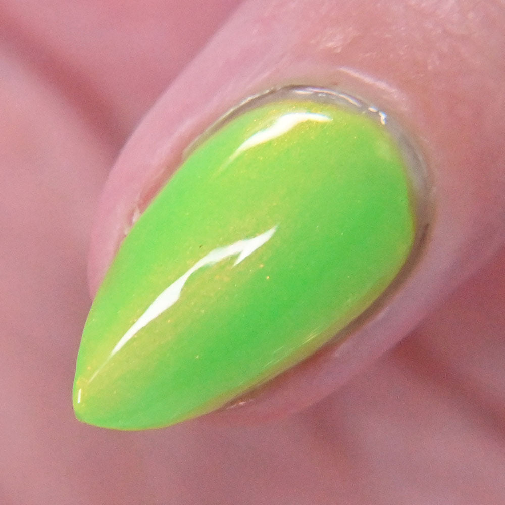 1. This shade is inspired by our favorite joke from the “No Pun Intended” joke book. This neon green has soft red to orange aurora shimmer that shifts to gold at extremes.