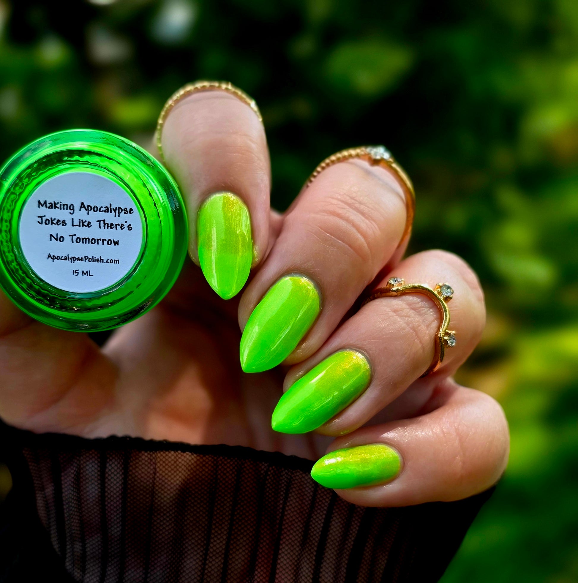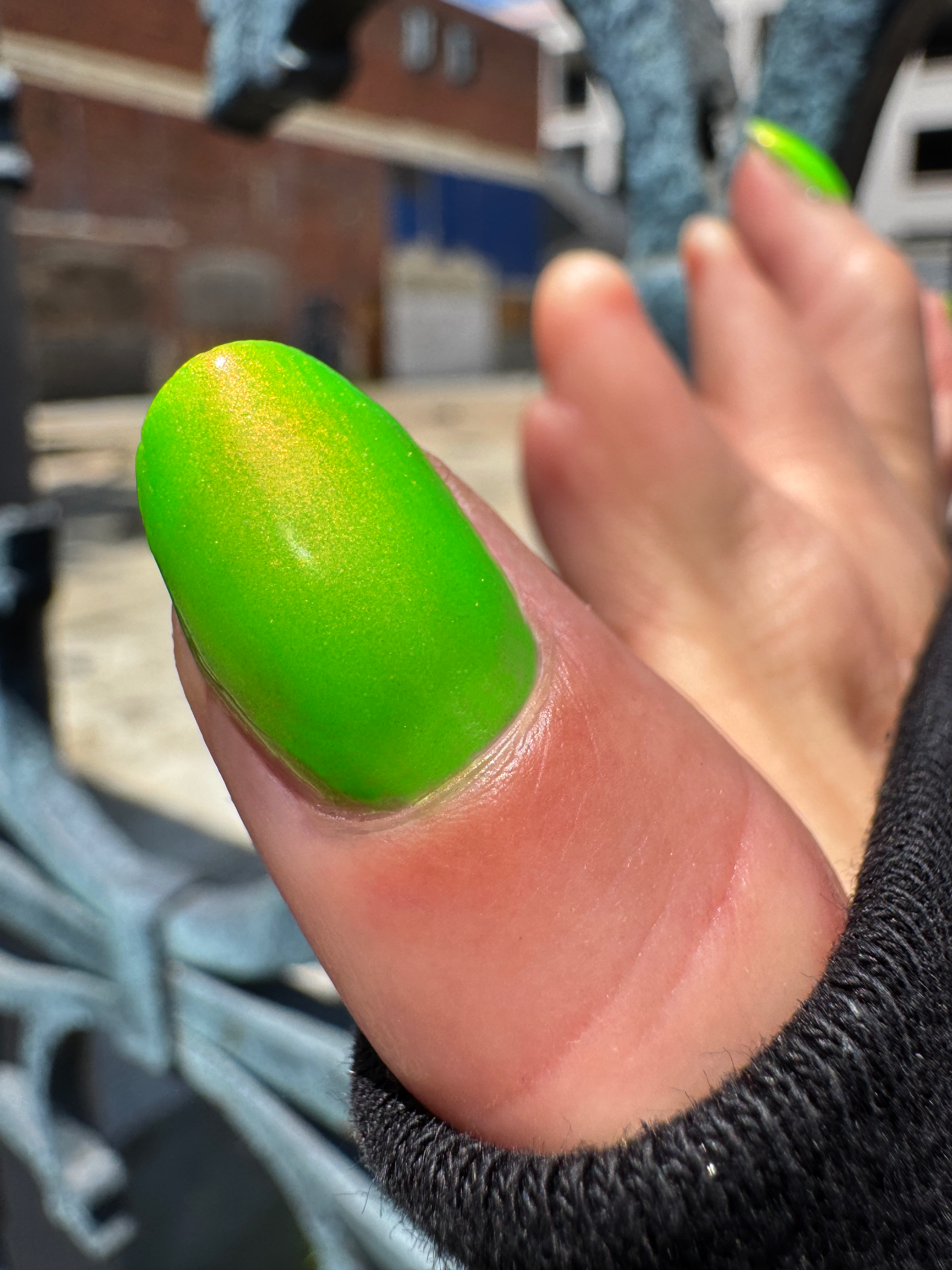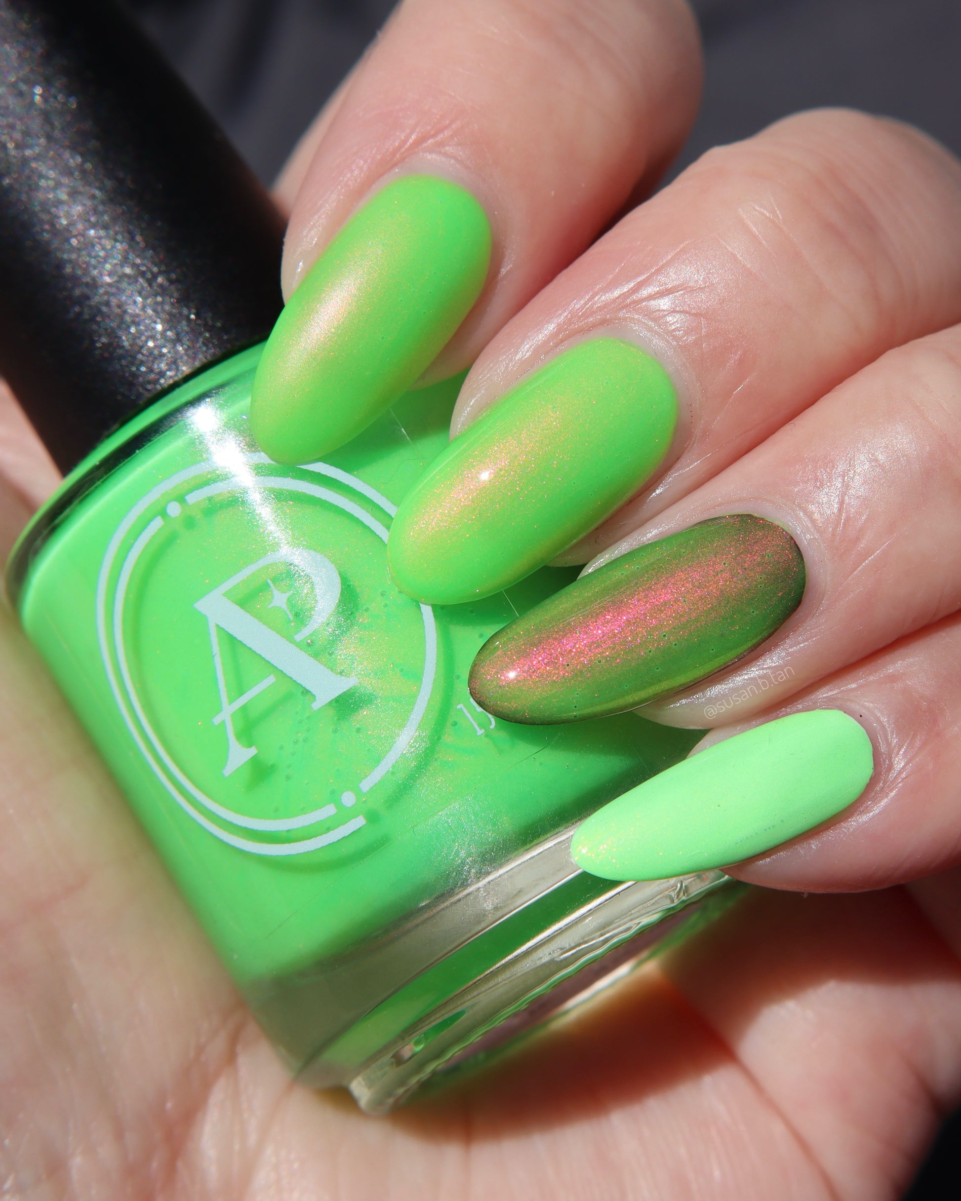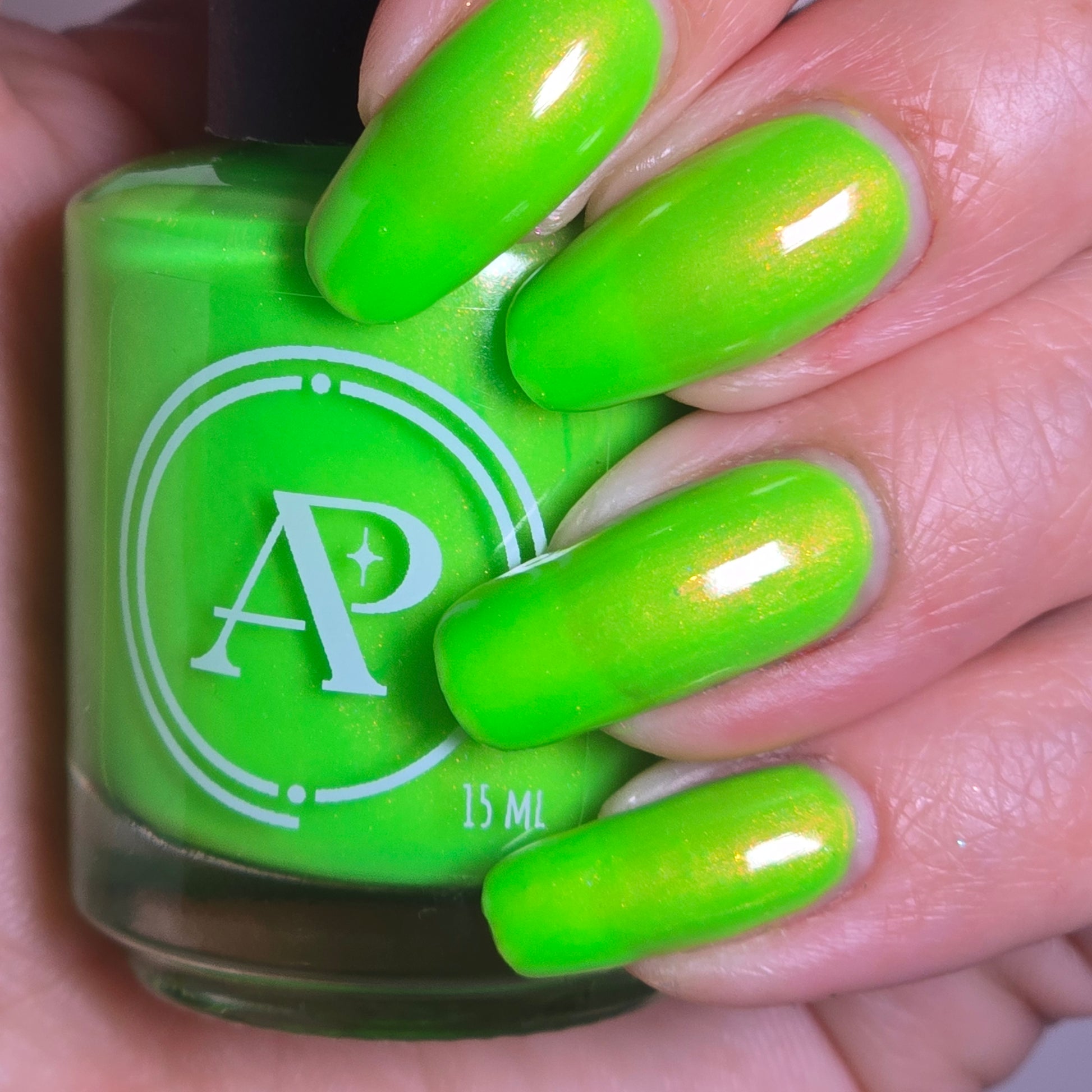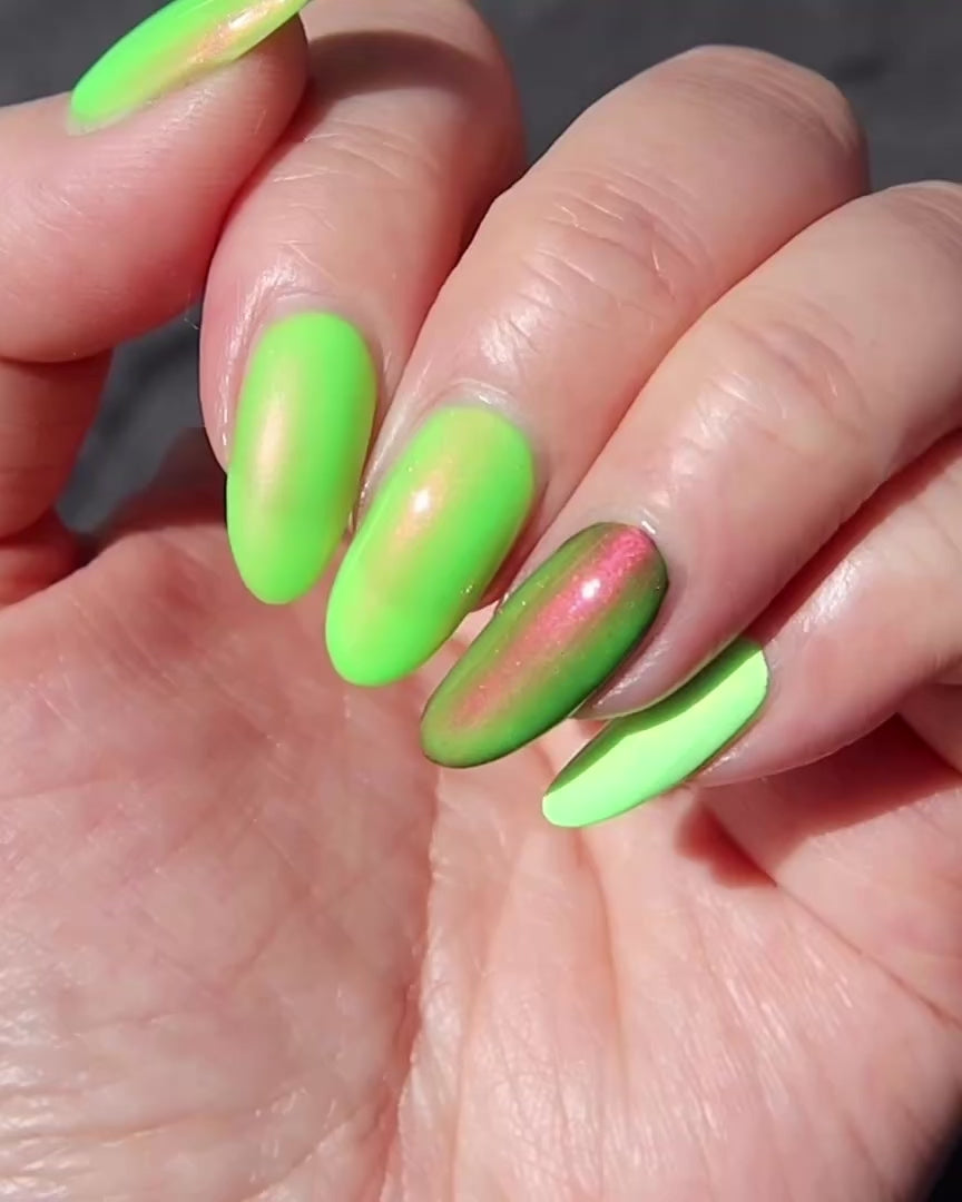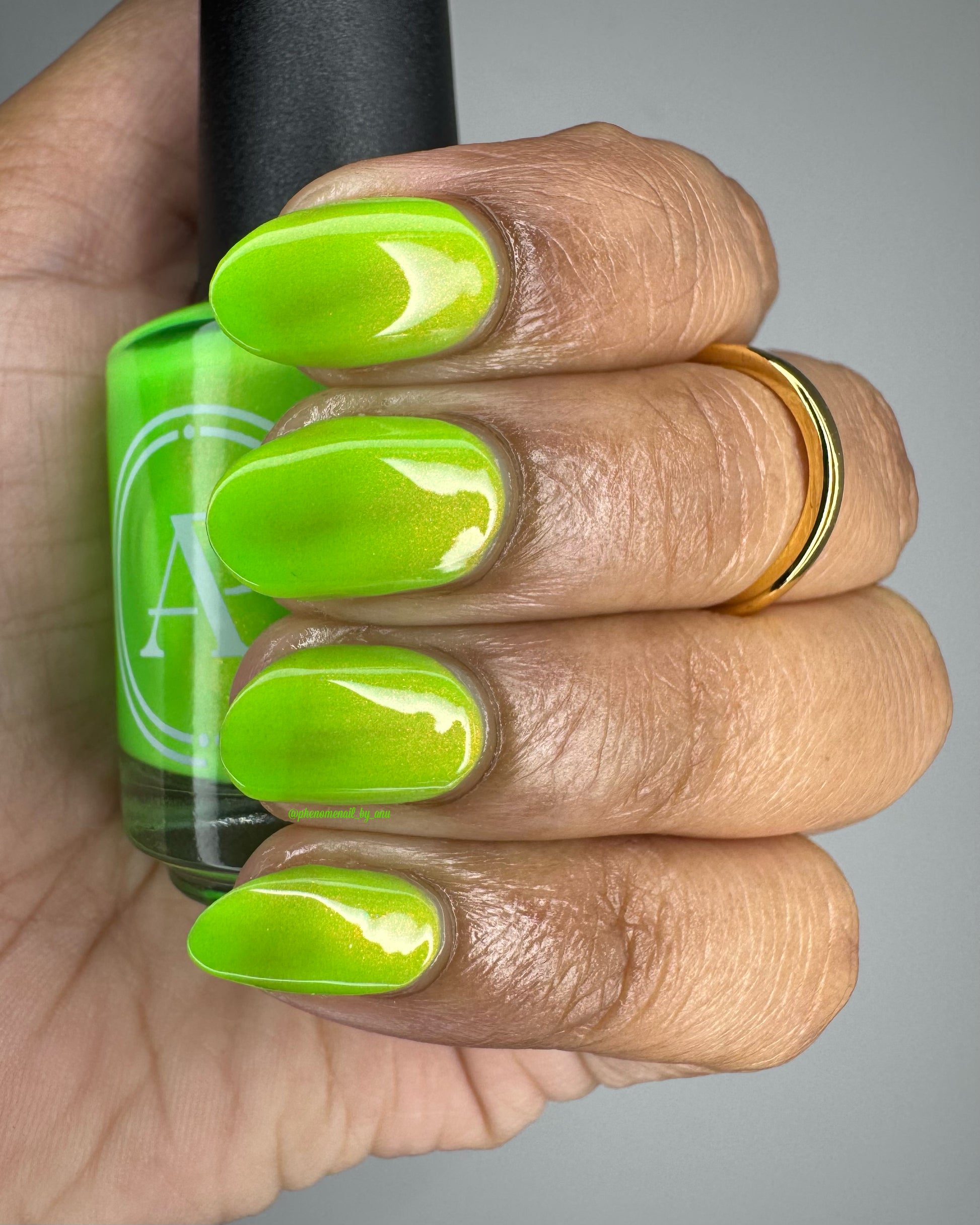 1. This shade is inspired by our favorite joke from the “No Pun Intended” joke book. This neon green has soft red to orange aurora shimmer that shifts to gold at extremes.