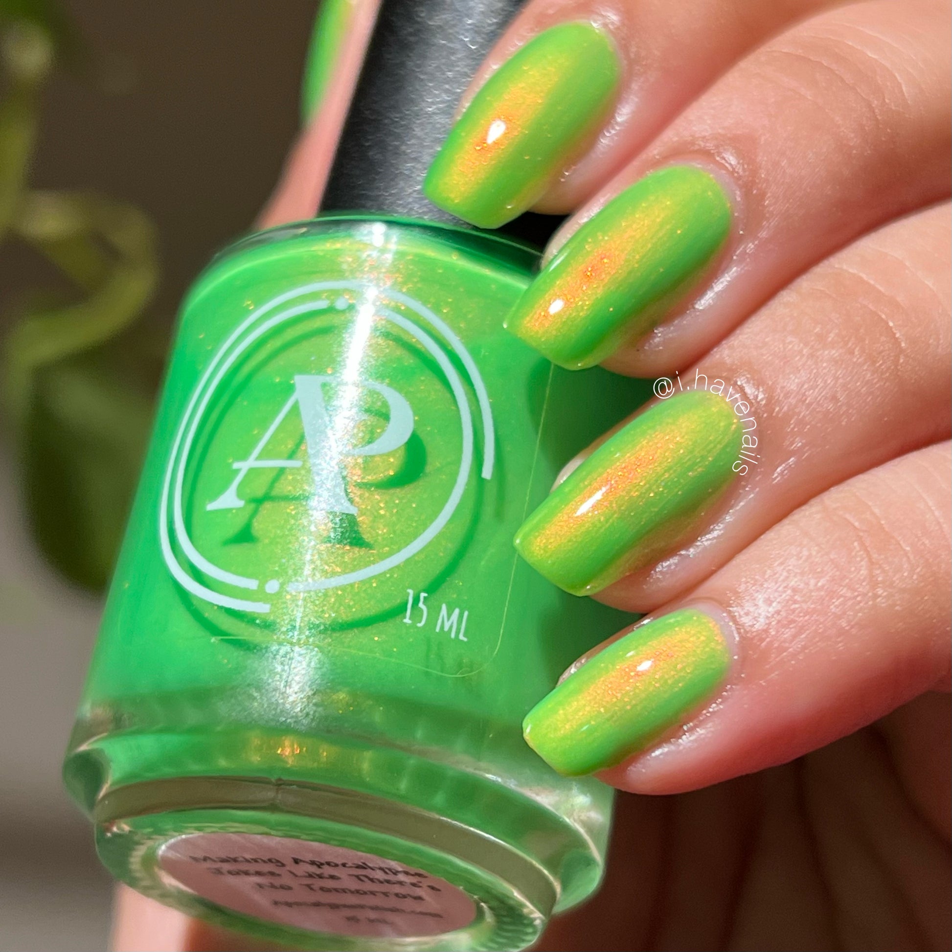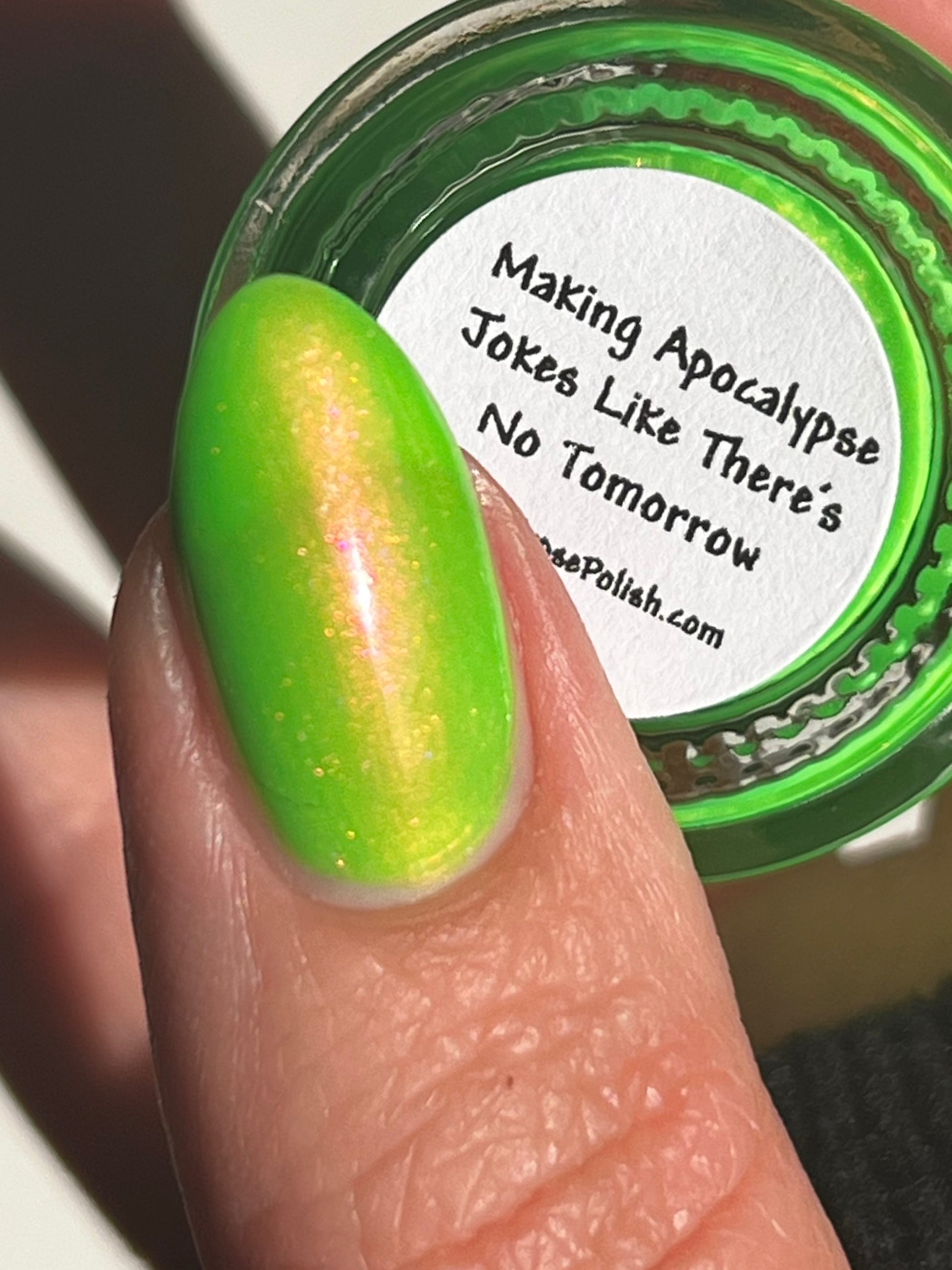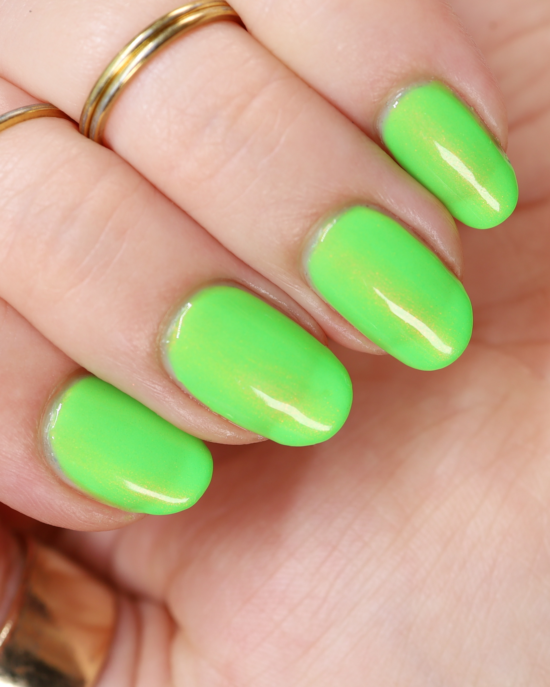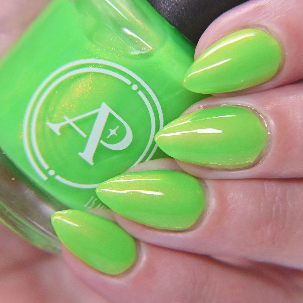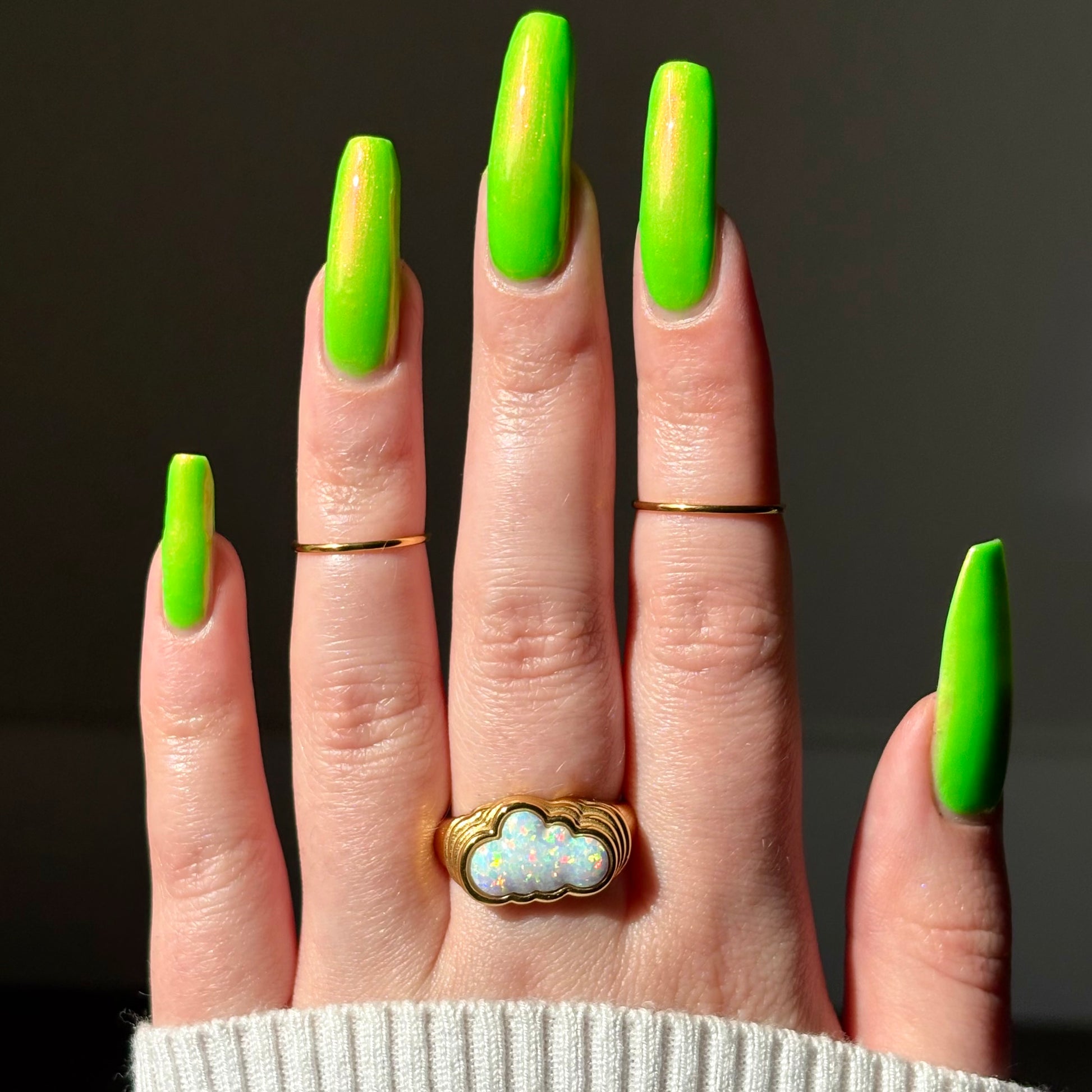 1. This shade is inspired by our favorite joke from the “No Pun Intended” joke book. This neon green has soft red to orange aurora shimmer that shifts to gold at extremes.