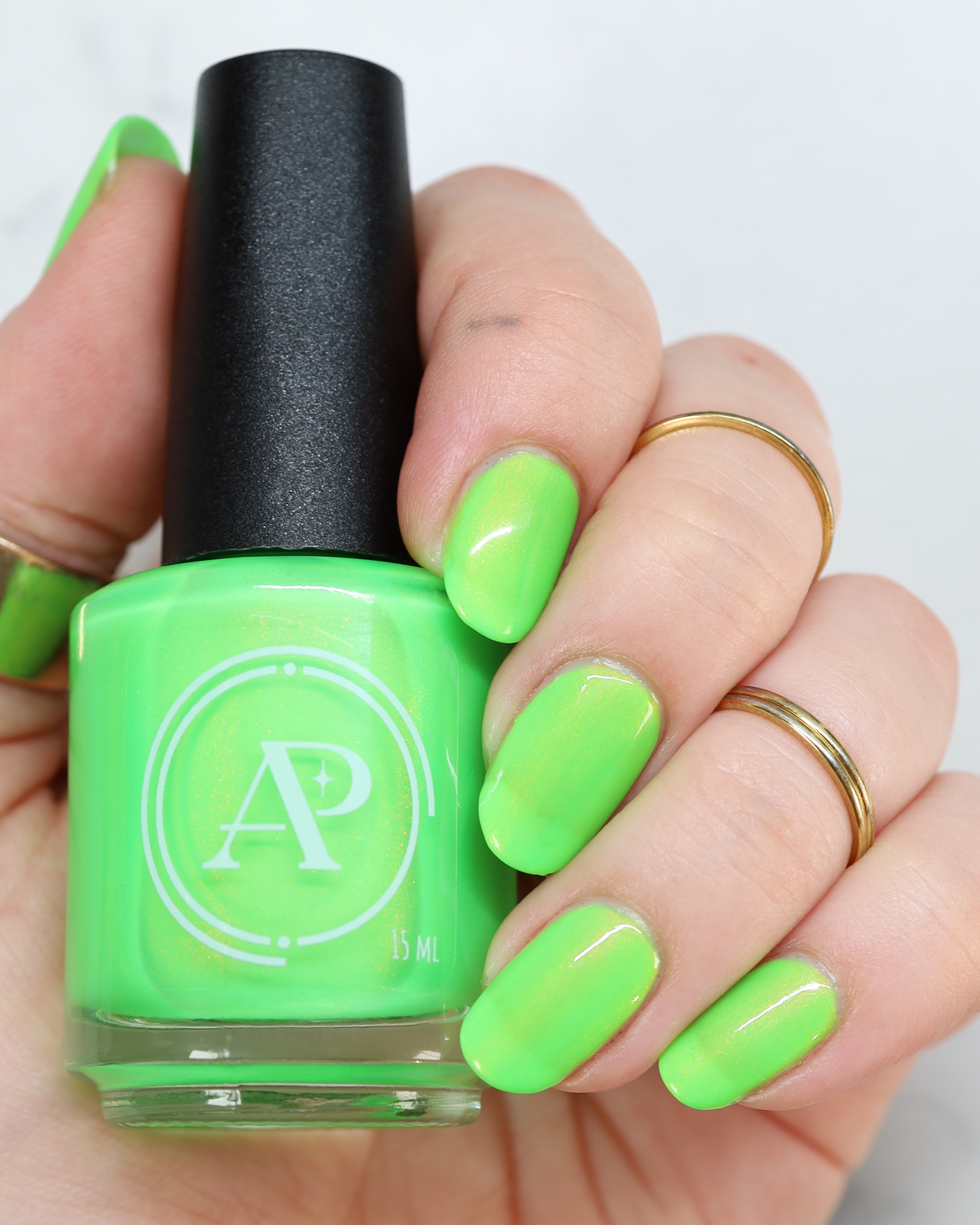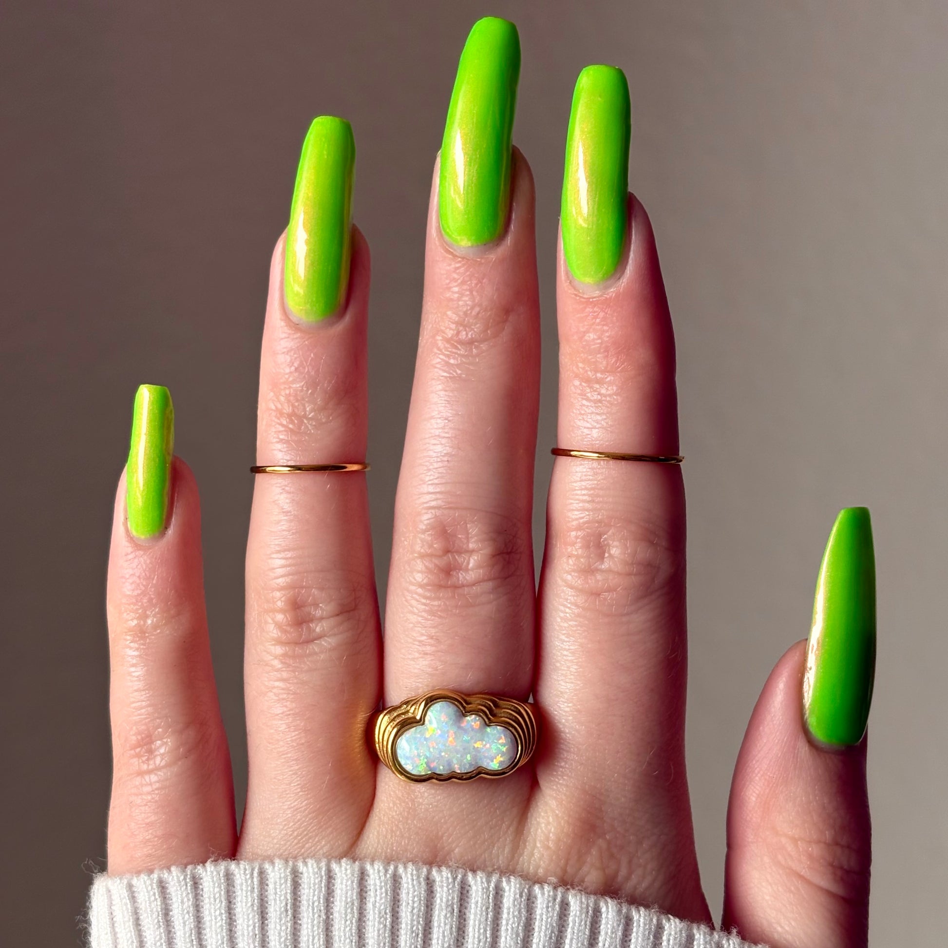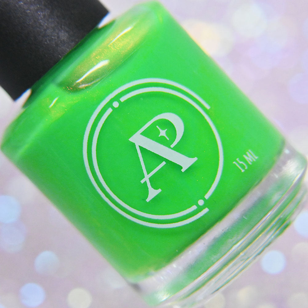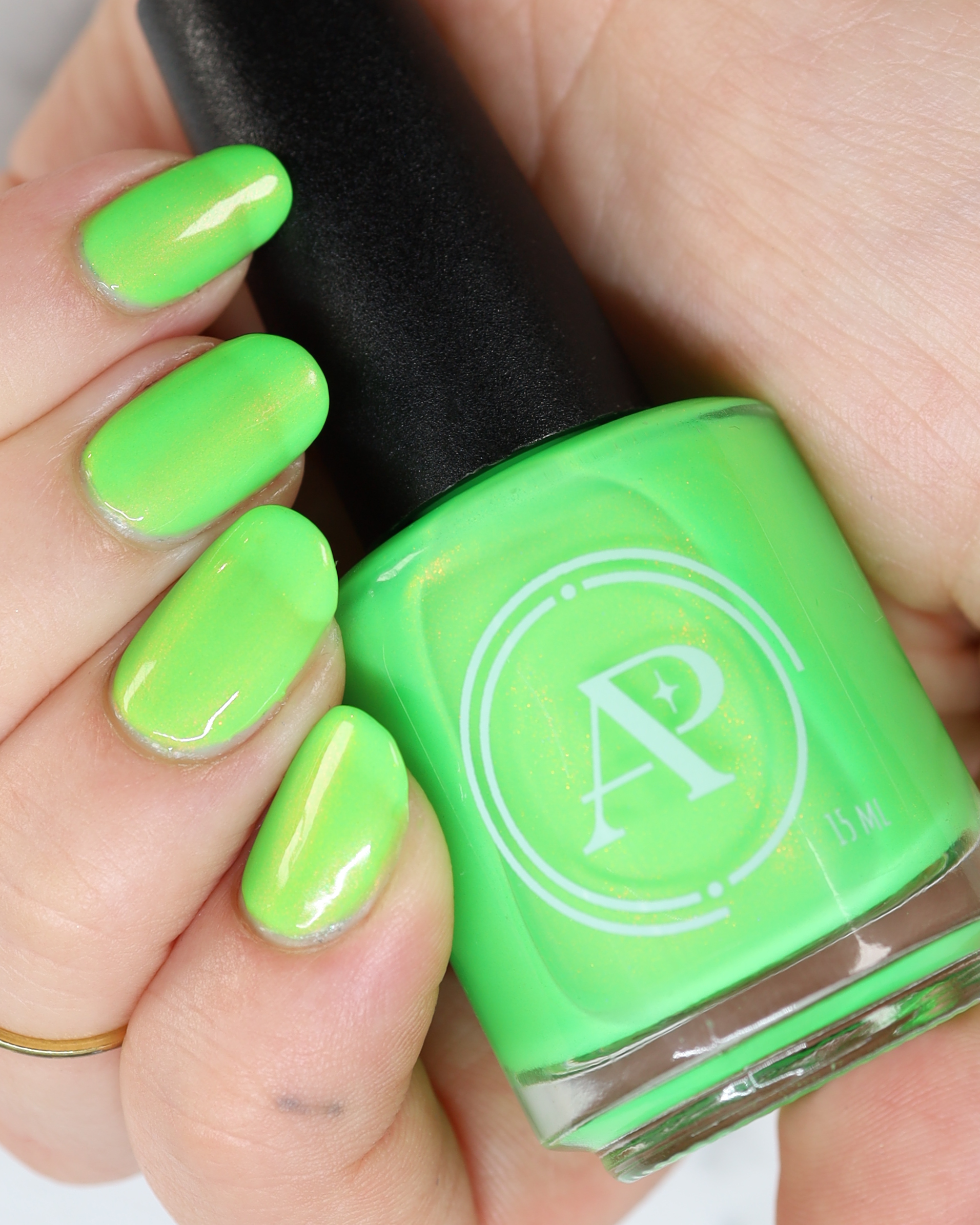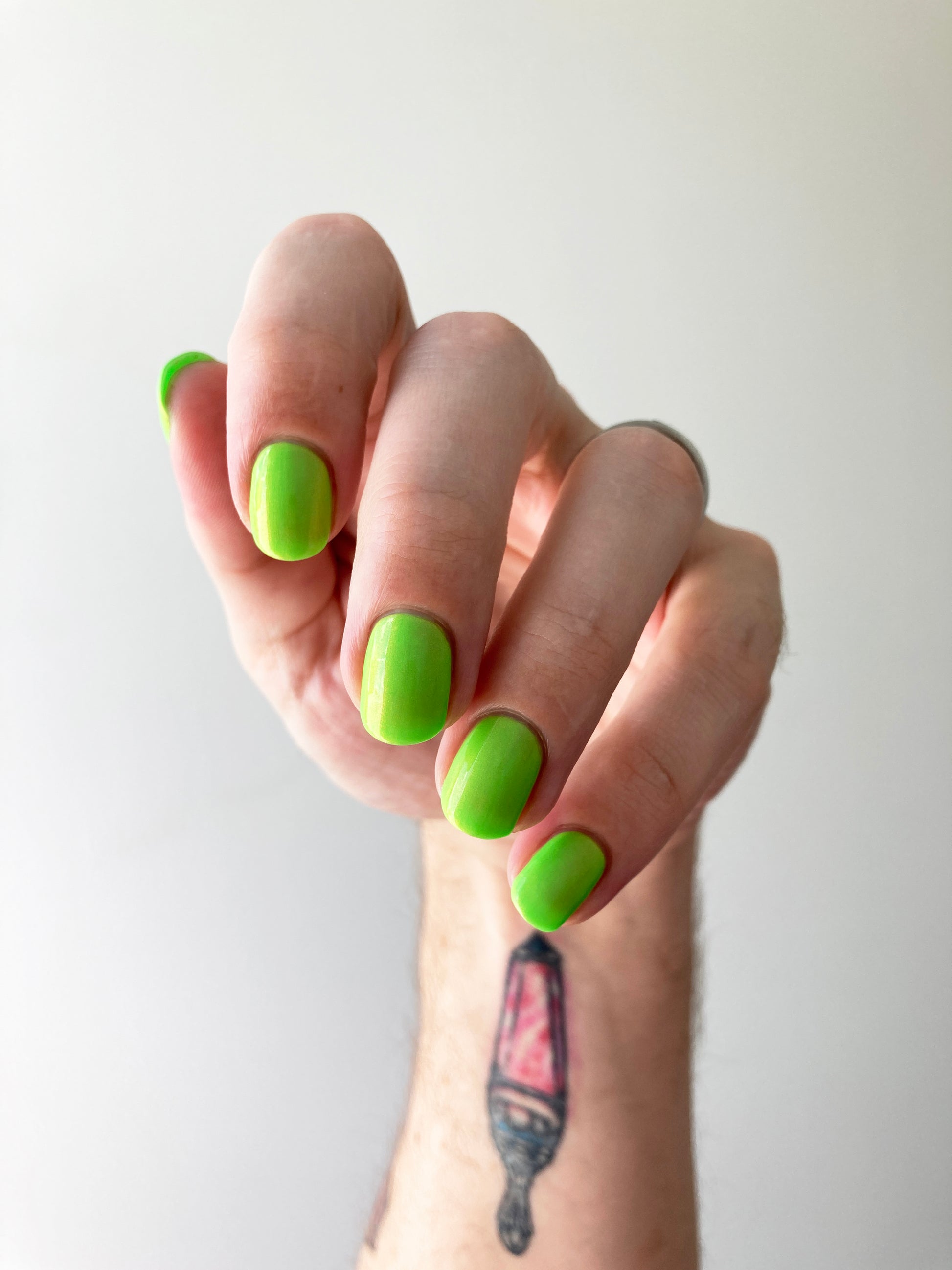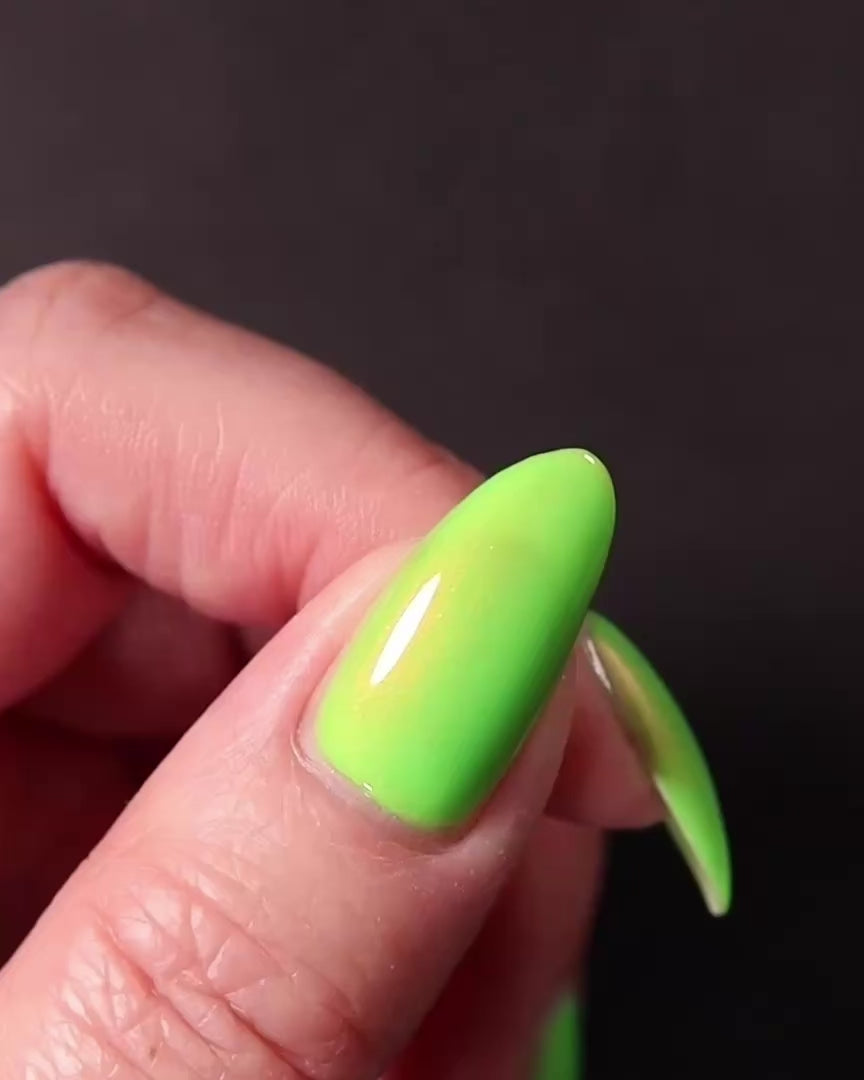 1. This shade is inspired by our favorite joke from the “No Pun Intended” joke book. This neon green has soft red to orange aurora shimmer that shifts to gold at extremes.