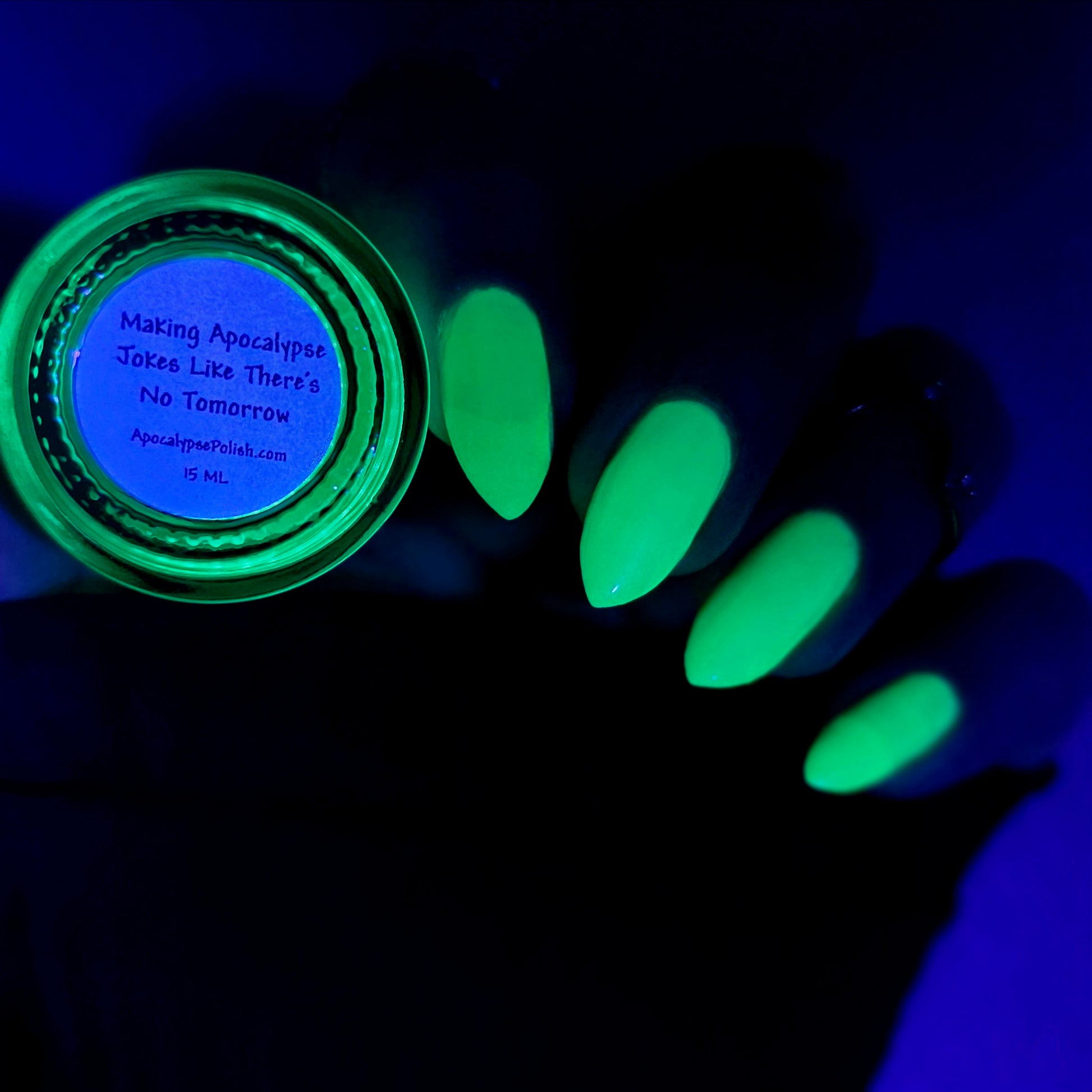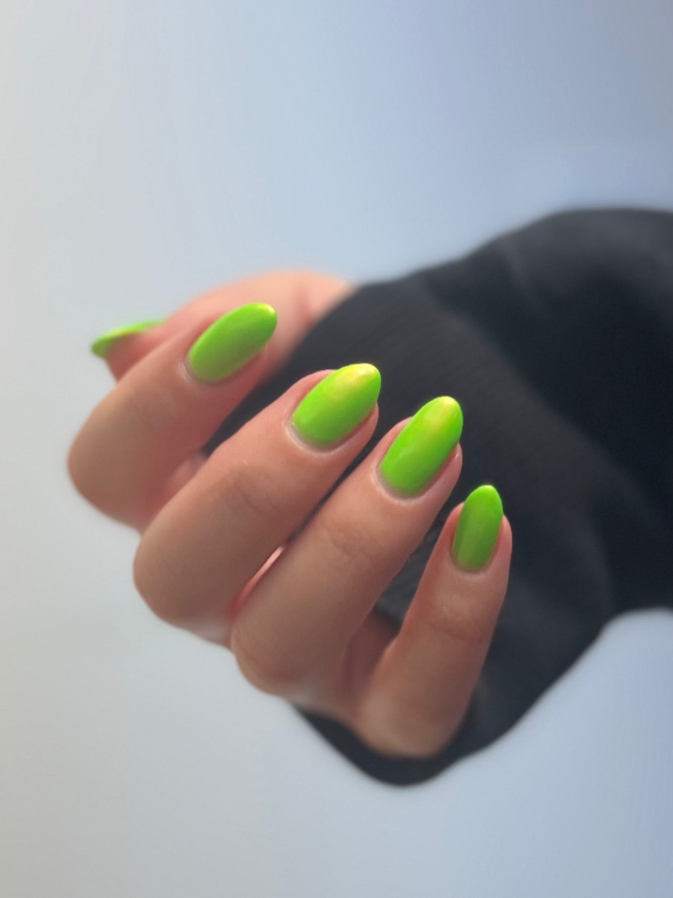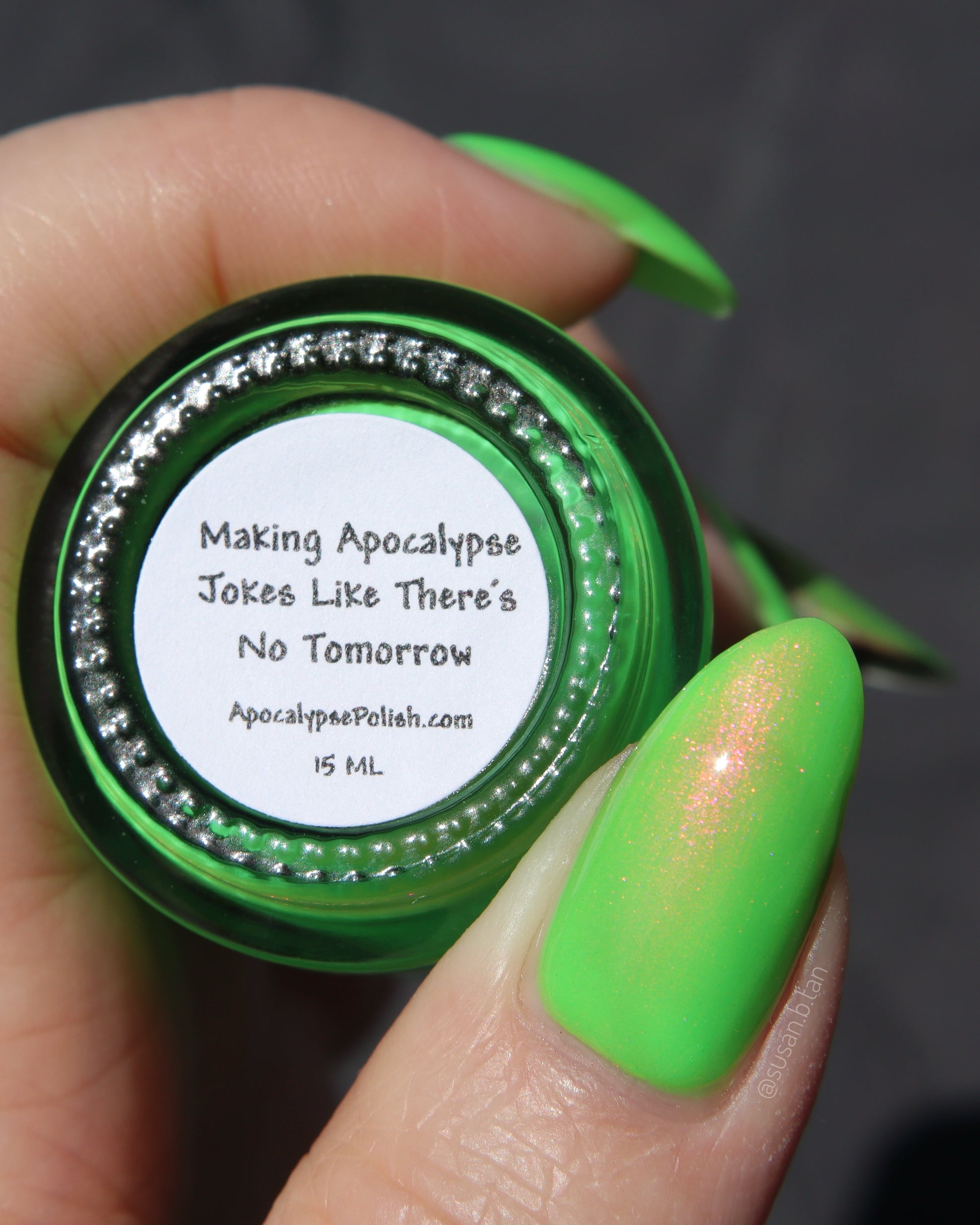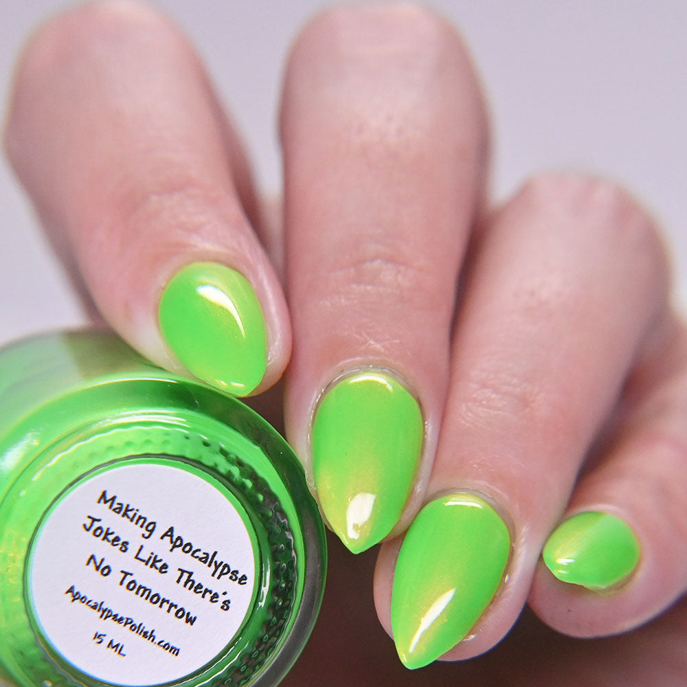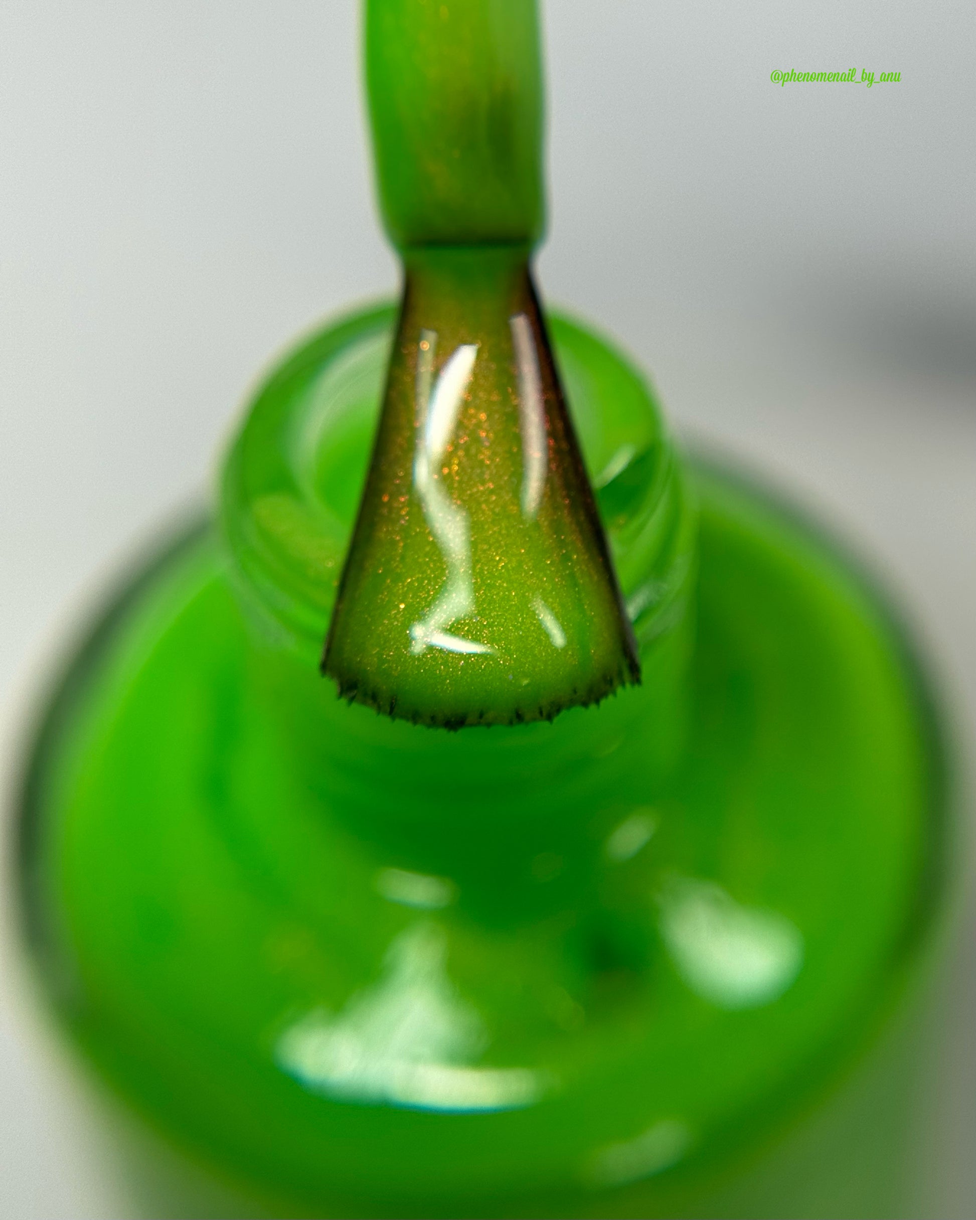 1. This shade is inspired by our favorite joke from the “No Pun Intended” joke book. This neon green has soft red to orange aurora shimmer that shifts to gold at extremes.