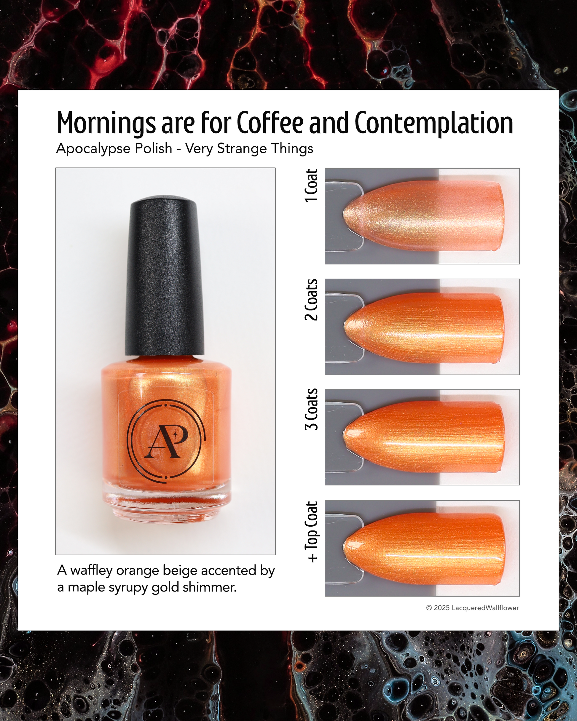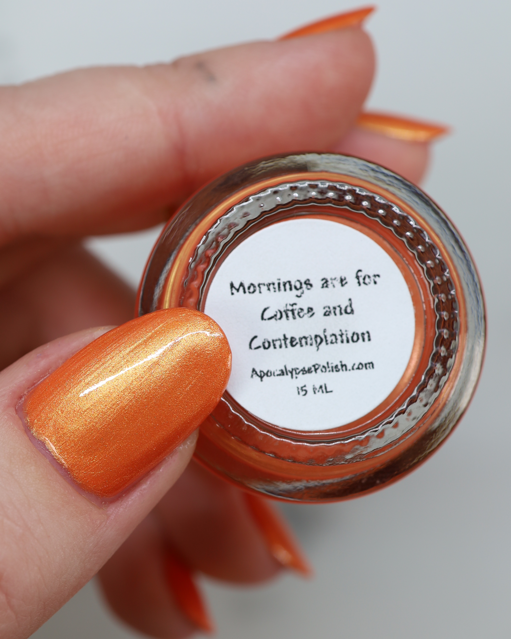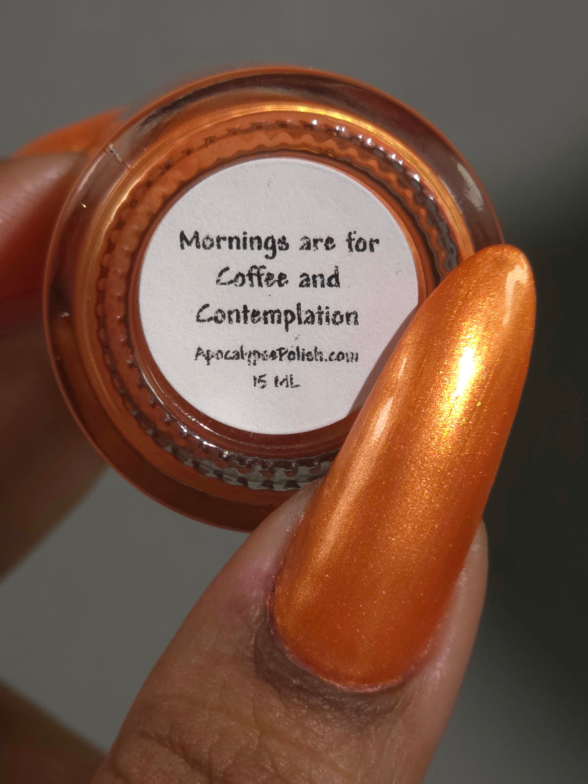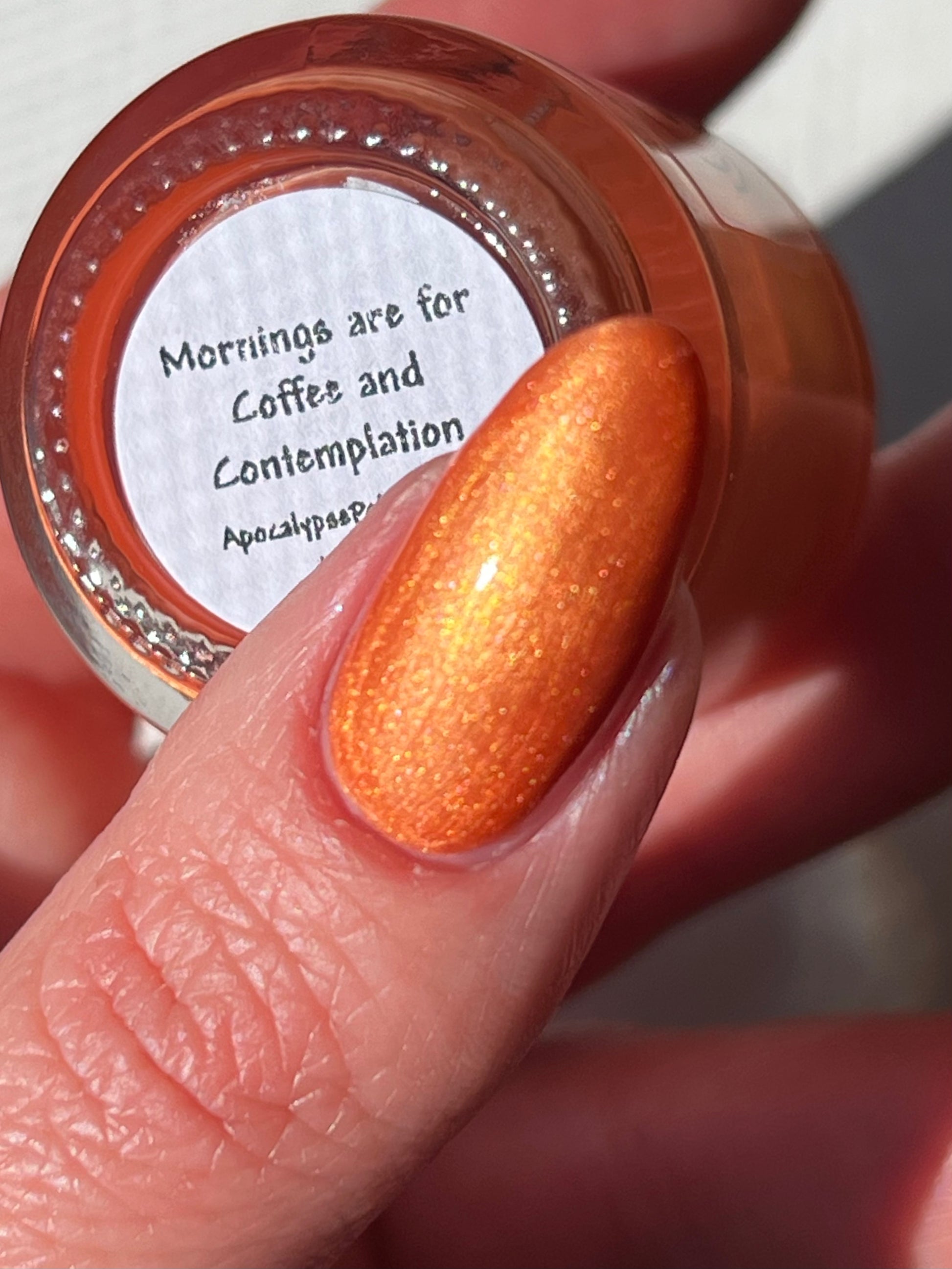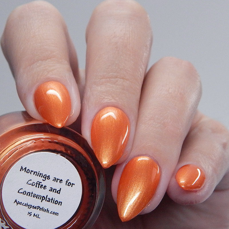 "Mornings Are For Coffee And Contemplation" is a waffle orange shade that is accented by a strong maple sugar gold sheen.