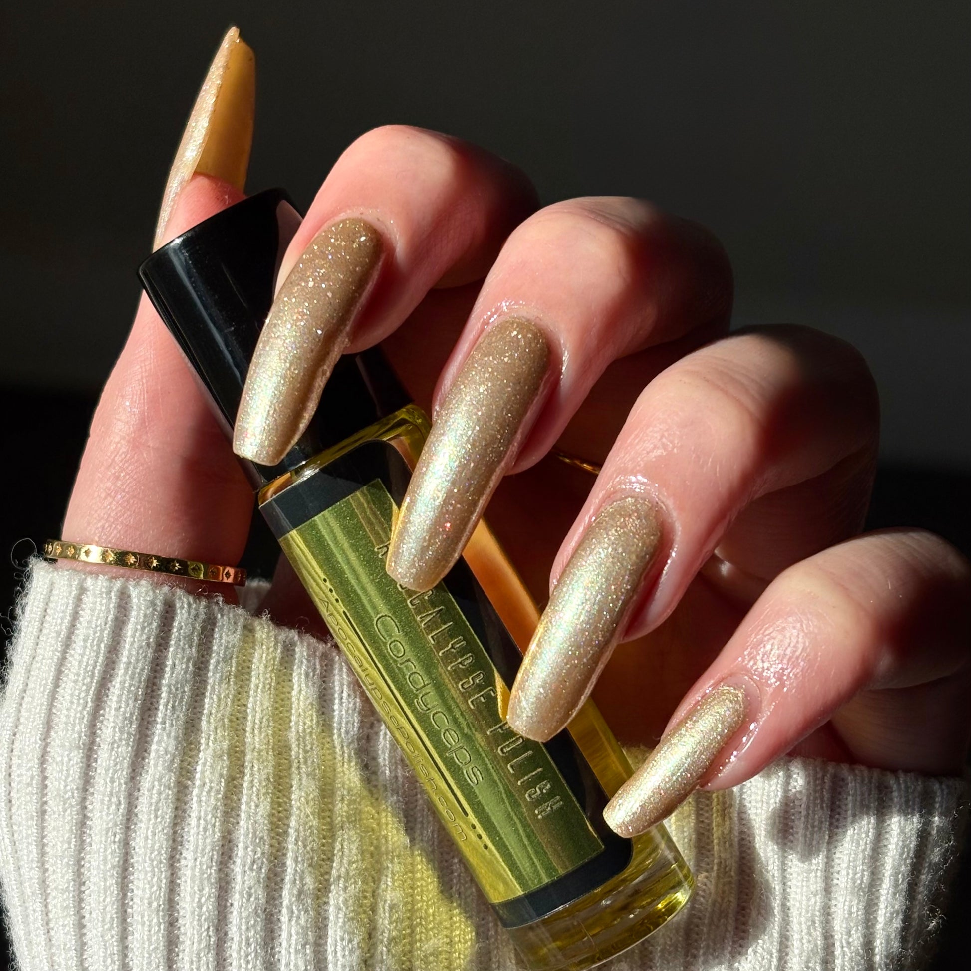 Our cuticle oils come in a 10 ml glass tube, with a stainless steel roller ball. Each cuticle oil has the base ingredients of almond oil, jojoba oil, and other additional oils and additives (such as vitamin E) that make your nails healthy, hydrated and conditioned. We offer a variety of scents, sometimes delicious, sometimes strange, always apocalyptic.