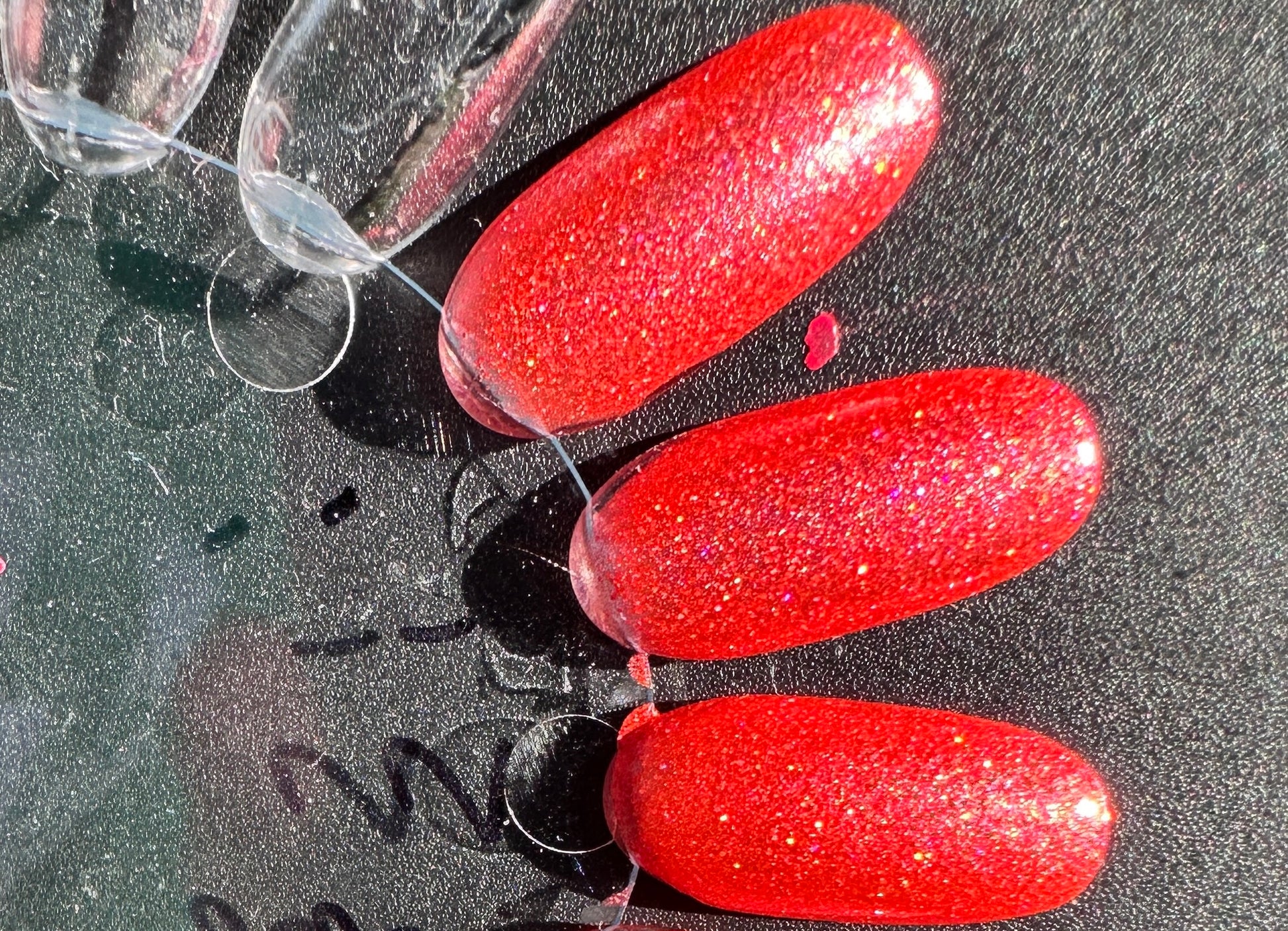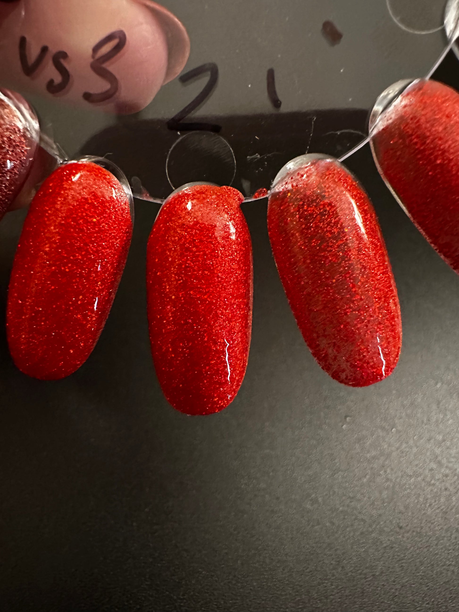 This shade is inspired by the fictional version of netflix from the episode, Joan Is Awful. Netflix exists in the Black Mirror universe, it’s just called Streamberry. In the episode, our main character discovers that she, herself, is the star of the new show on Streamberry. Worse, it shows the day that she had JUST lived, with a much darker tone. The episode plays with the multiverse is a tangible, chaotic way. We captured the “Streamberry” red here in this glitter.