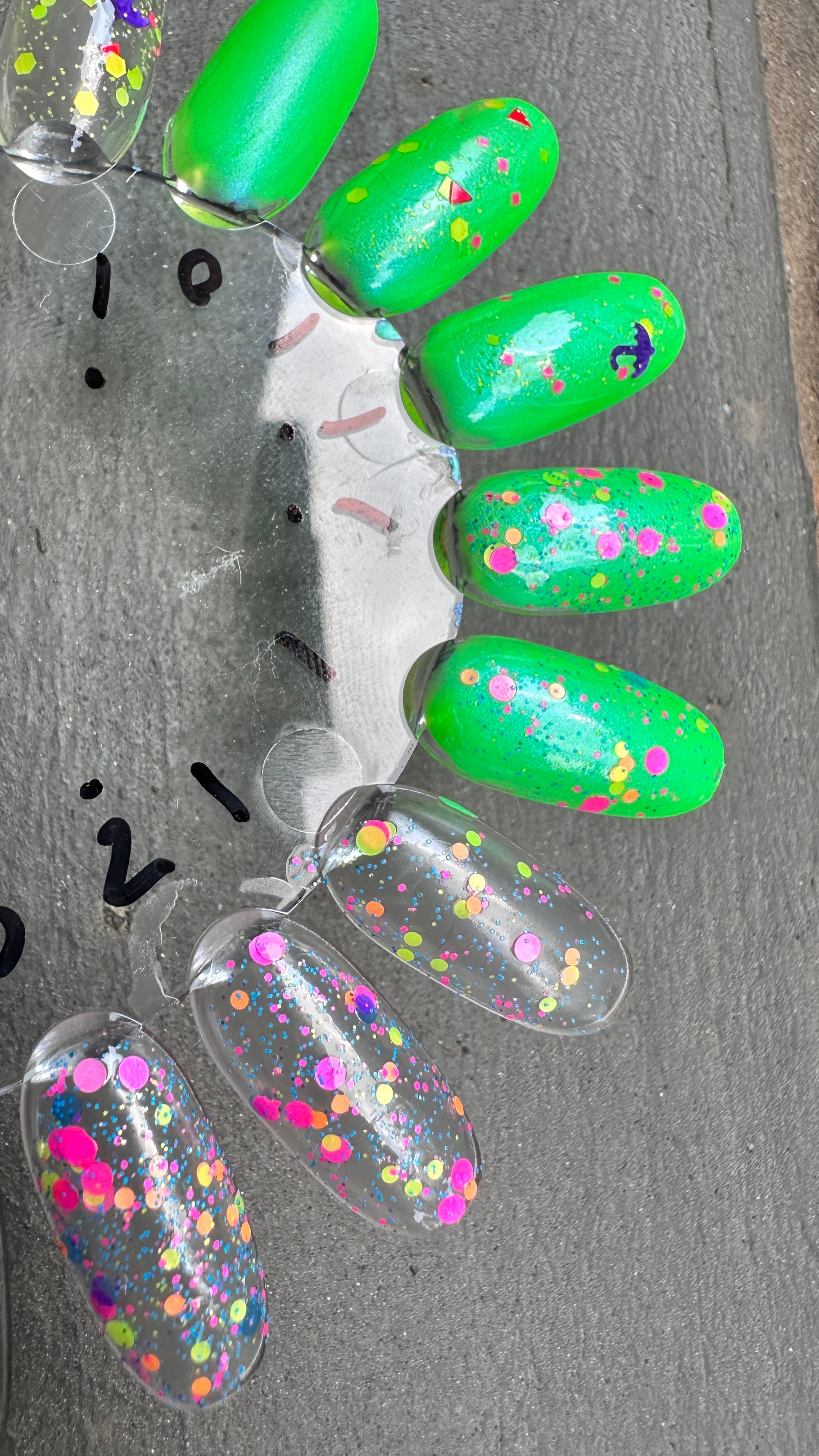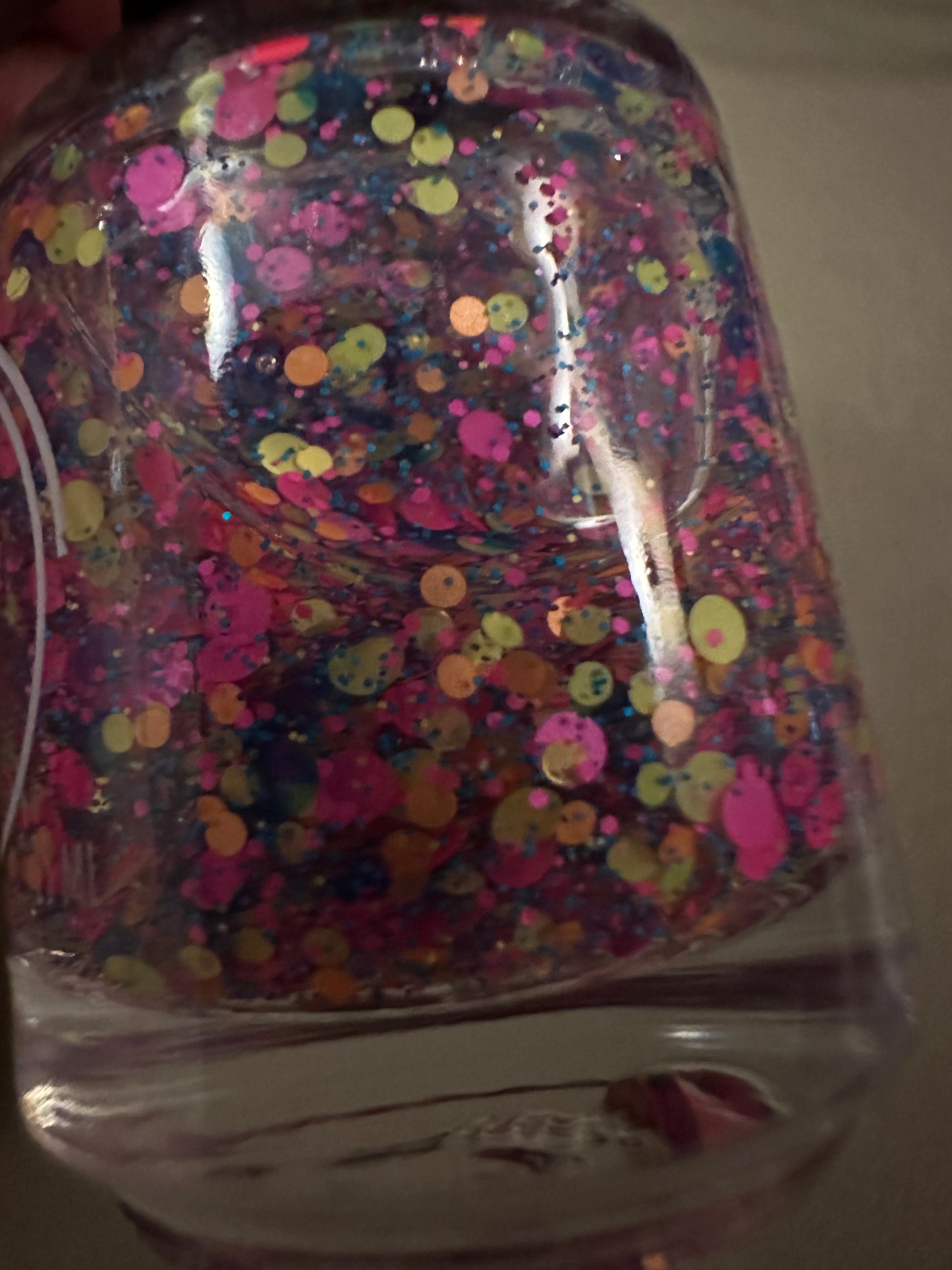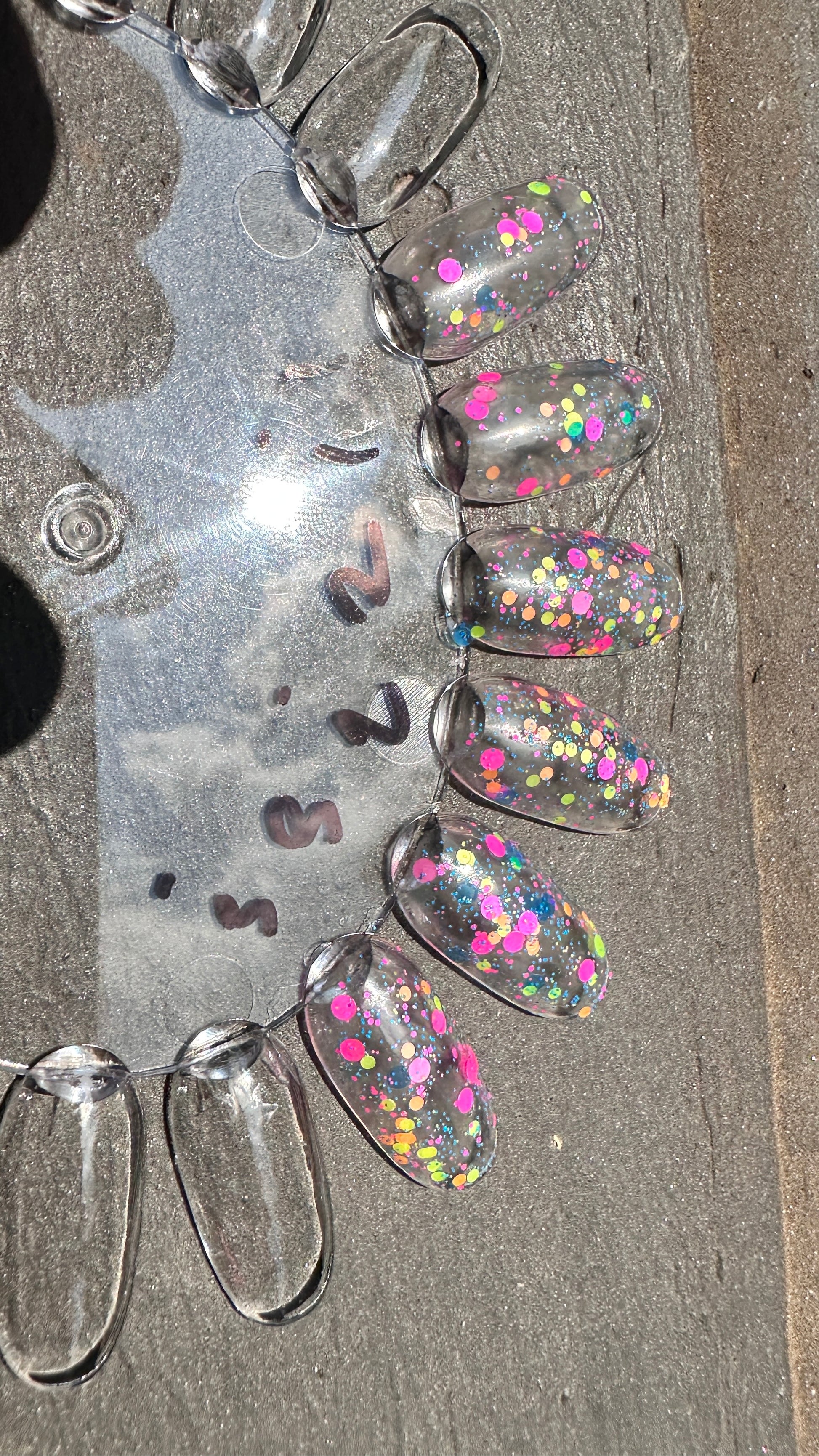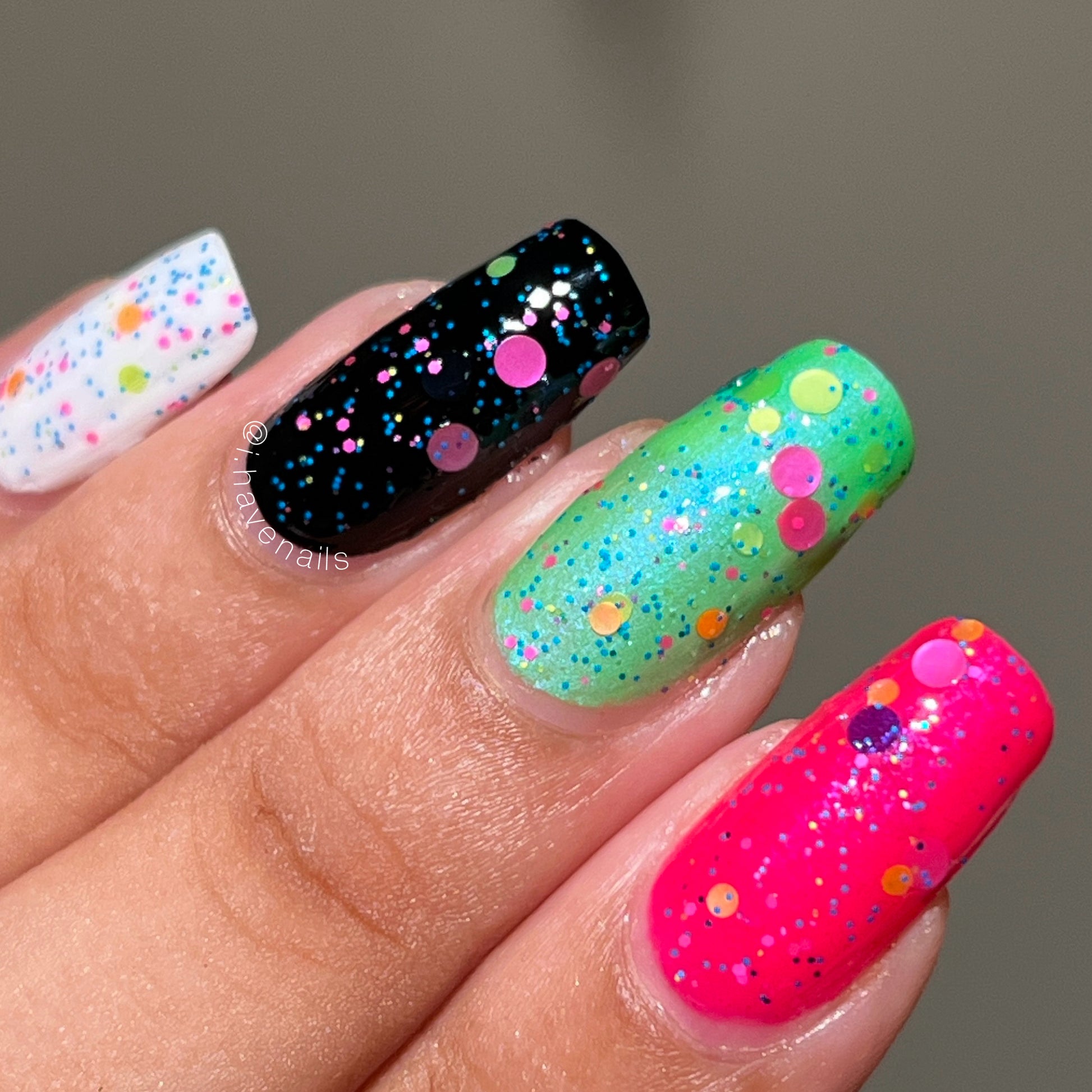 This neon marble topper comes in a 15 ml (.5 fl oz) bottle with a fan brush. This topper has blue neon microdots and looks much more pink/blue than "Player___". It also had no other shapes. Swatch wheels show the number of coats. The dot above the number means i also applied our glitter smoother “containment facility” and then top coat.