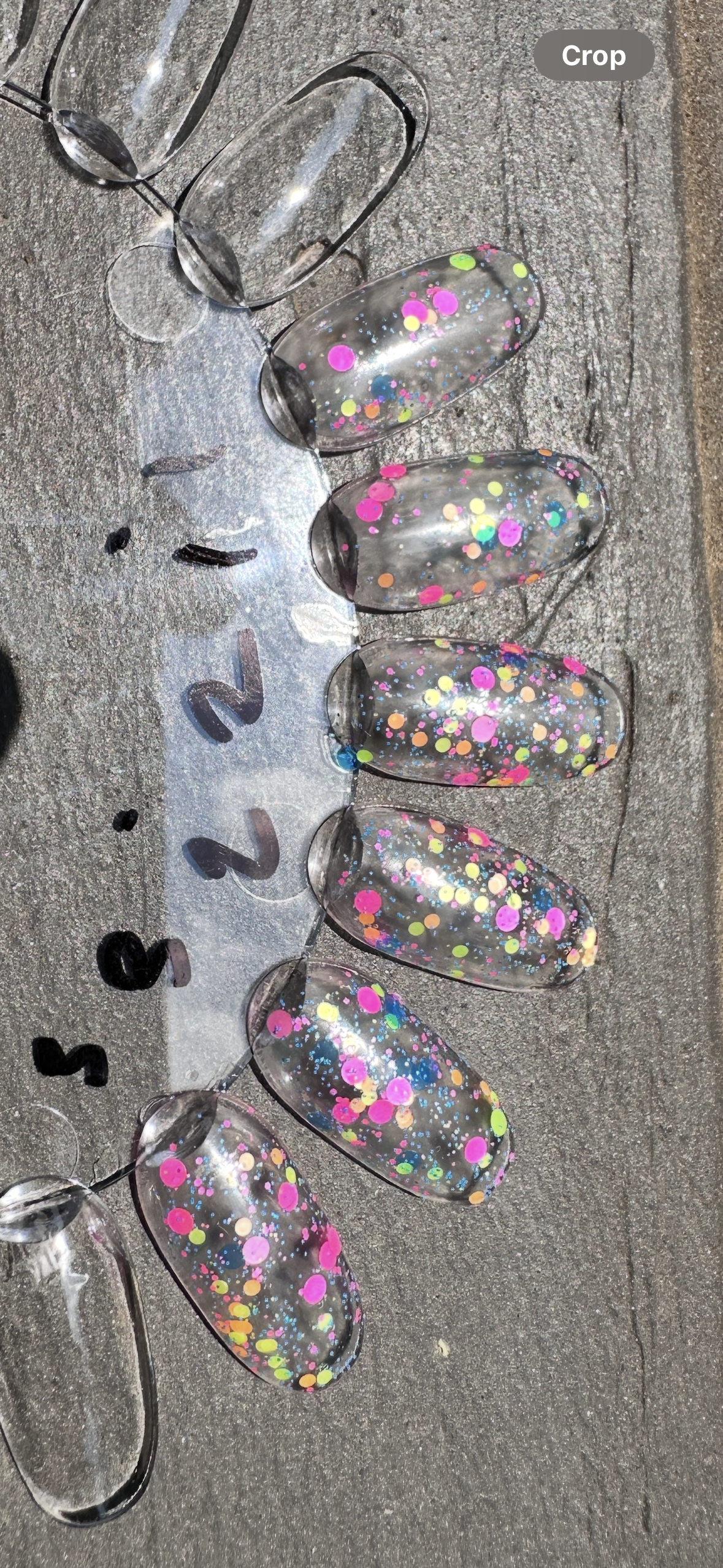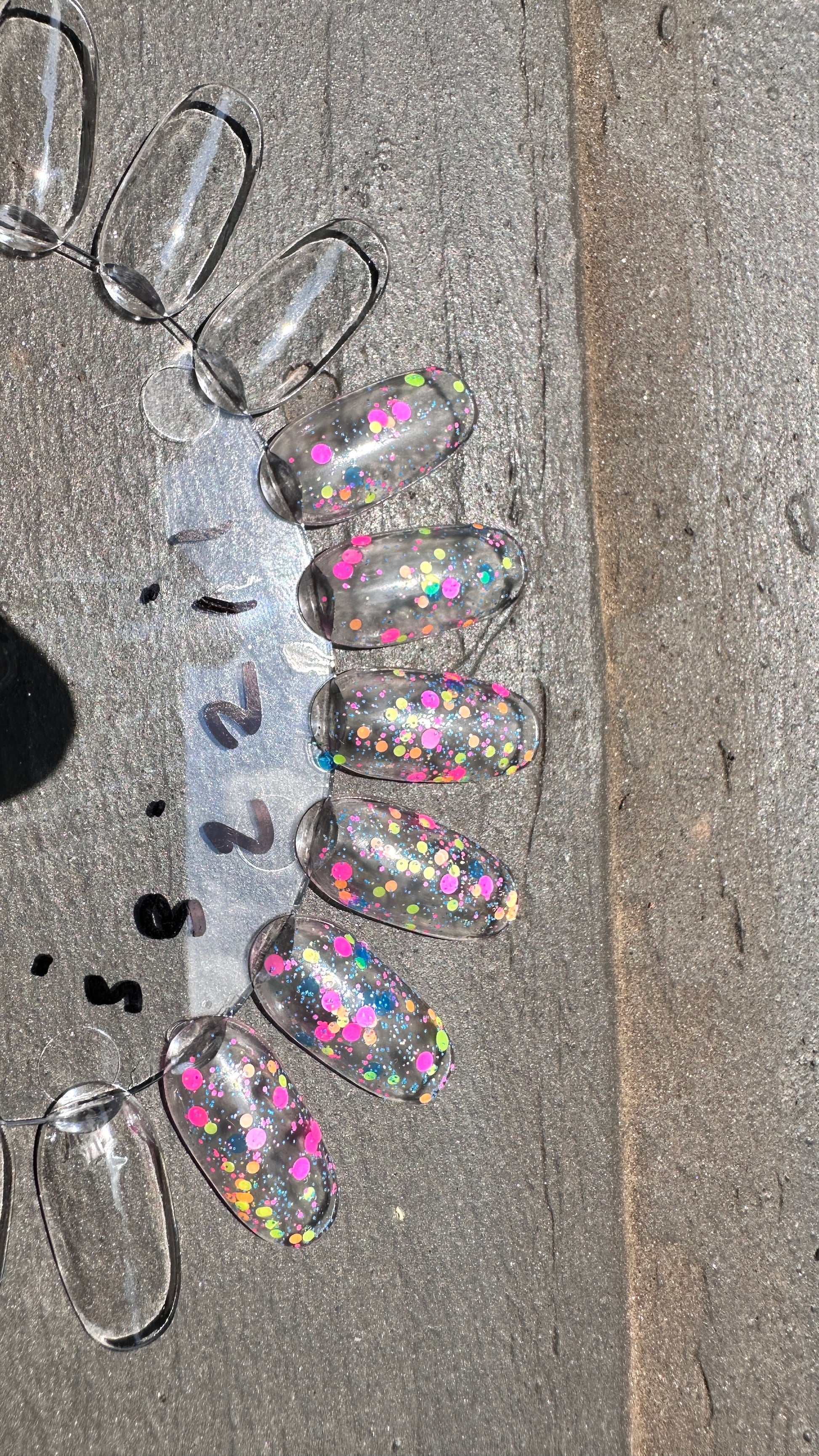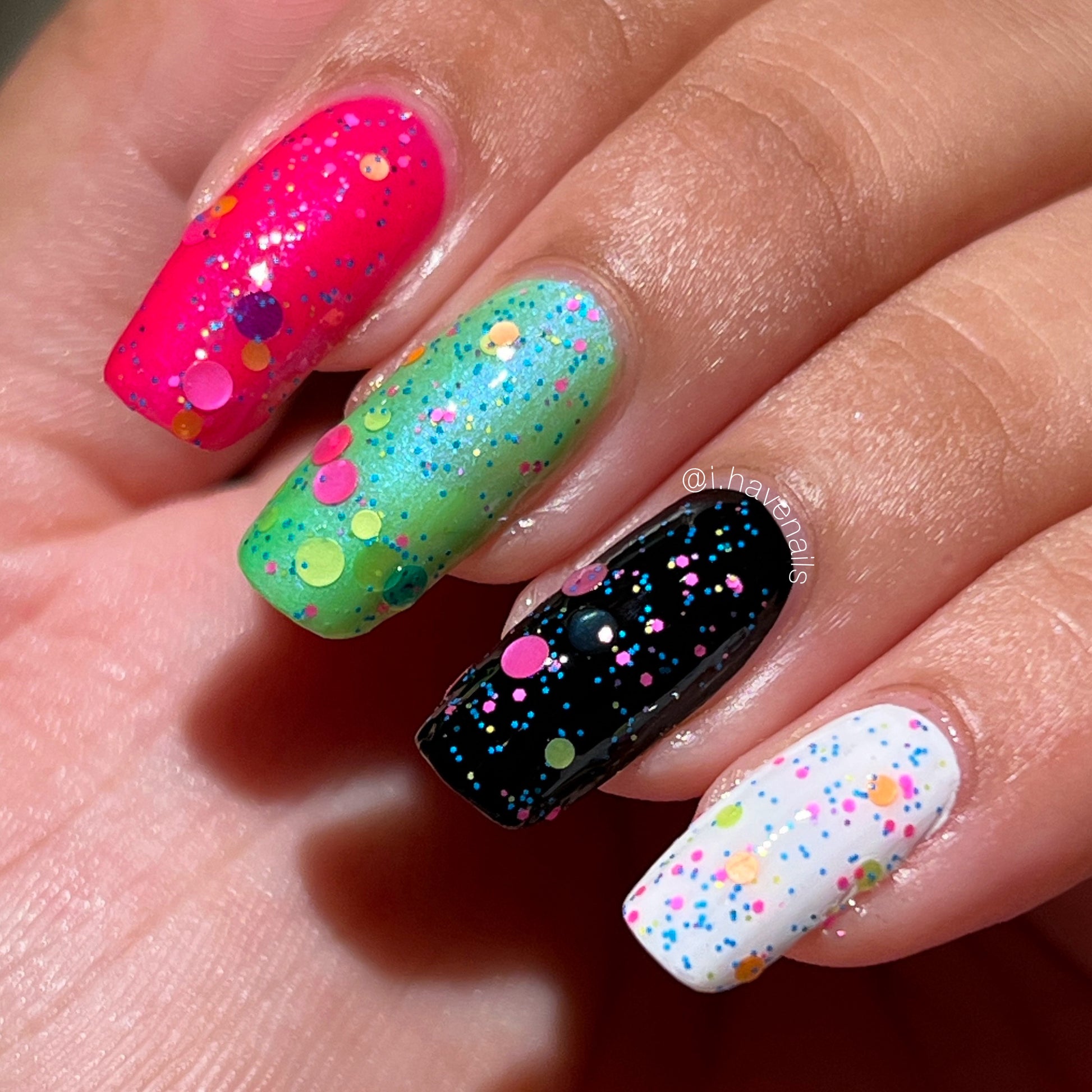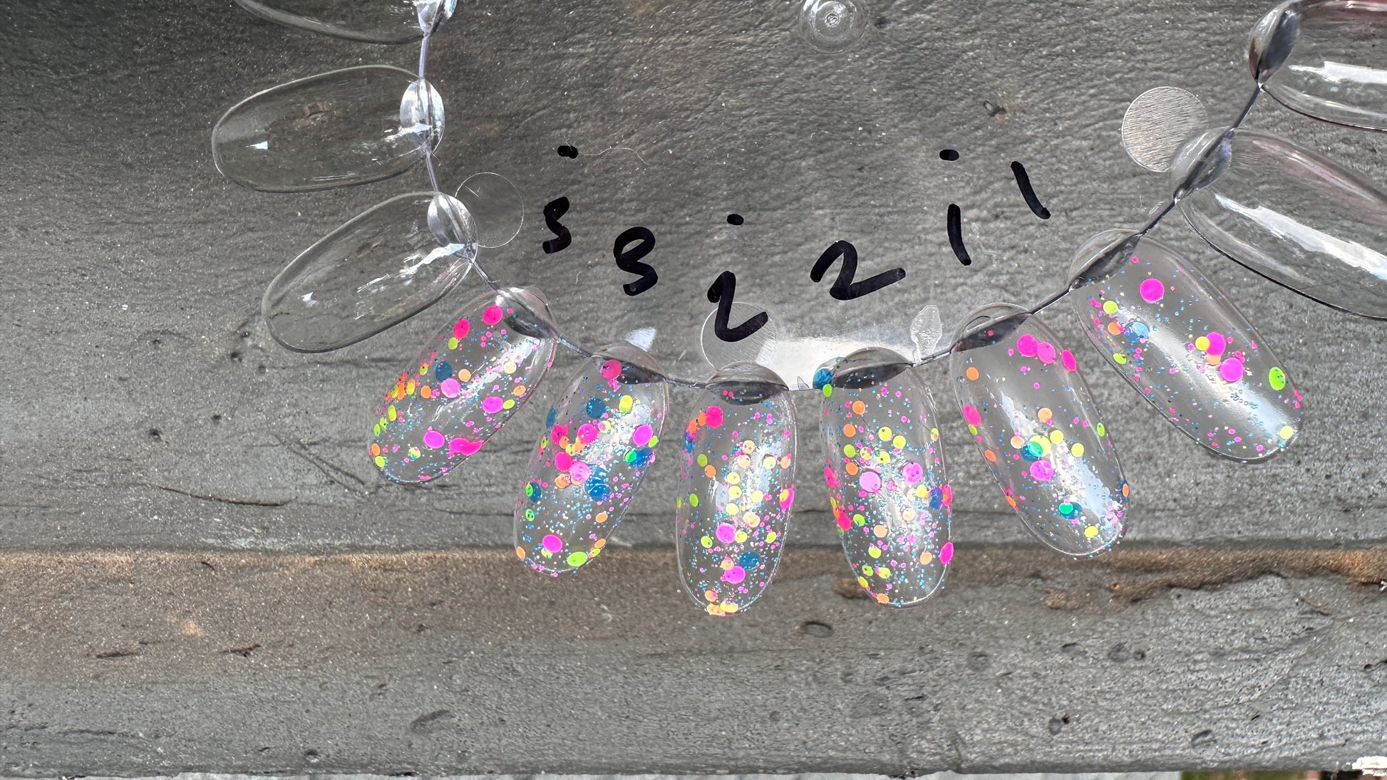 This neon marble topper comes in a 15 ml (.5 fl oz) bottle with a fan brush. This topper has blue neon microdots and looks much more pink/blue than "Player___". It also had no other shapes. Swatch wheels show the number of coats. The dot above the number means i also applied our glitter smoother “containment facility” and then top coat.