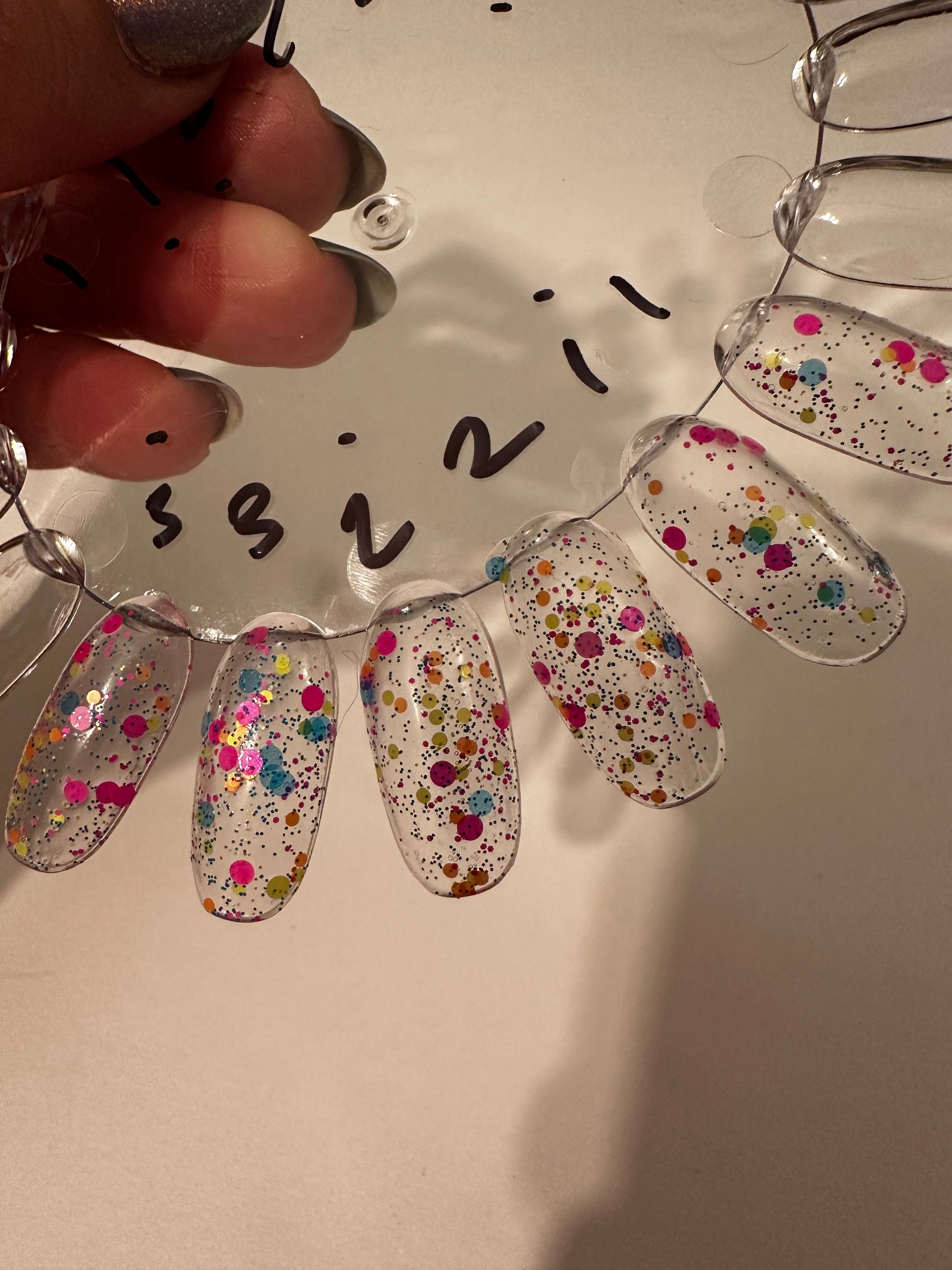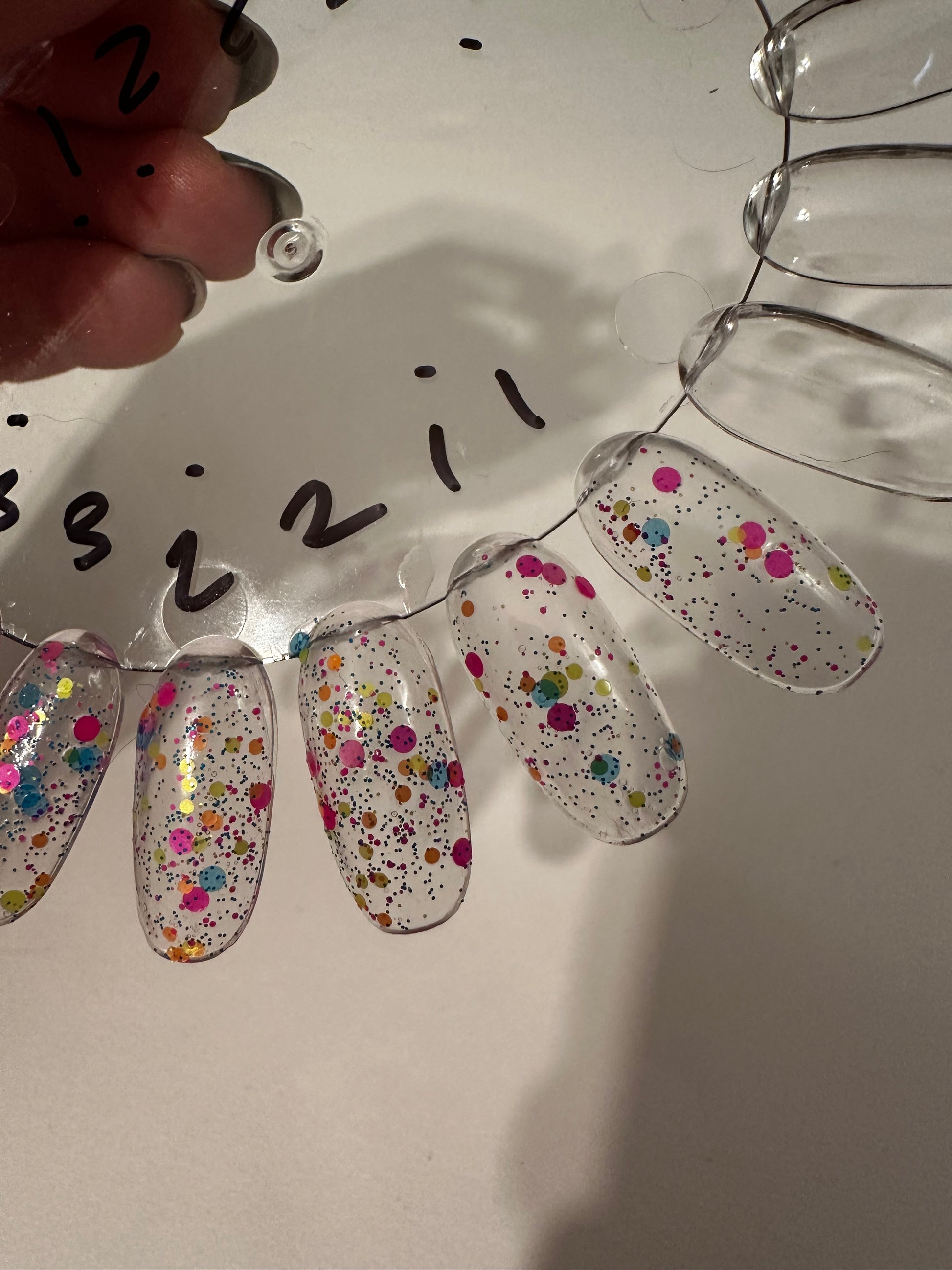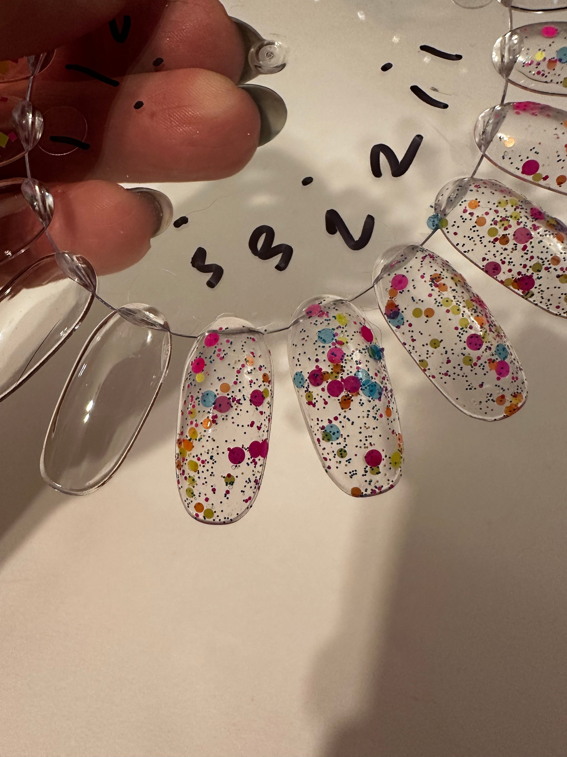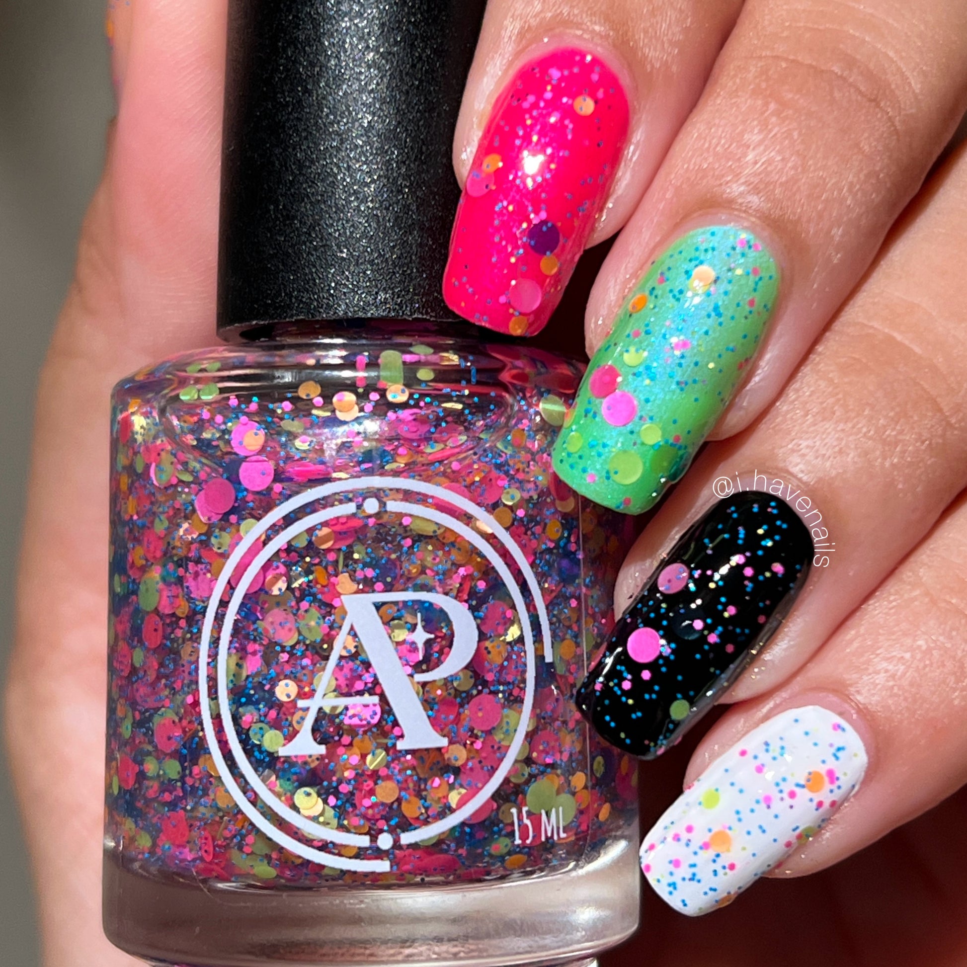This neon marble topper comes in a 15 ml (.5 fl oz) bottle with a fan brush. This topper has blue neon microdots and looks much more pink/blue than "Player___". It also had no other shapes. Swatch wheels show the number of coats. The dot above the number means i also applied our glitter smoother “containment facility” and then top coat.