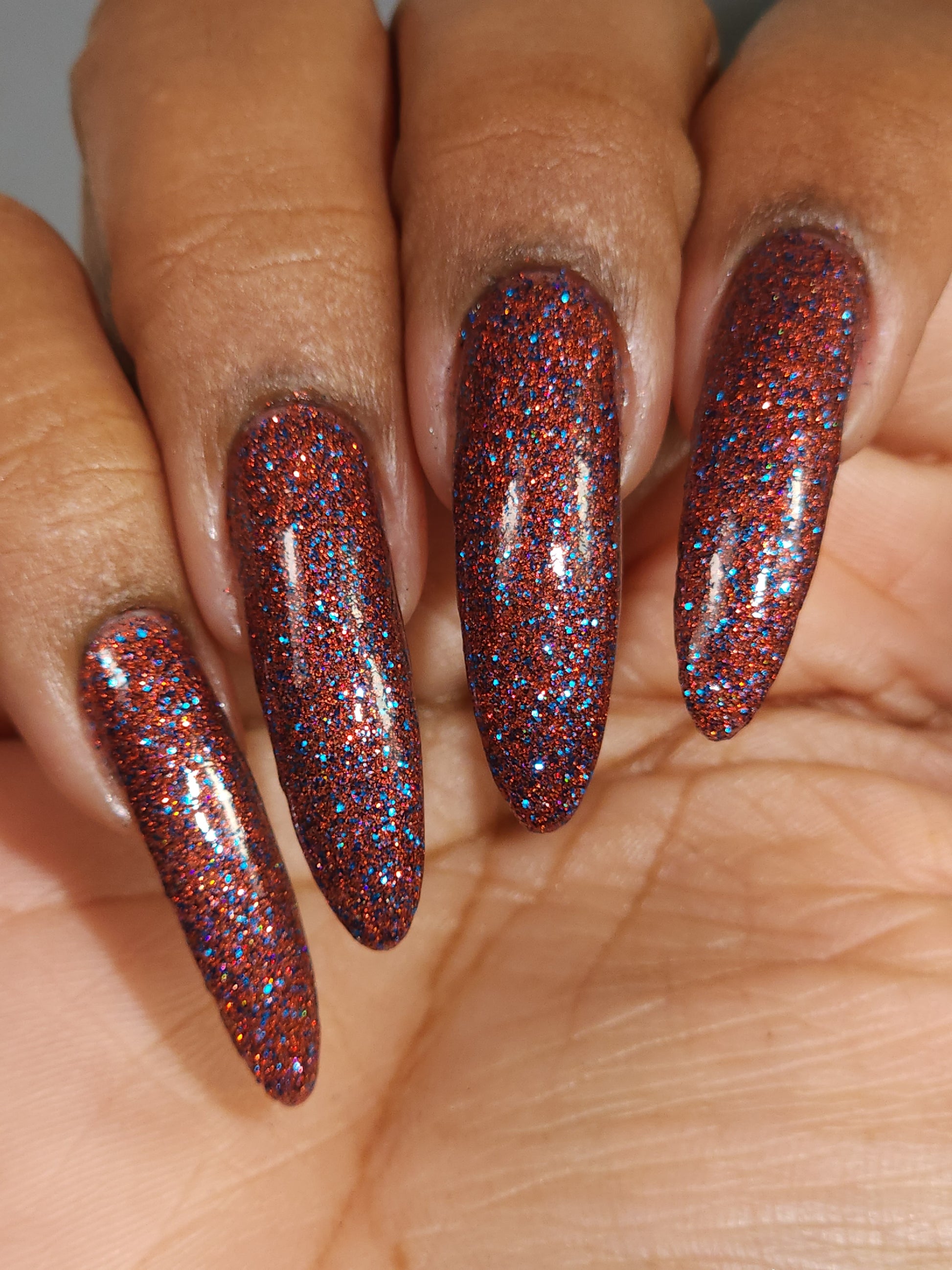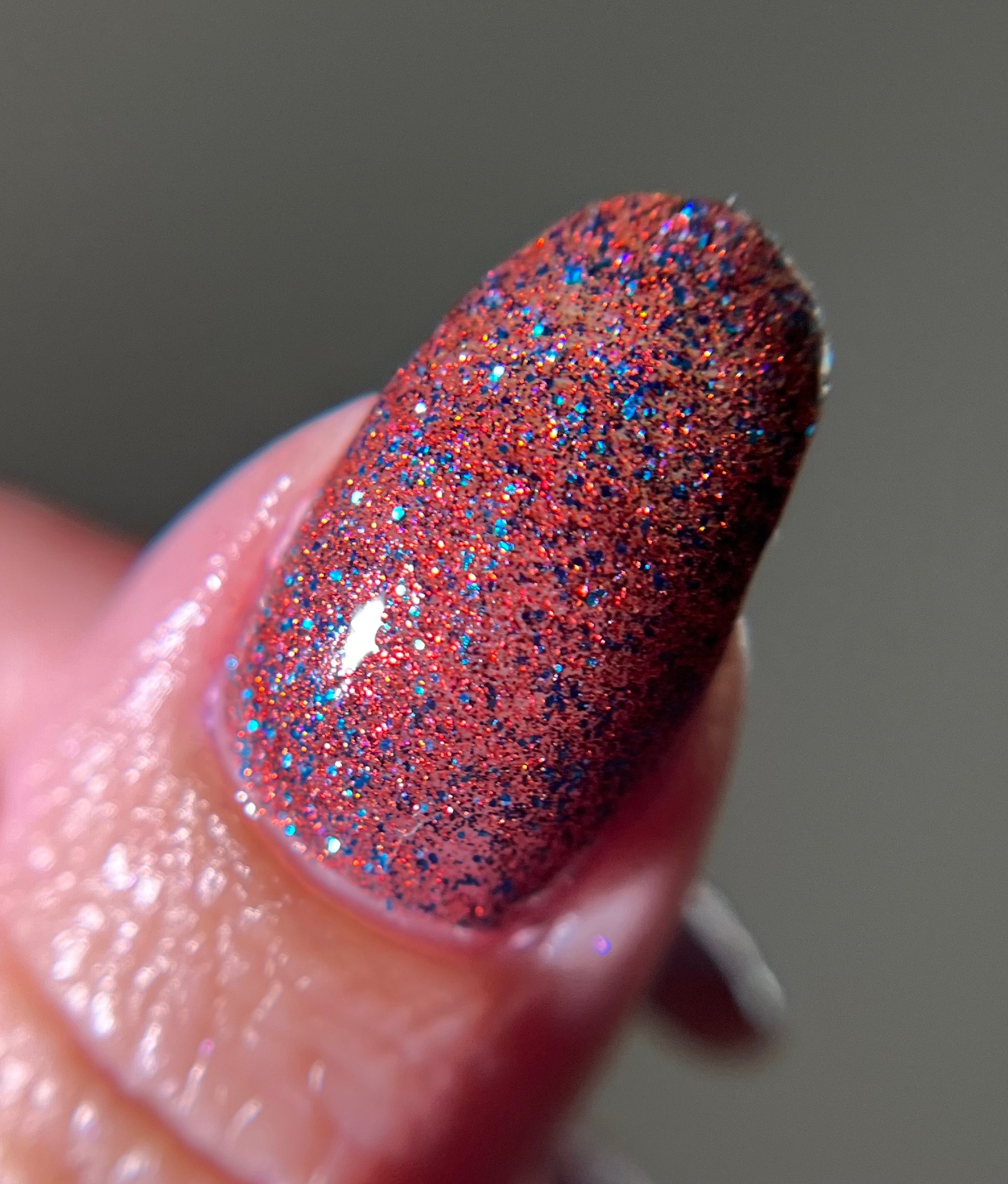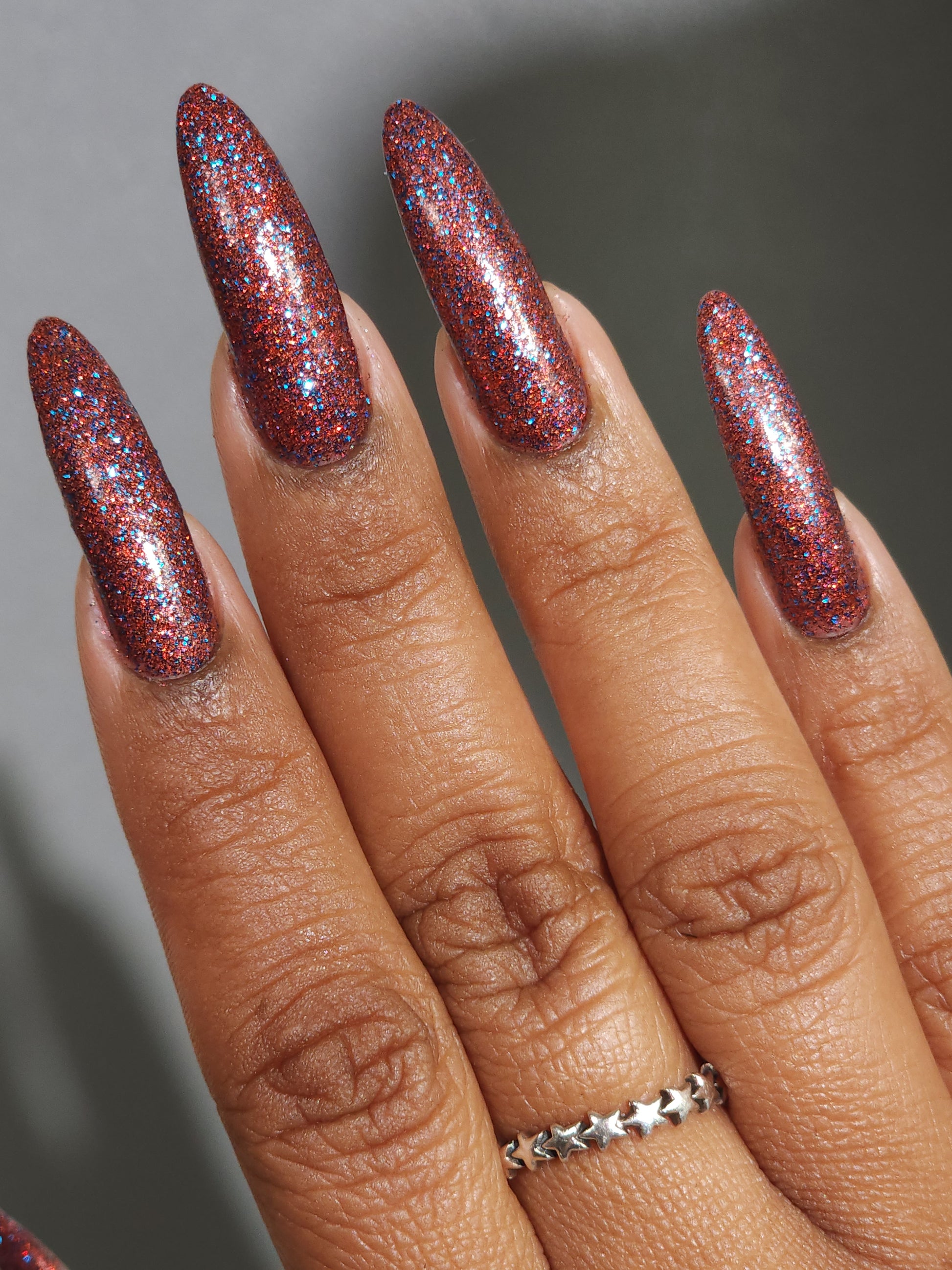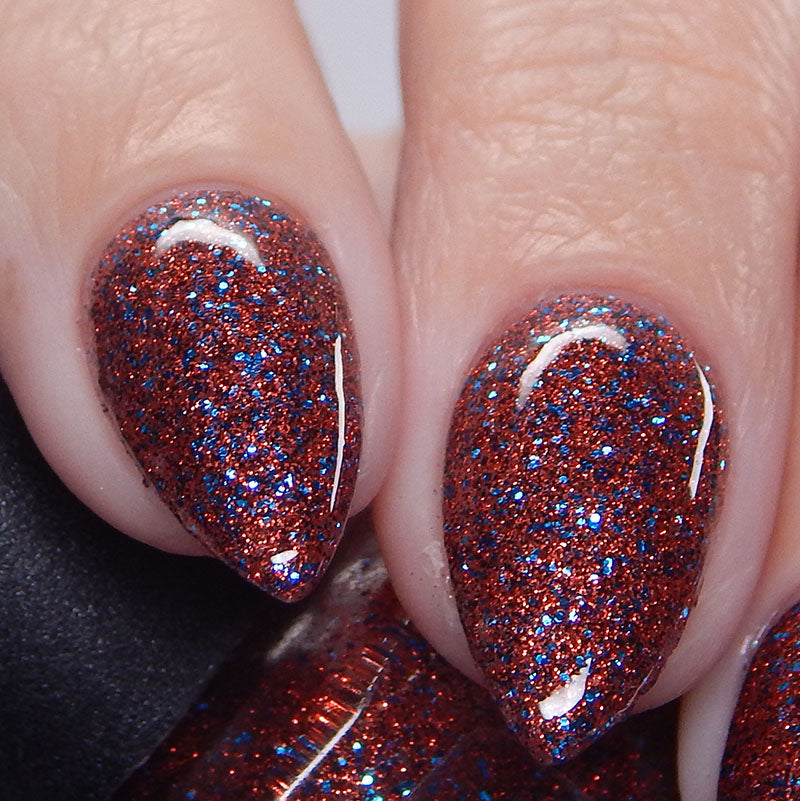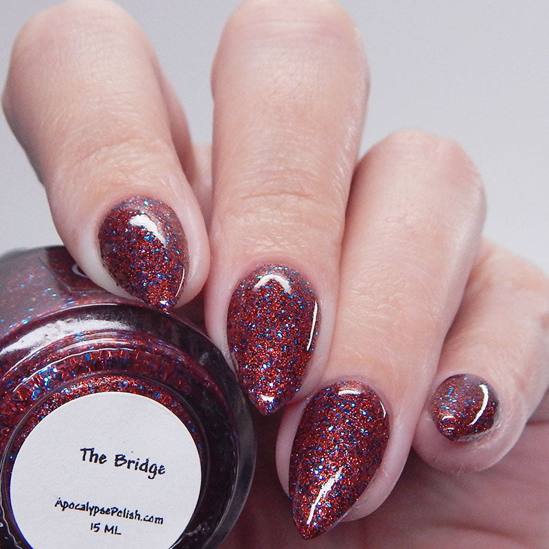 "The Bridge" is a full coverage glitter polish set in a clear base. It is loaded up with holographic black and red glitters and facets of blue holographic glitters. The bridge between worlds is a very strange place.