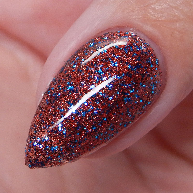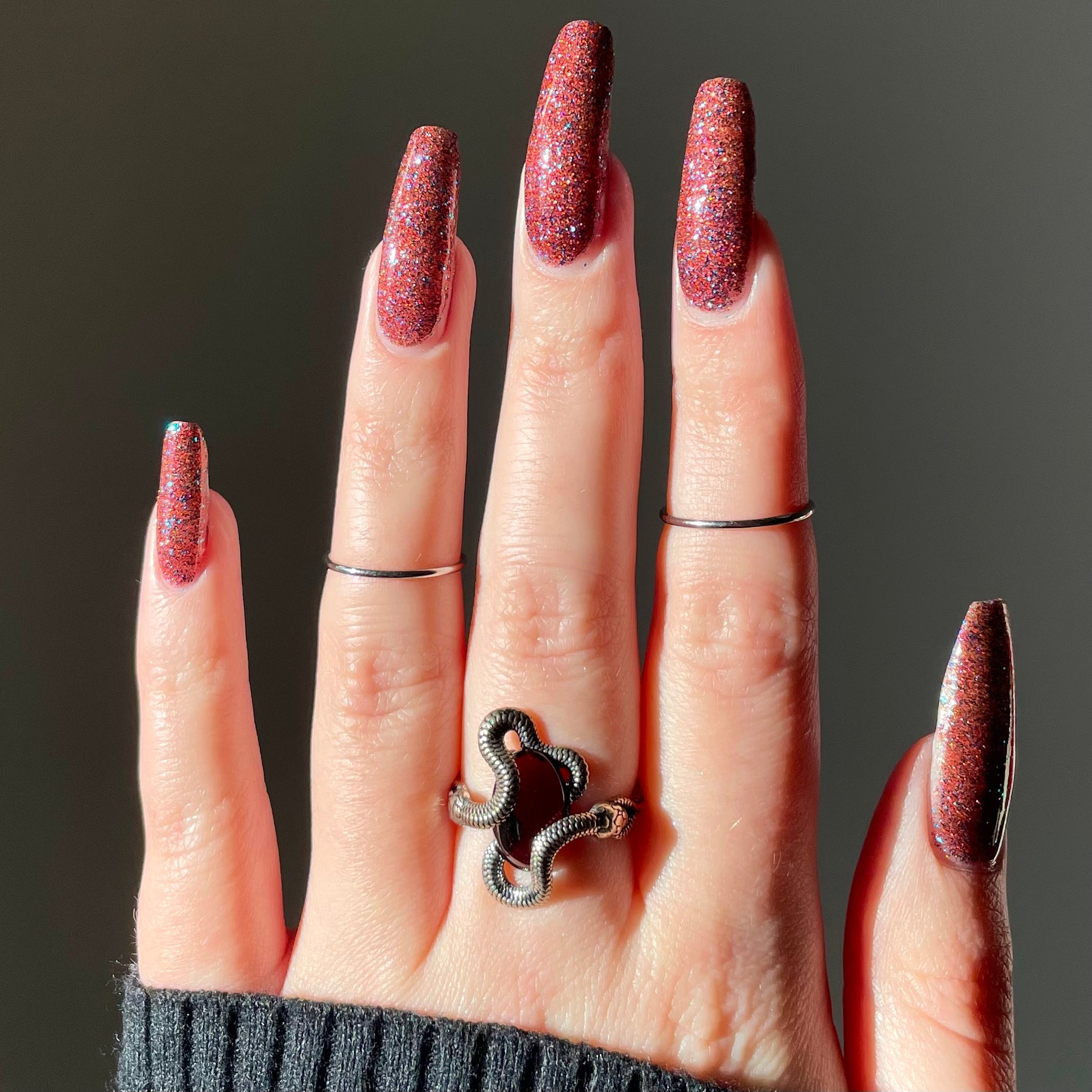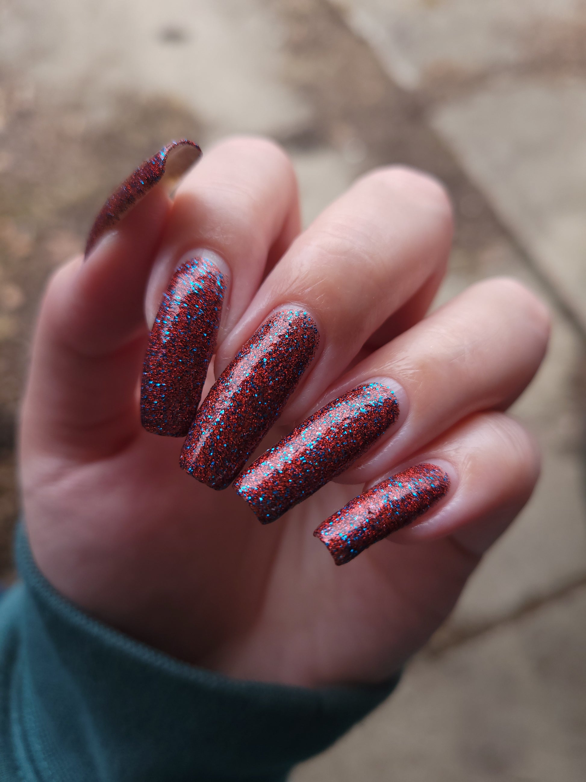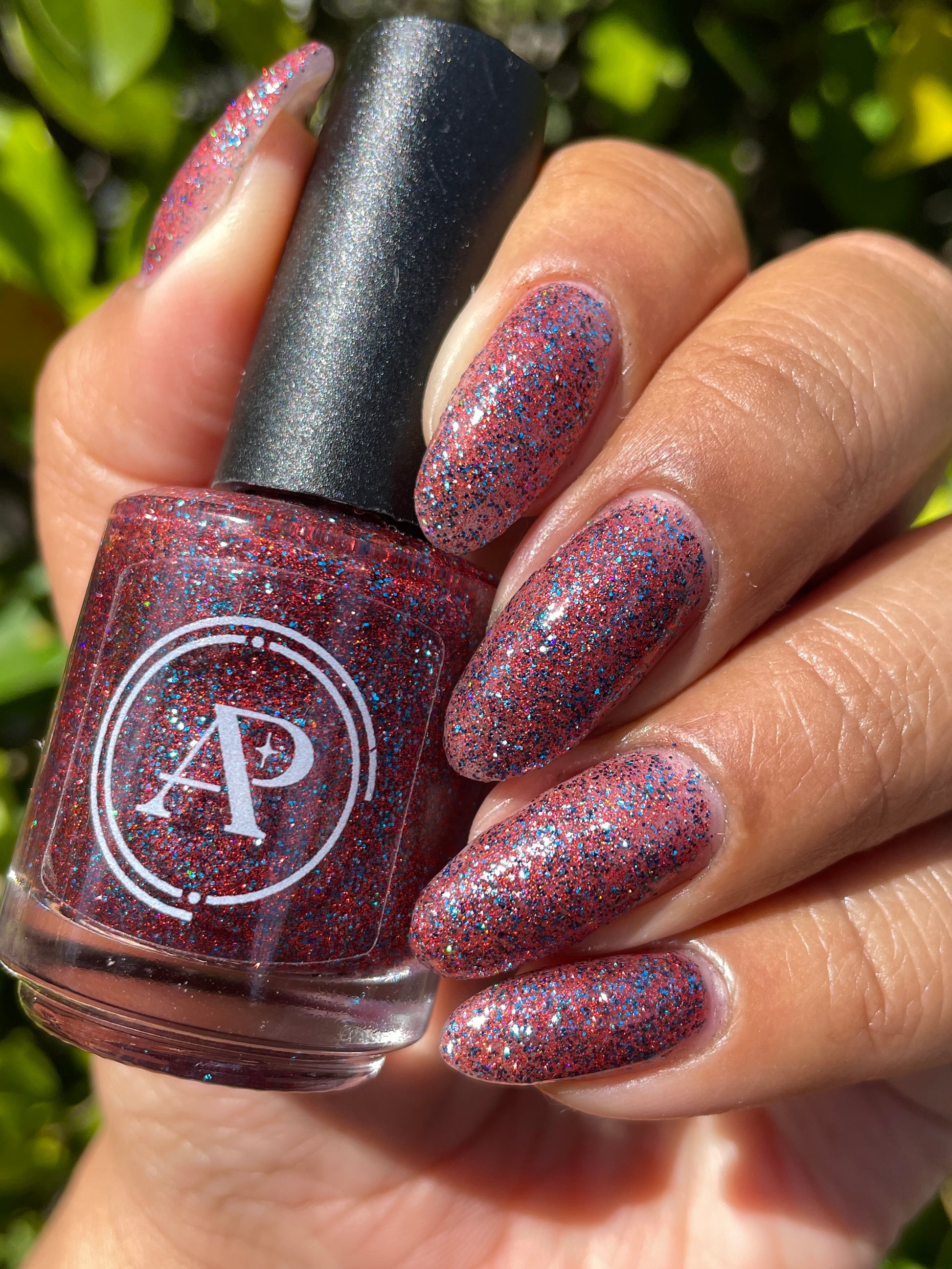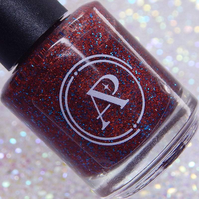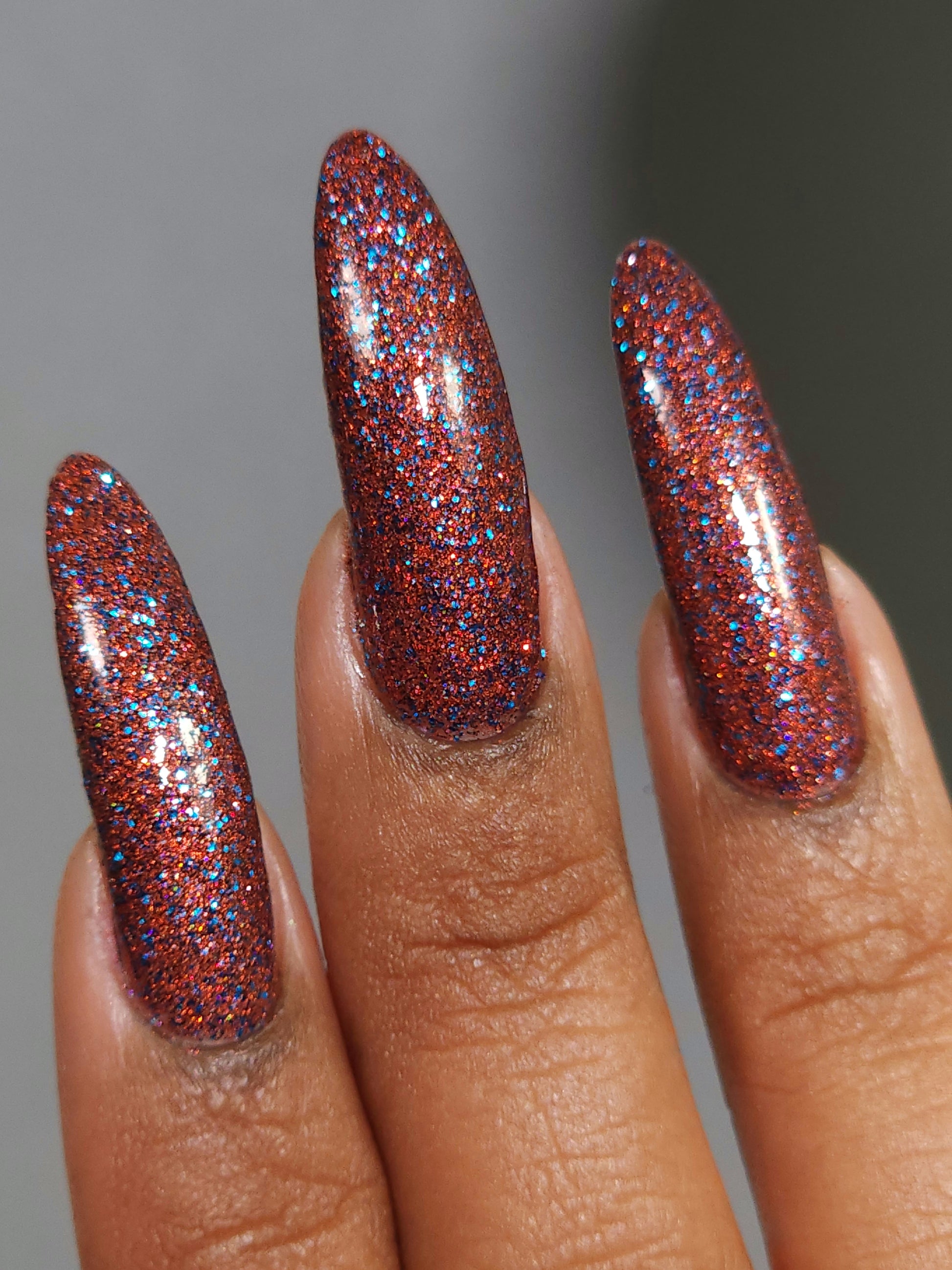 "The Bridge" is a full coverage glitter polish set in a clear base. It is loaded up with holographic black and red glitters and facets of blue holographic glitters. The bridge between worlds is a very strange place.