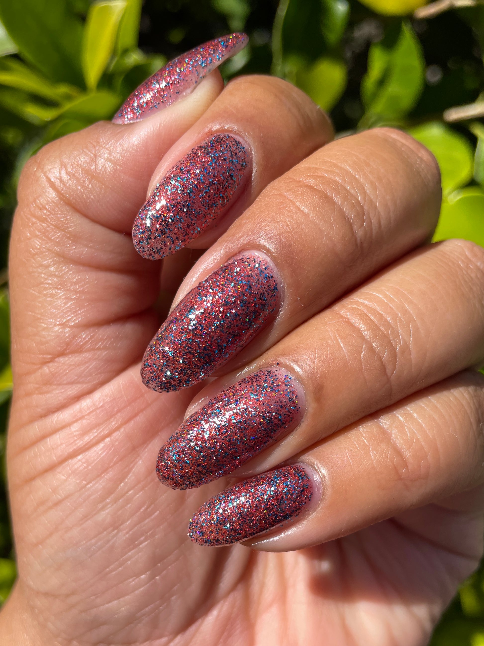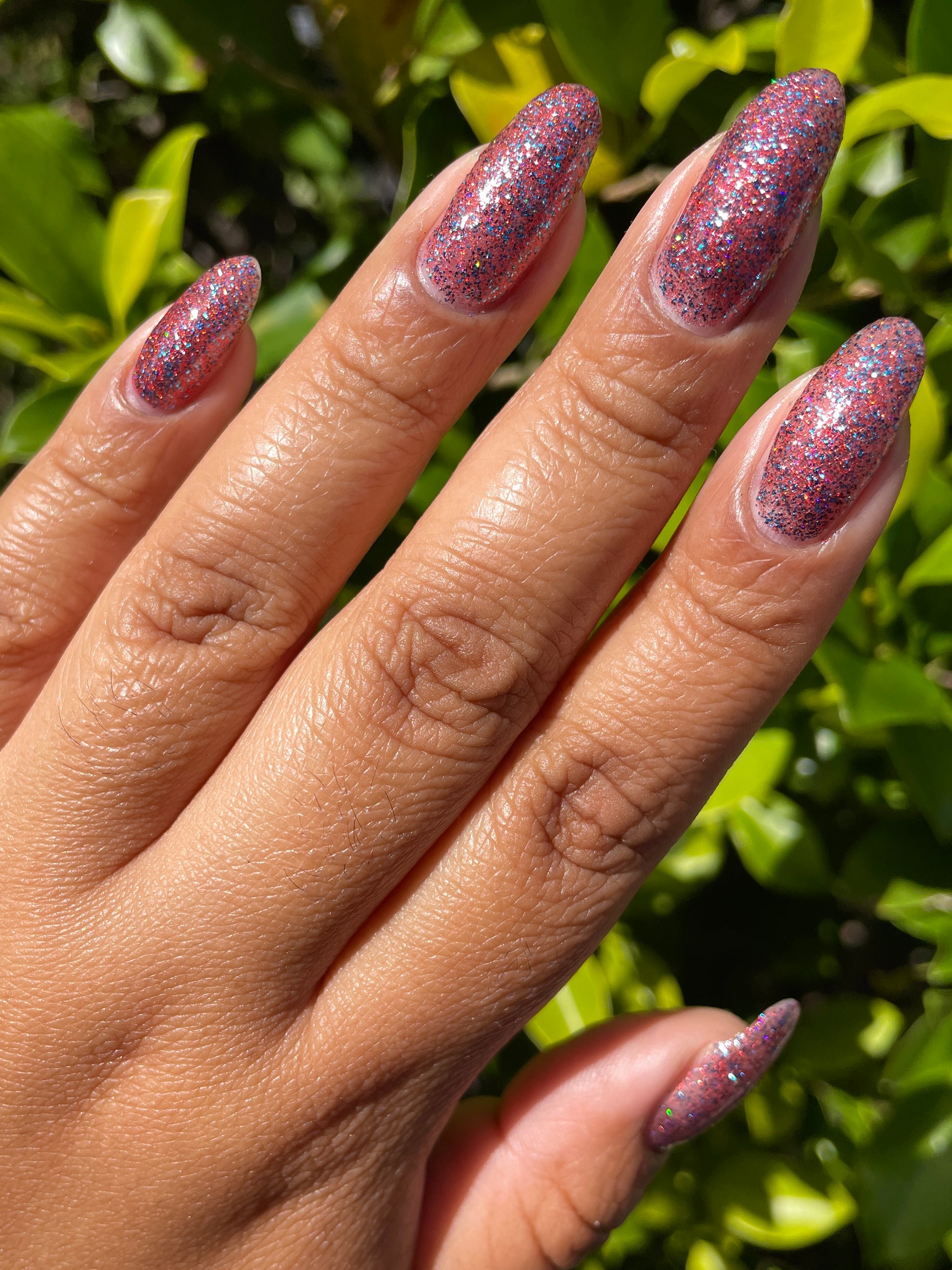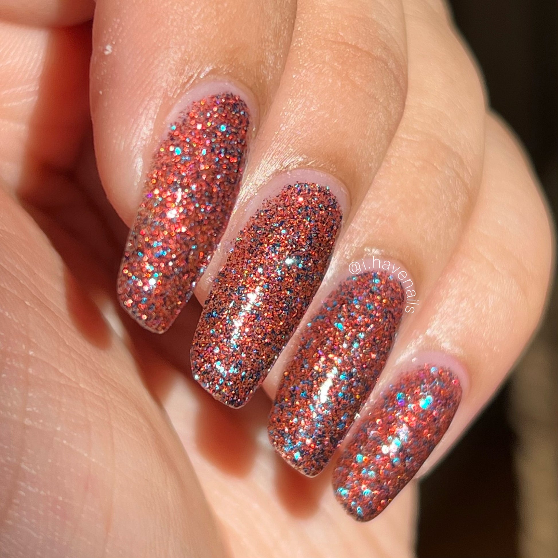 Very sparkly and true to photos on the listing. I'm happy with the application and dry time as well. Was easy to fix any accidental mess ups too, which is always a bonus as I tend to get impatient and mess my nails up.