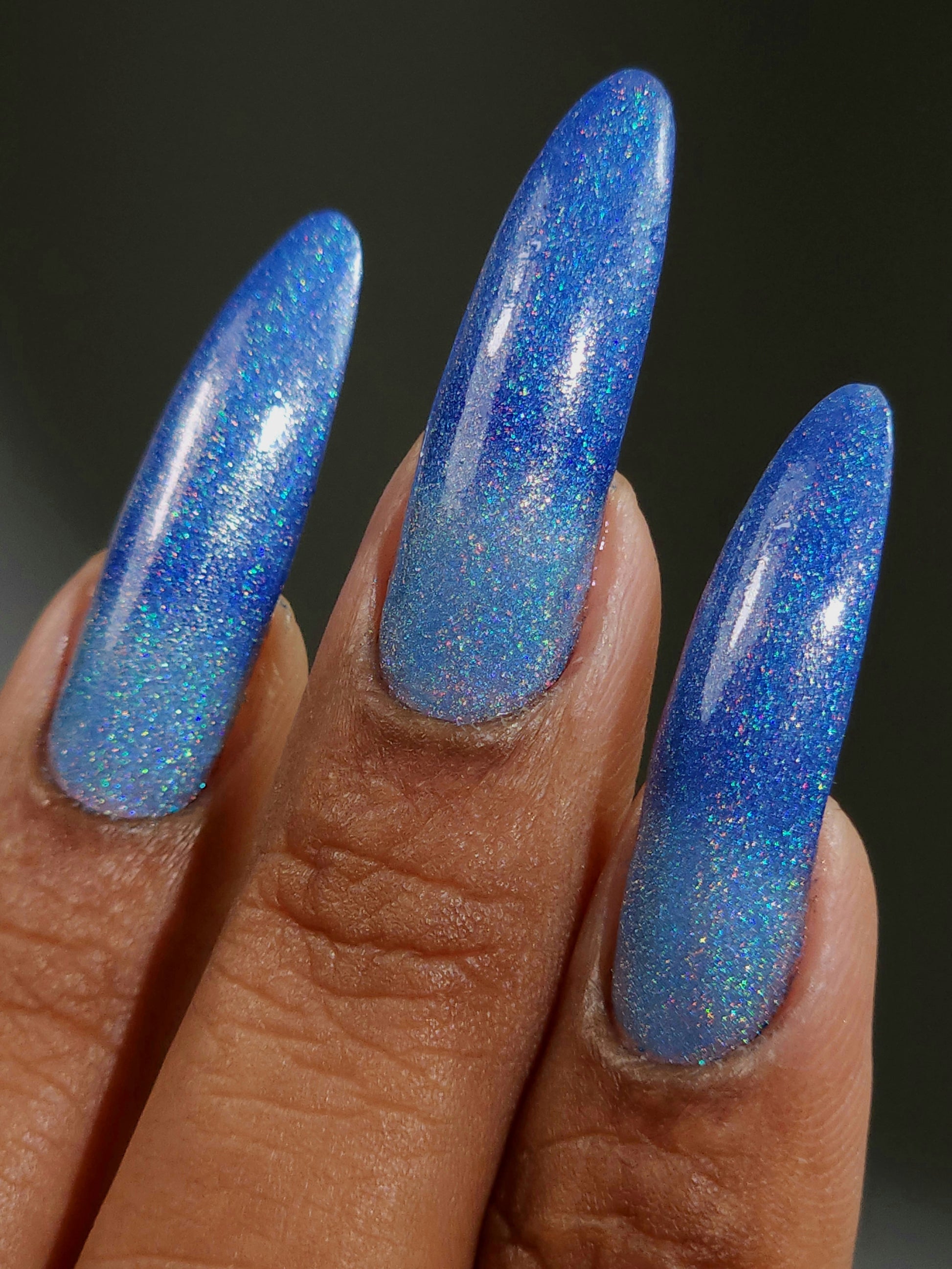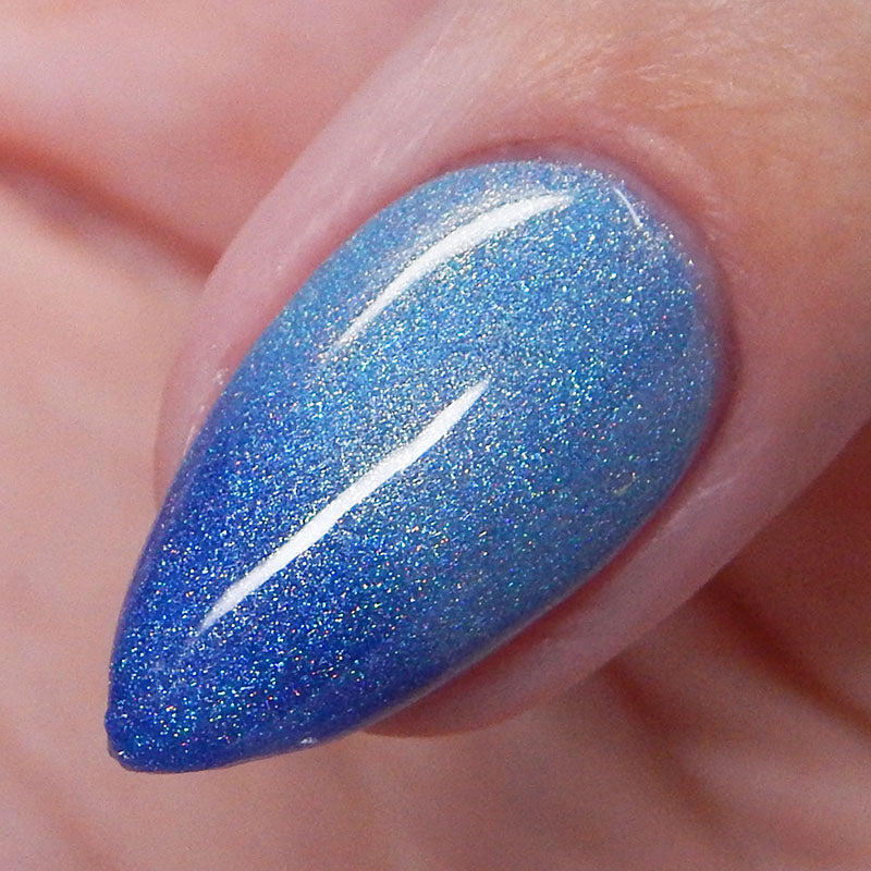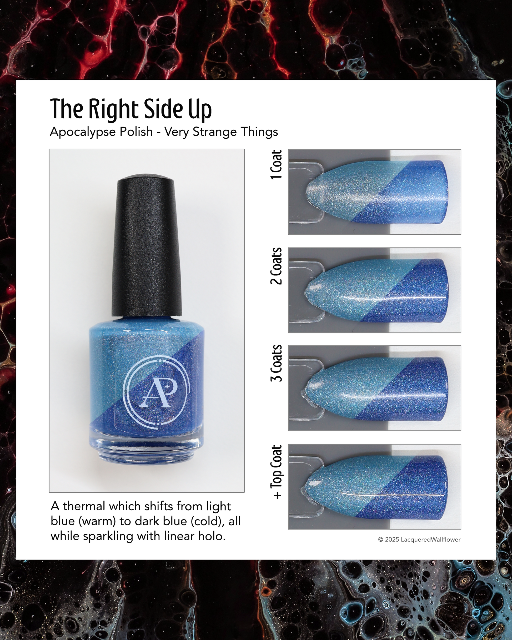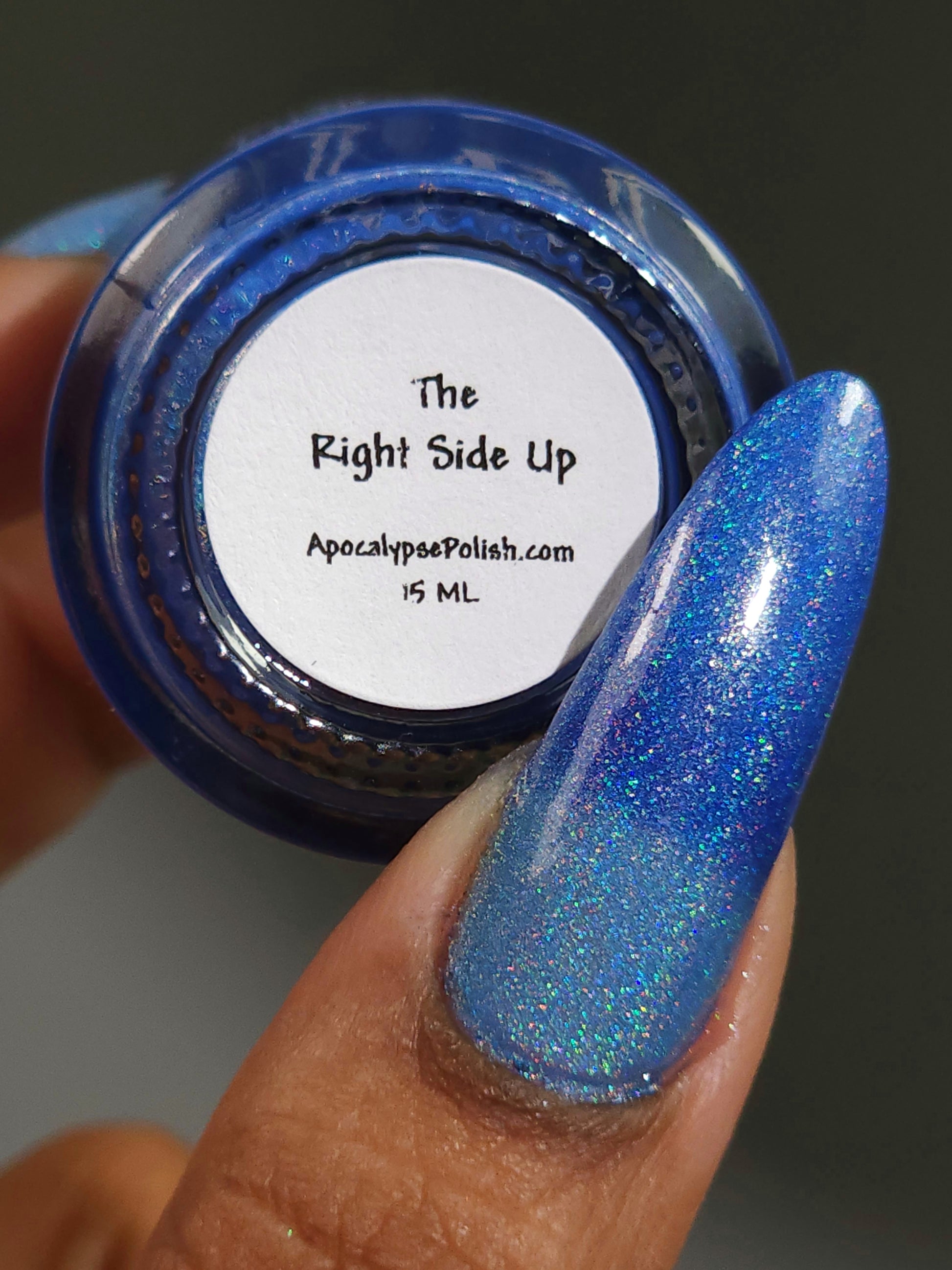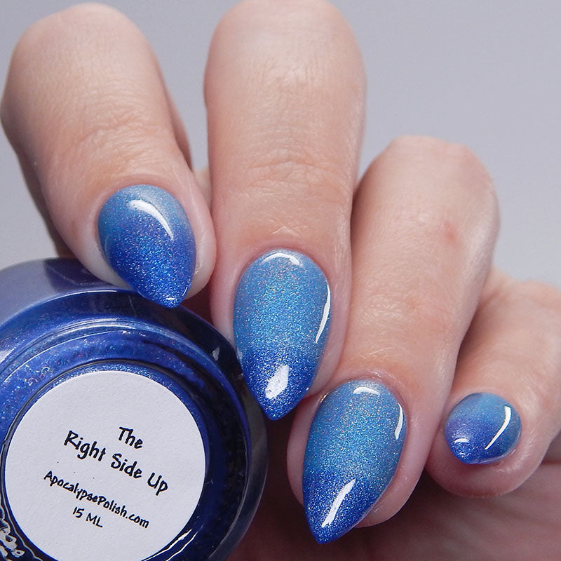 "The Right Side Up" is a holographic thermal, which shifts from light blue to dark blue, all while shimmering with an intense linear holo.