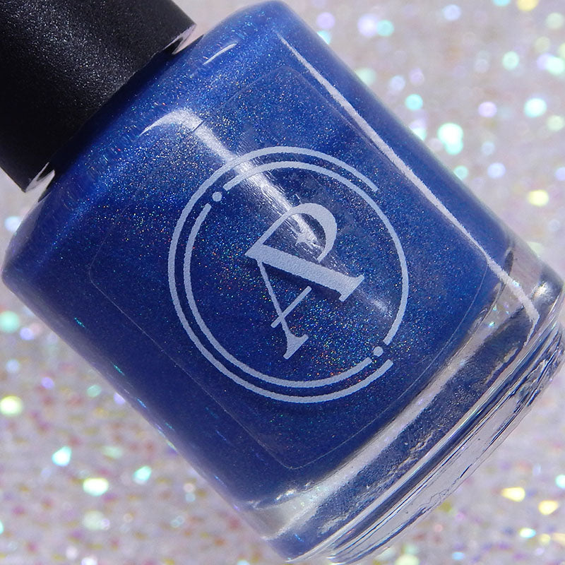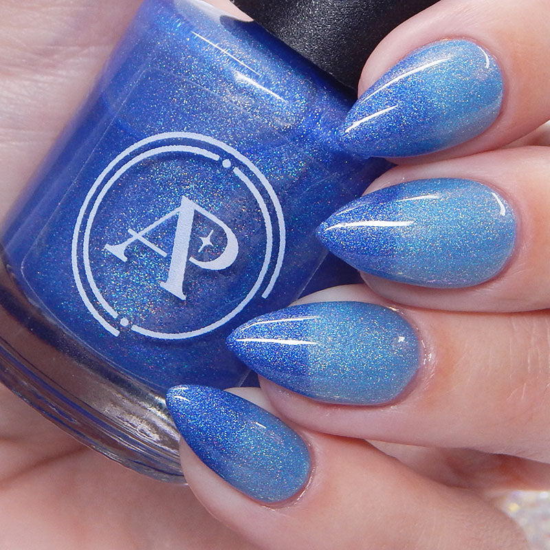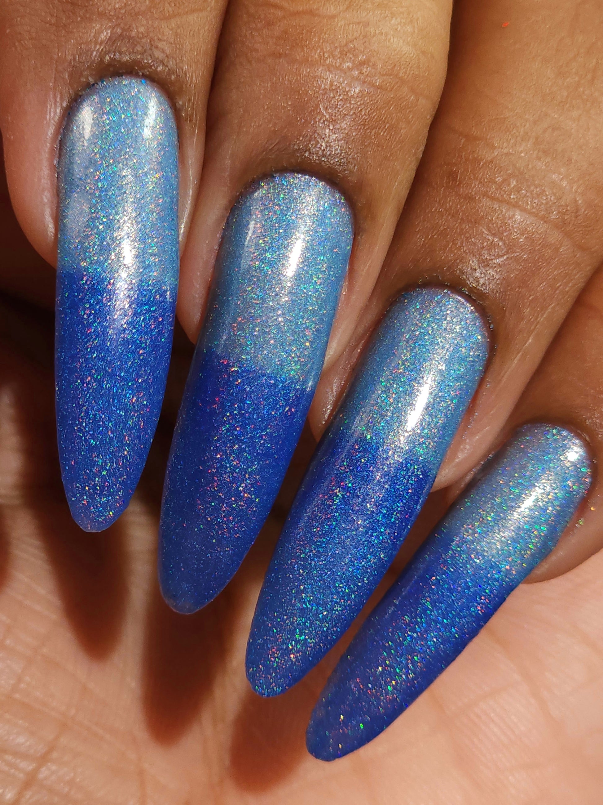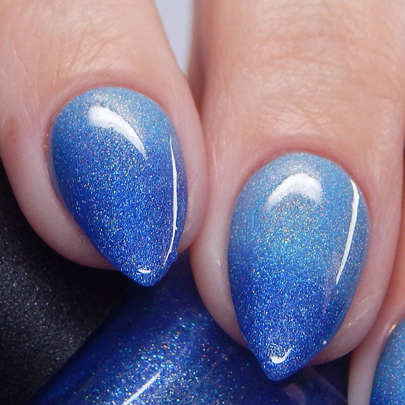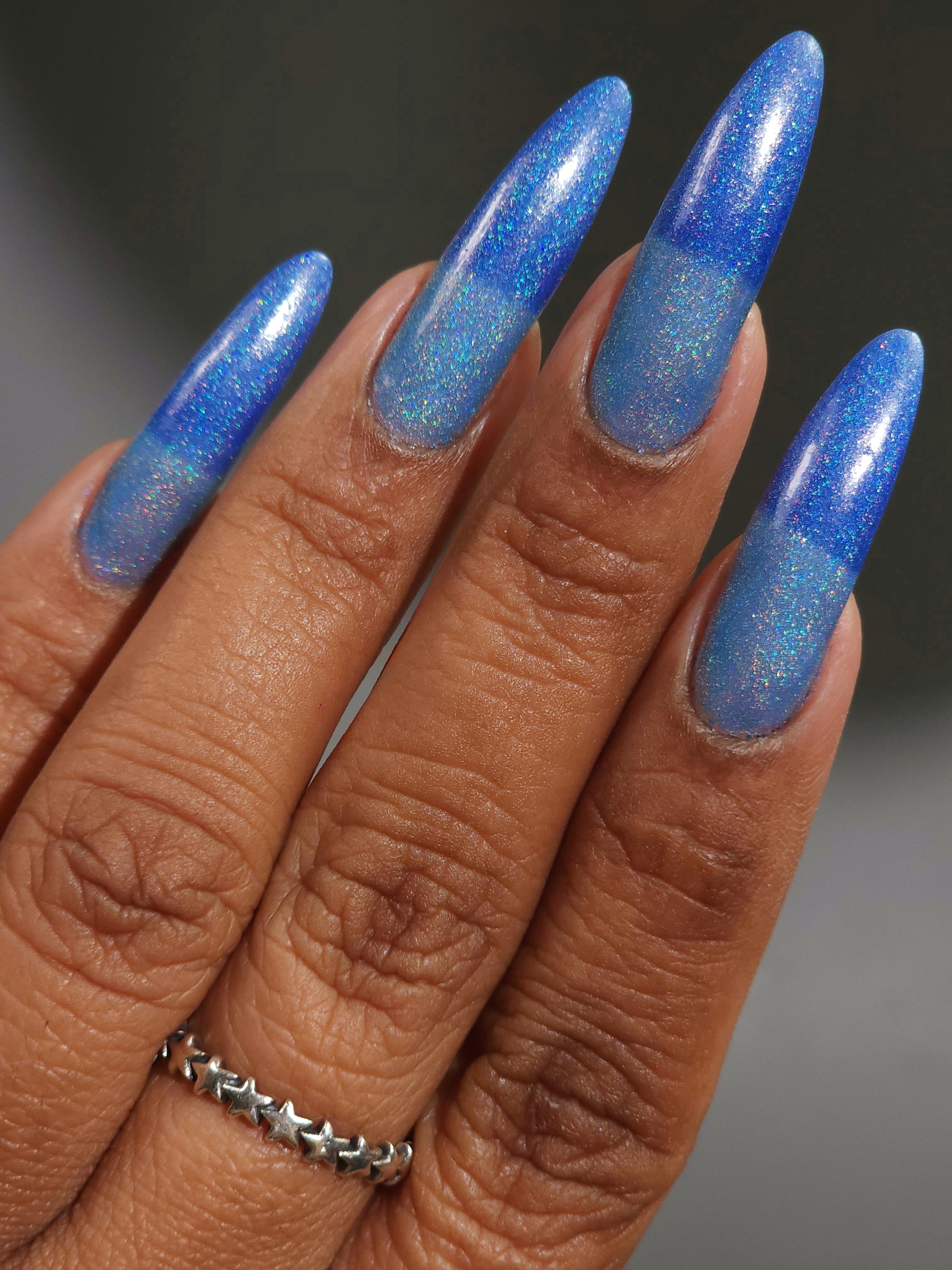 "The Right Side Up" is a holographic thermal, which shifts from light blue to dark blue, all while shimmering with an intense linear holo.
