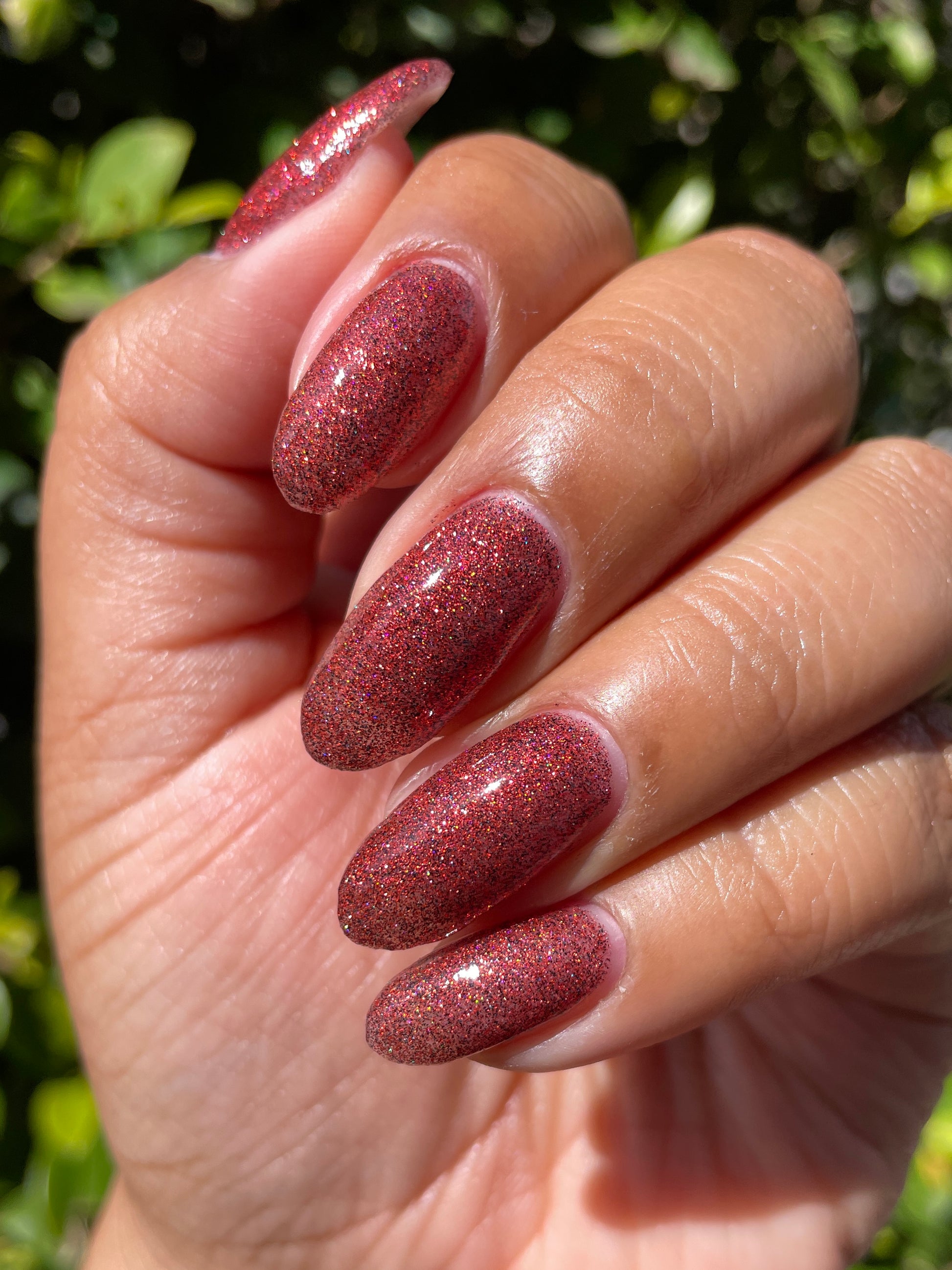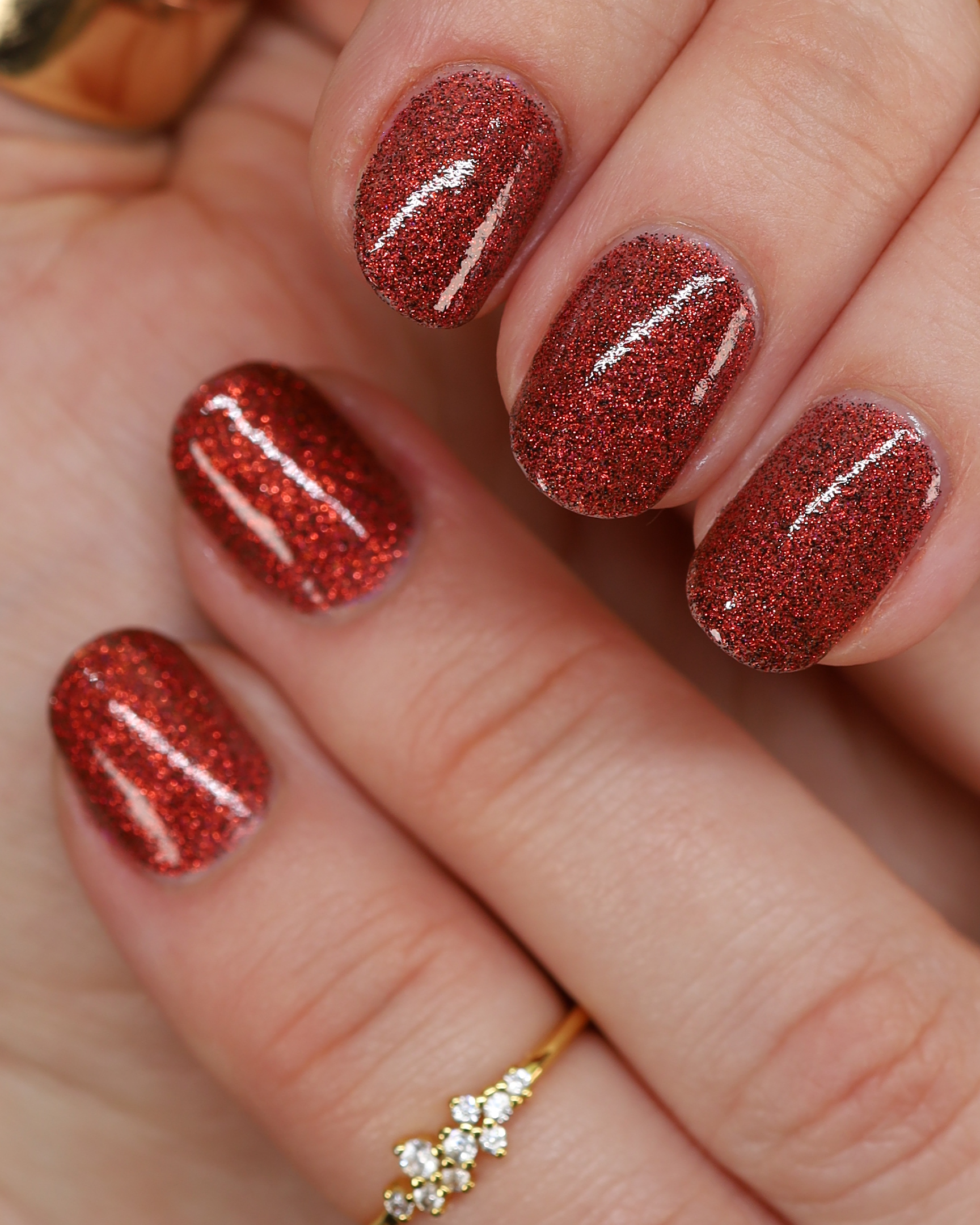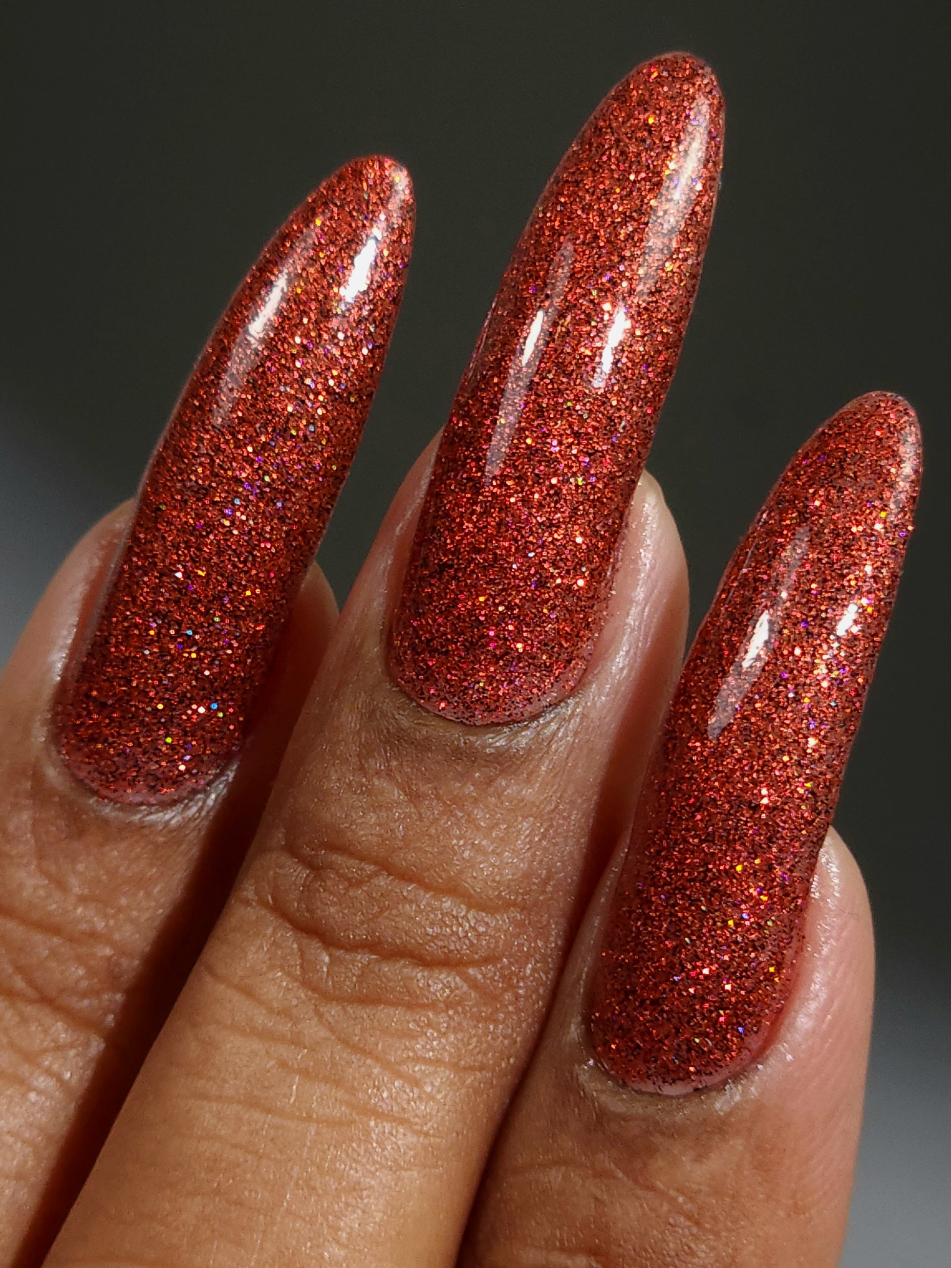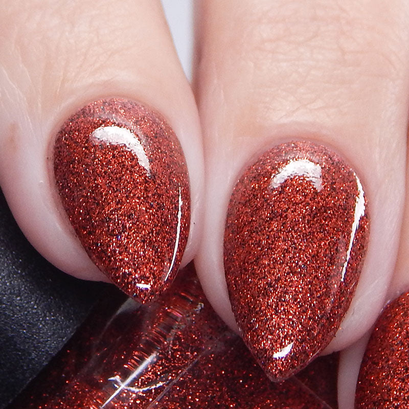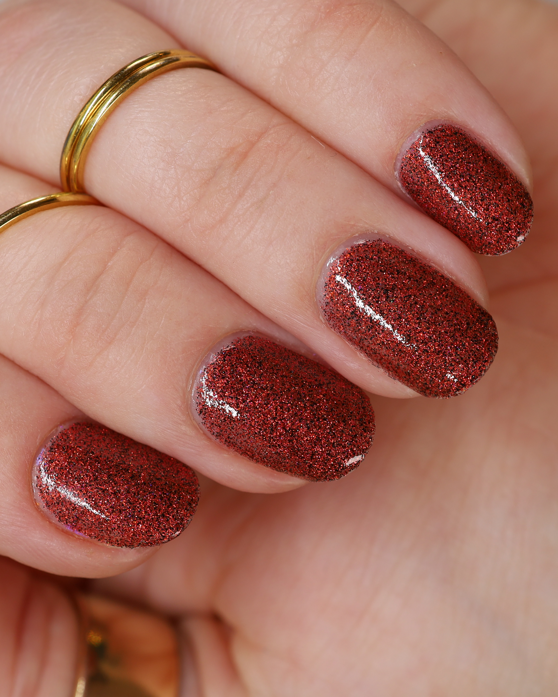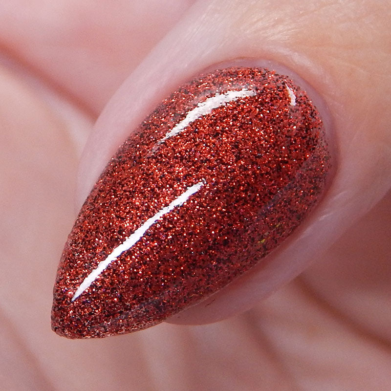 This shade can be sponged on in 1-2 coats or opaque in 3-4 coats with normal application. This particular glitter shade is slightly sparser so that it can be used as a topper over your favorite red, black or red-black multi-chrome shade.