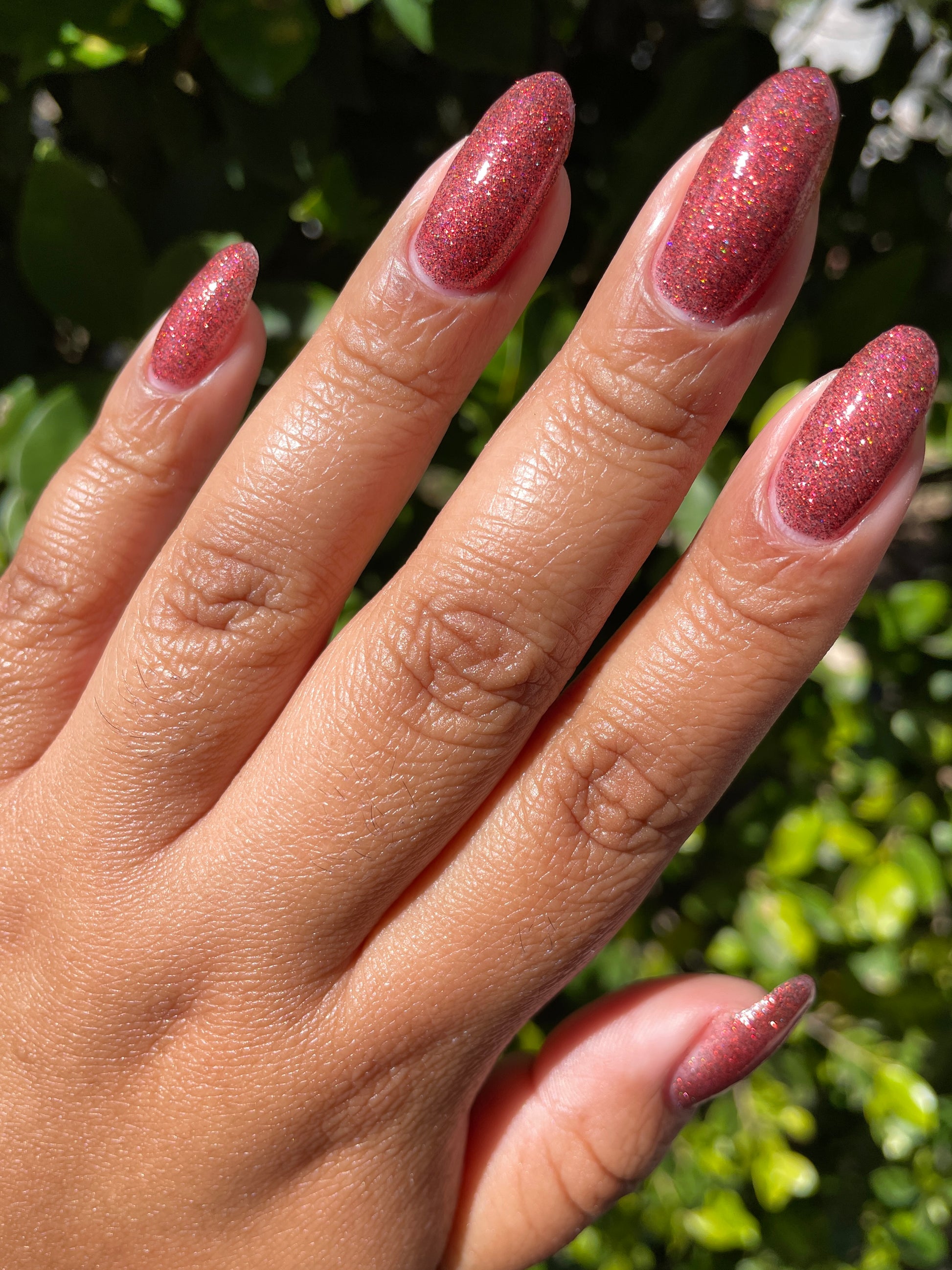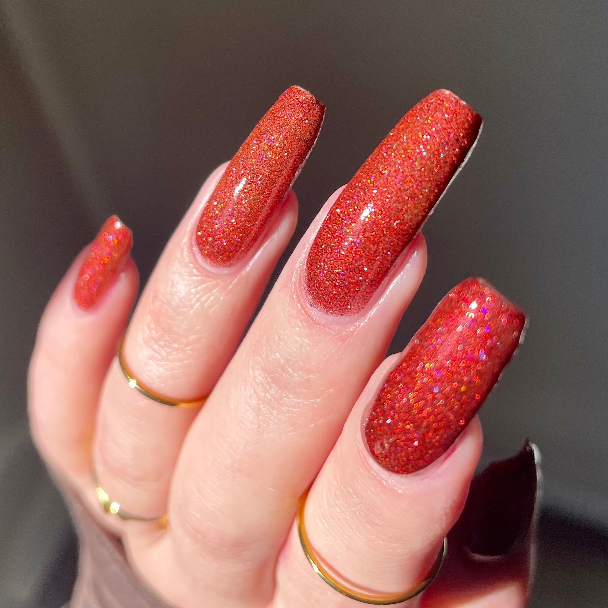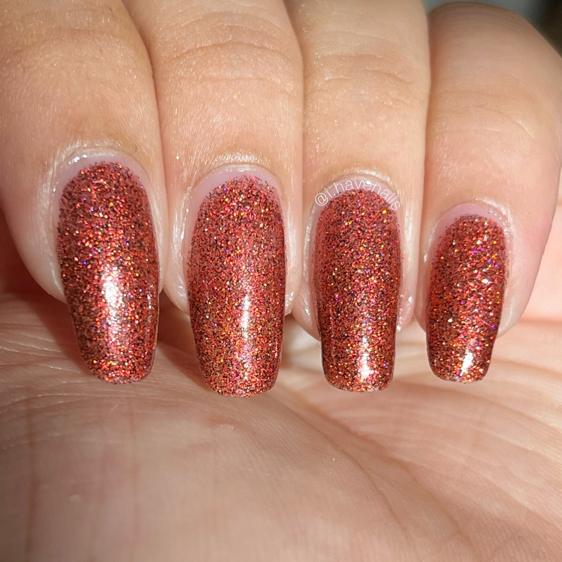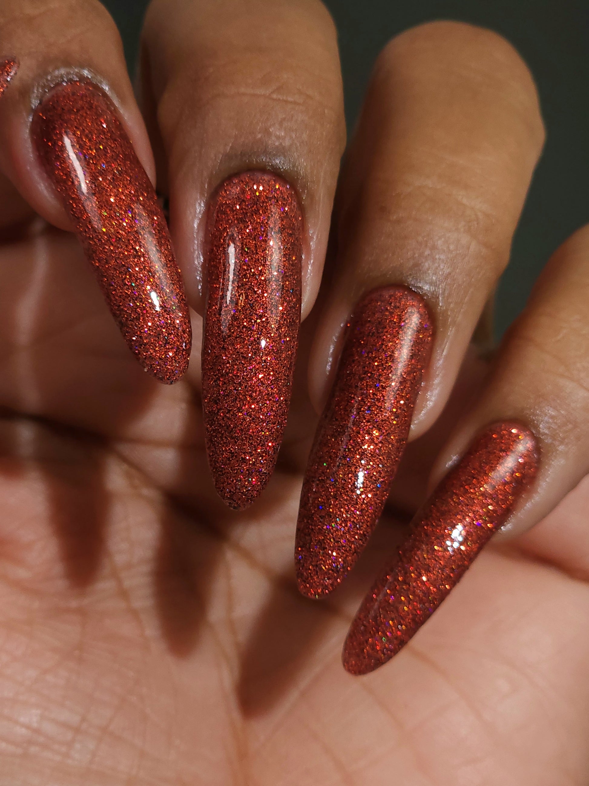 This shade can be sponged on in 1-2 coats or opaque in 3-4 coats with normal application. This particular glitter shade is slightly sparser so that it can be used as a topper over your favorite red, black or red-black multi-chrome shade.