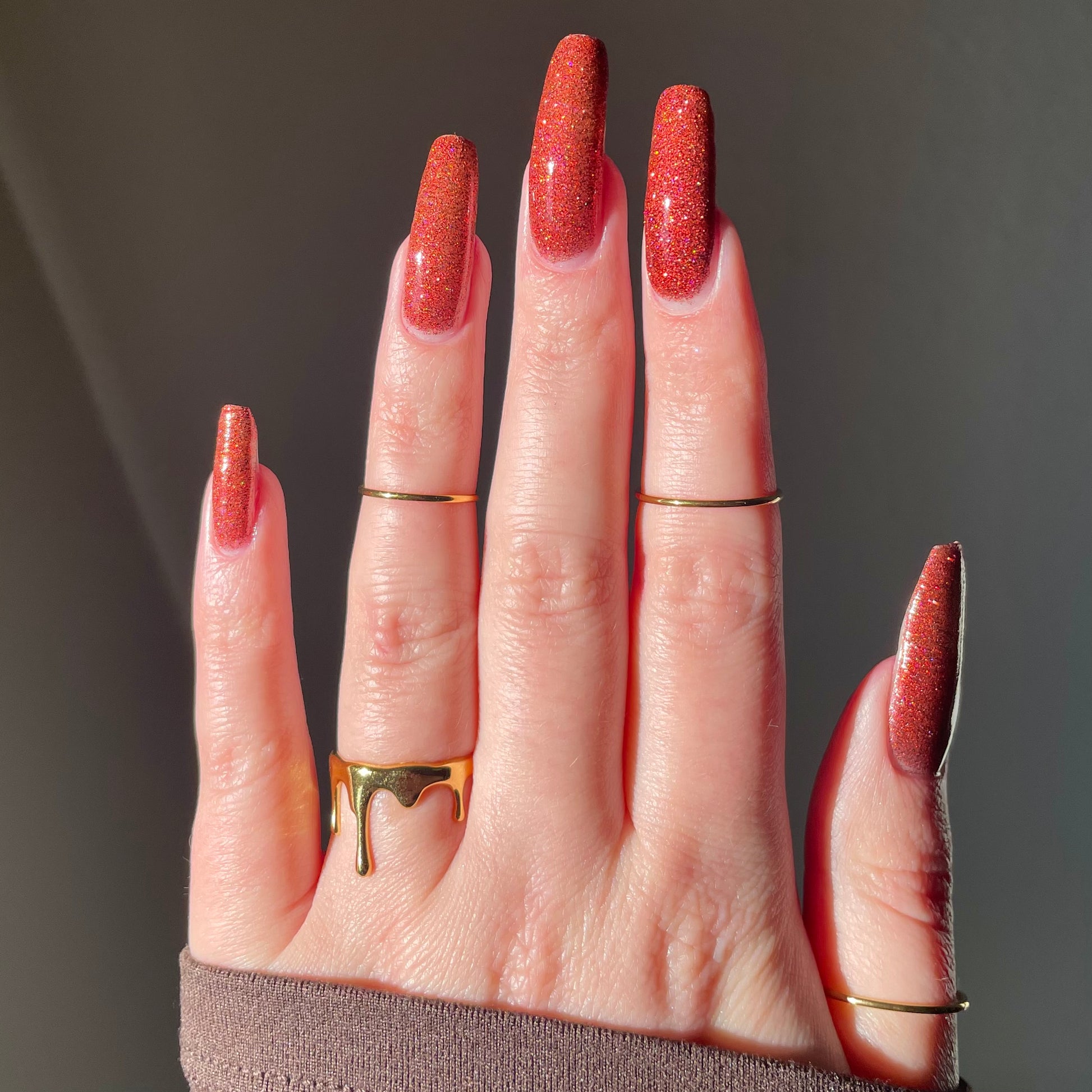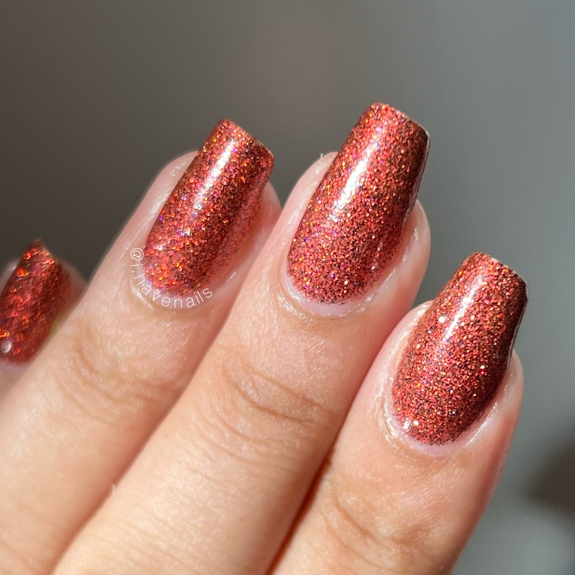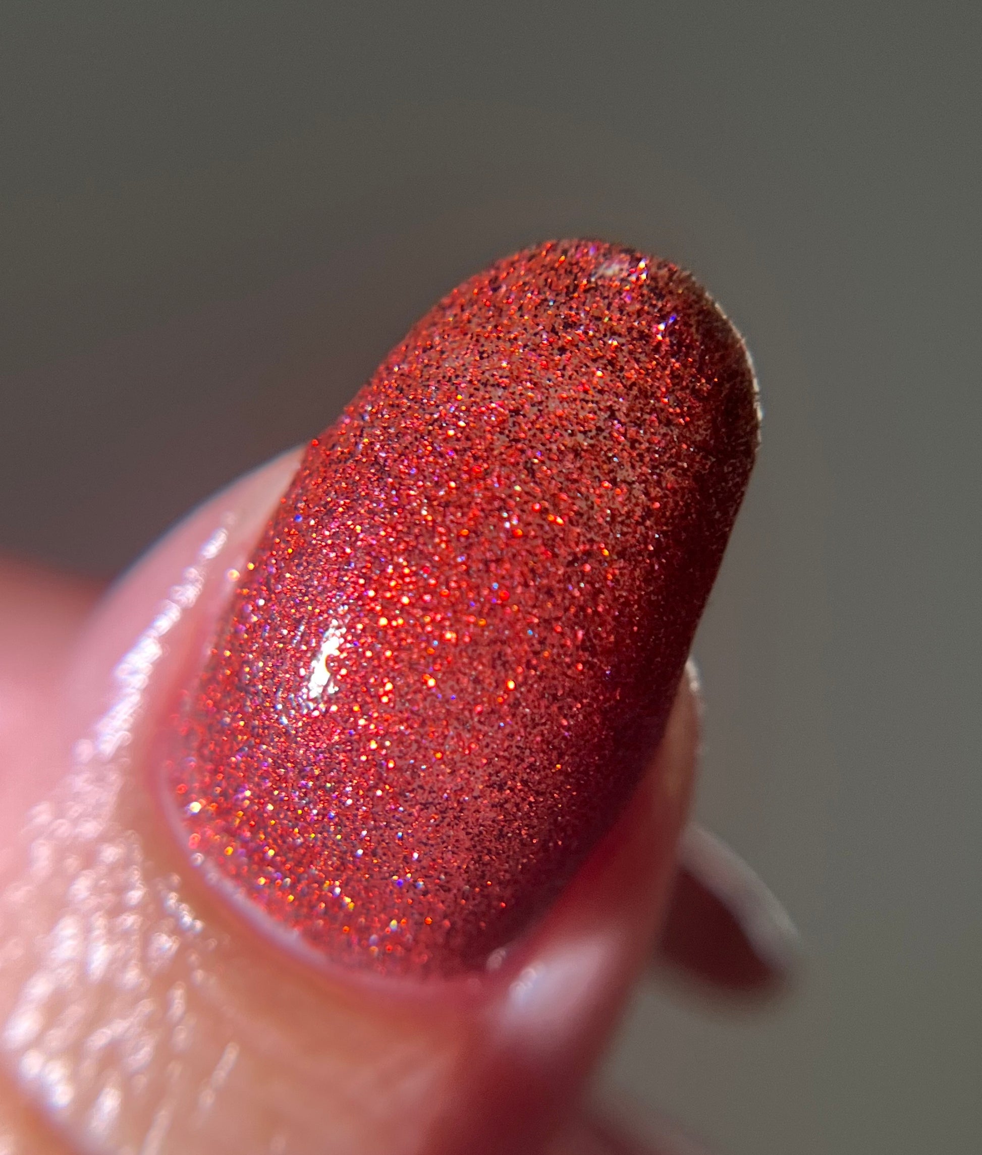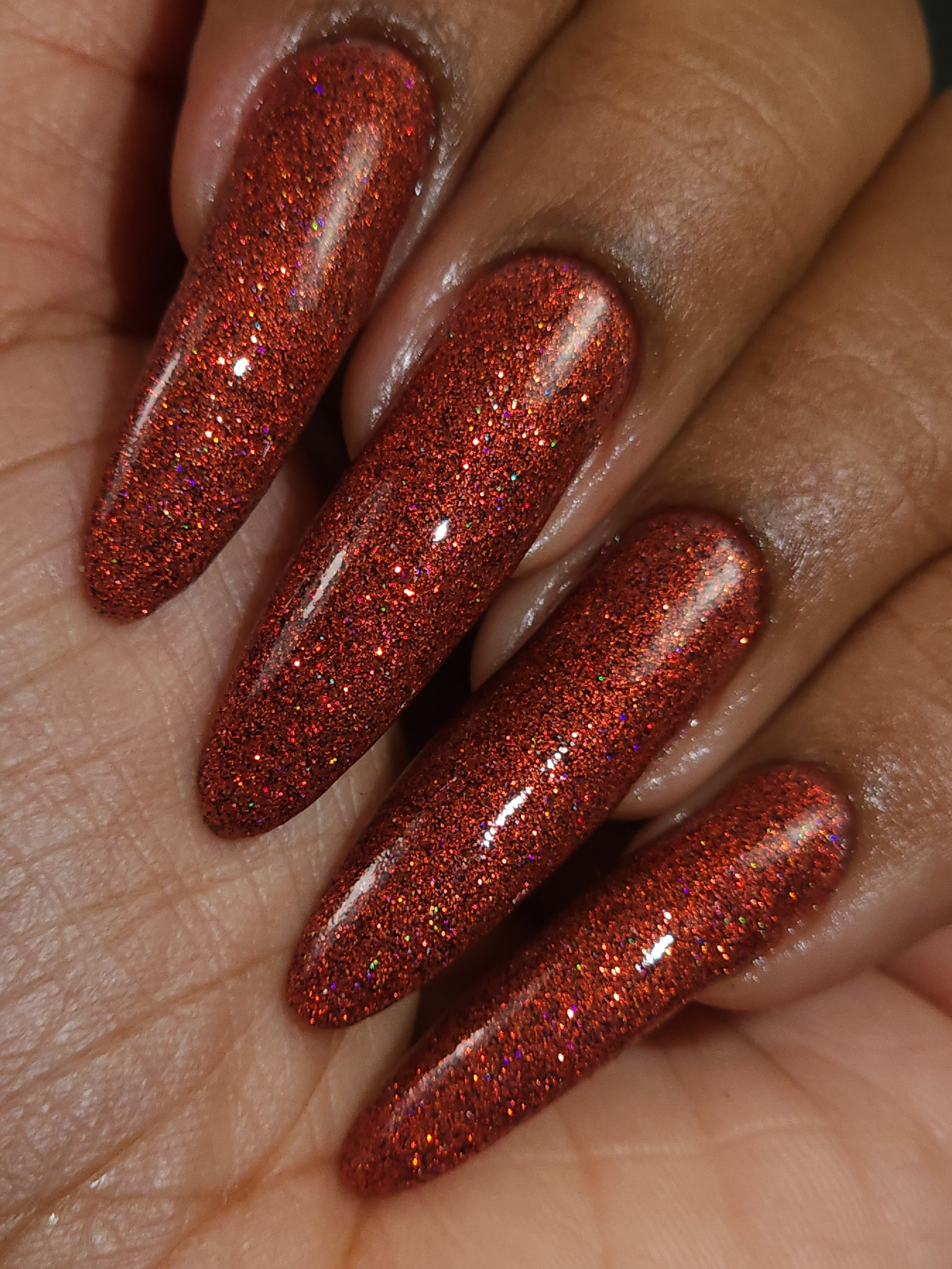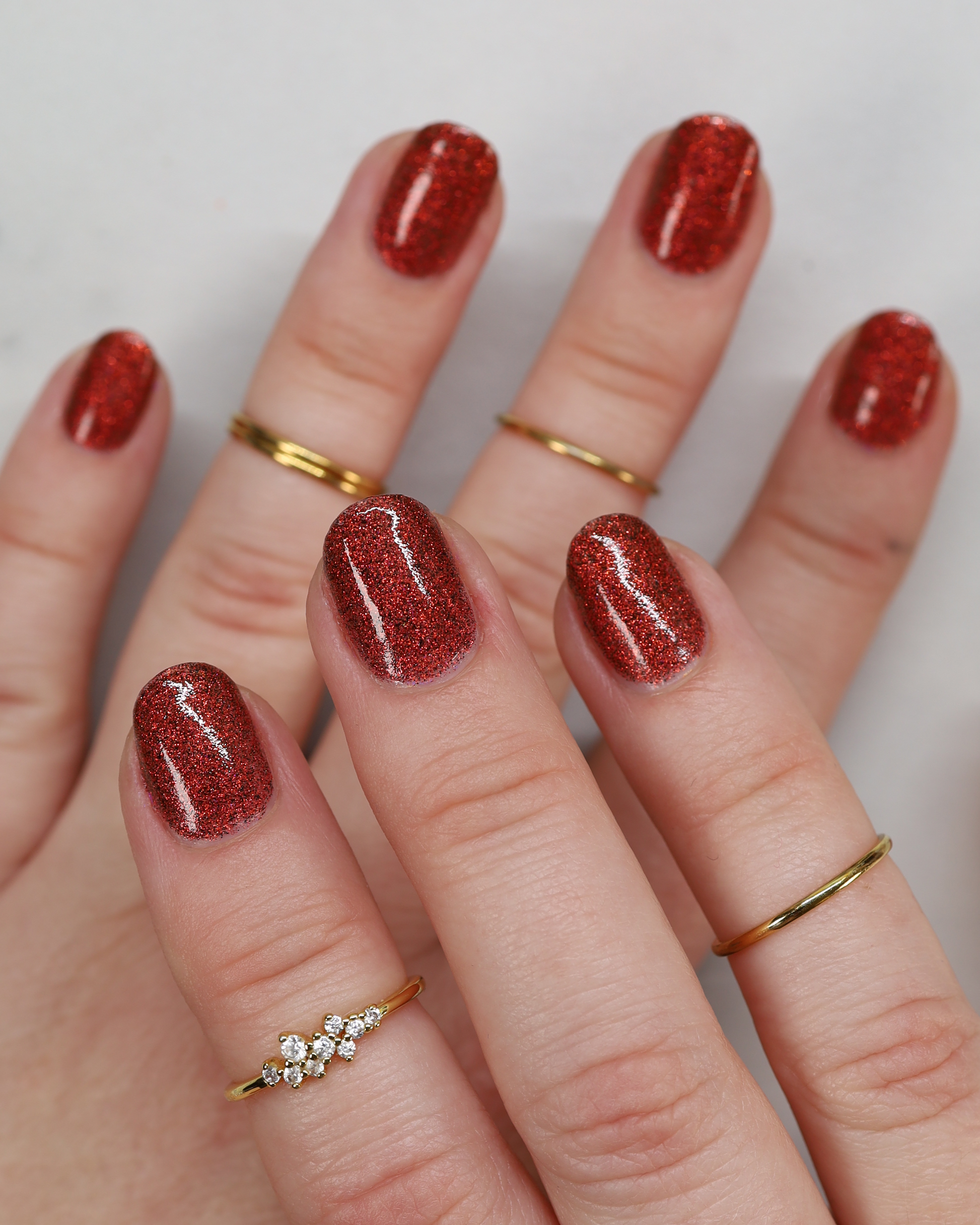 This shade can be sponged on in 1-2 coats or opaque in 3-4 coats with normal application. This particular glitter shade is slightly sparser so that it can be used as a topper over your favorite red, black or red-black multi-chrome shade.