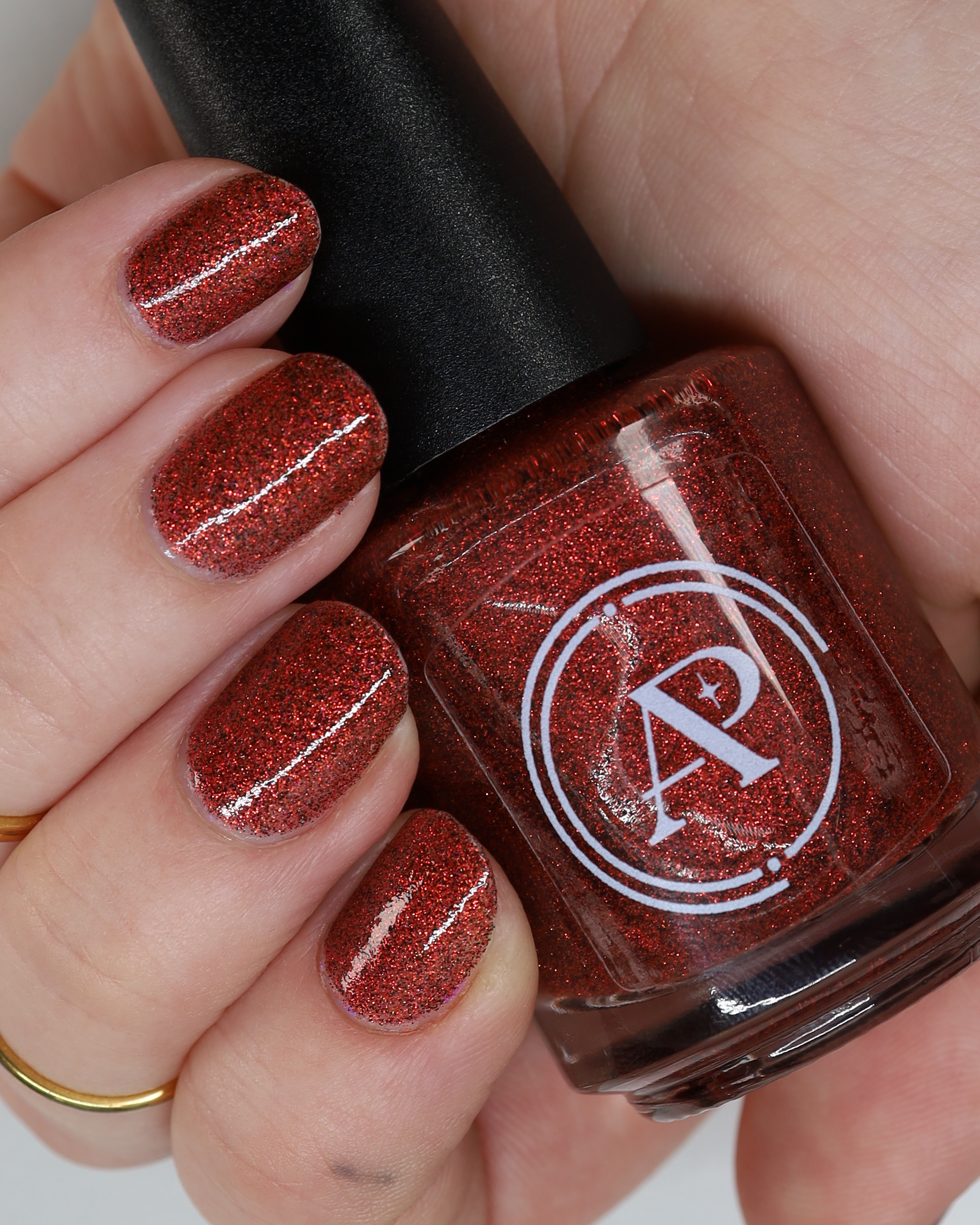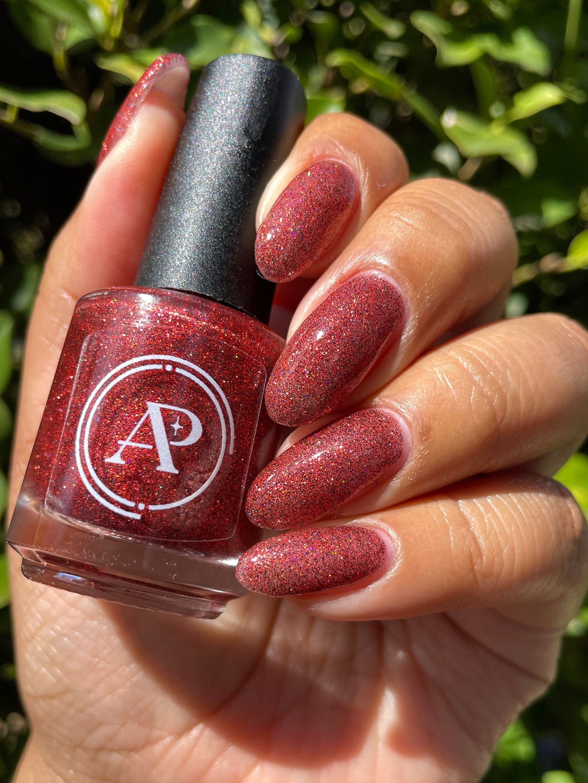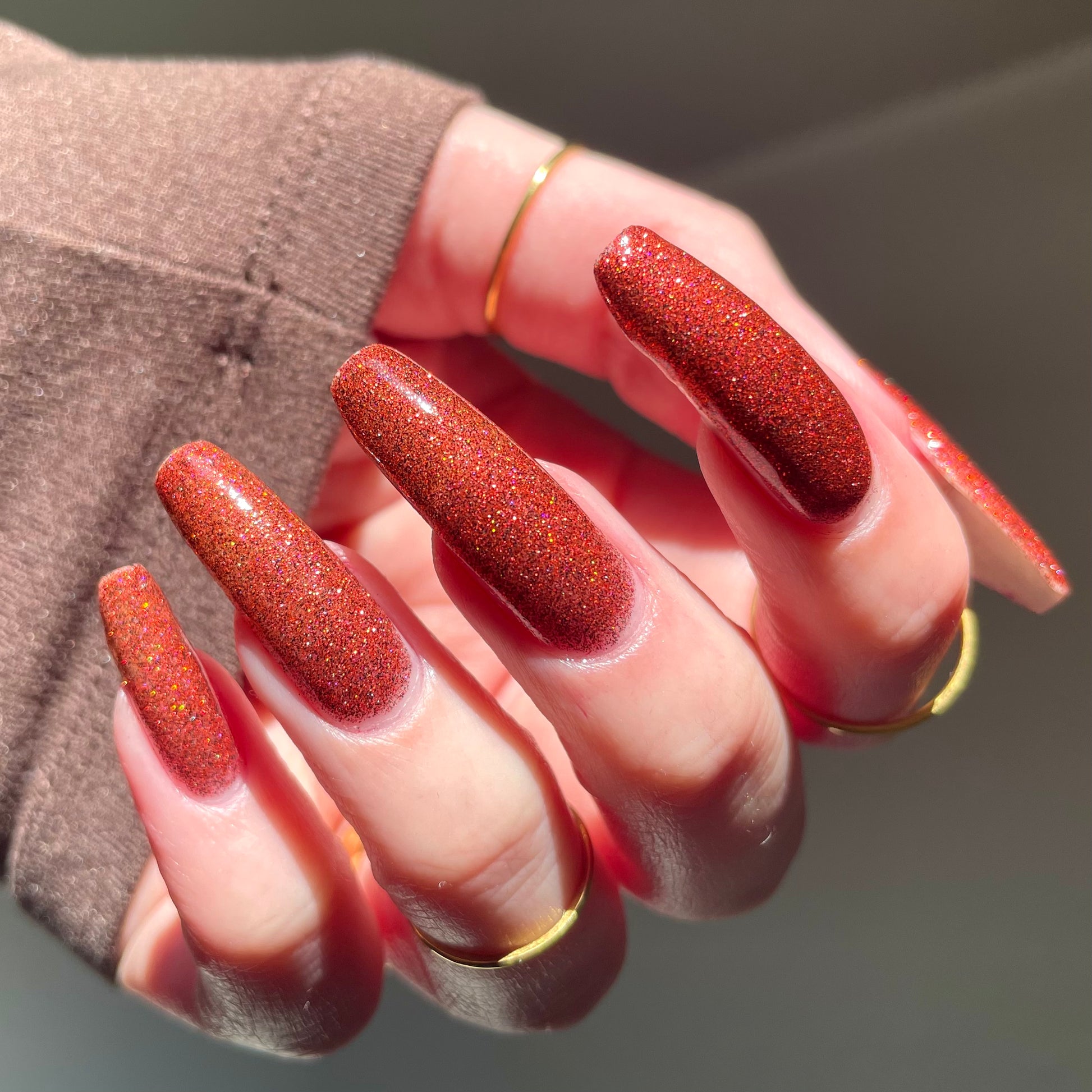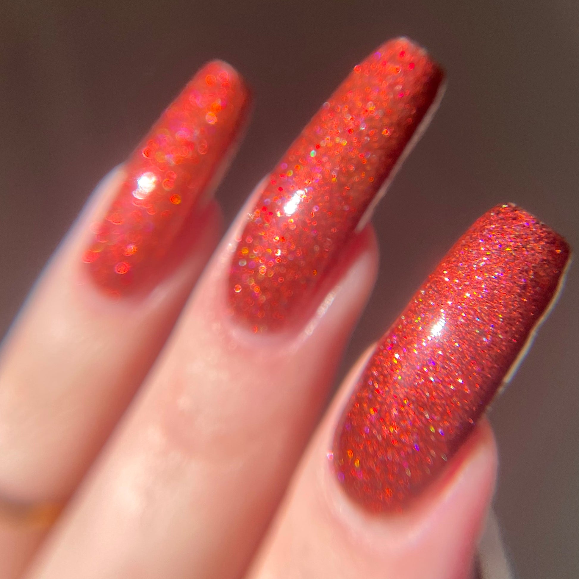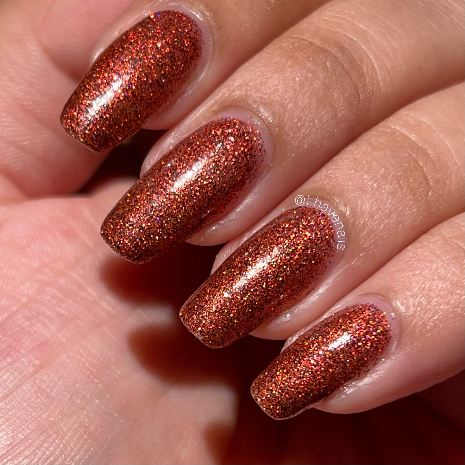 This shade can be sponged on in 1-2 coats or opaque in 3-4 coats with normal application. This particular glitter shade is slightly sparser so that it can be used as a topper over your favorite red, black or red-black multi-chrome shade.