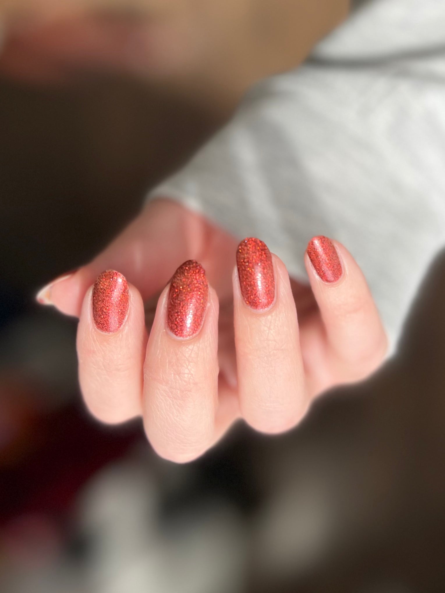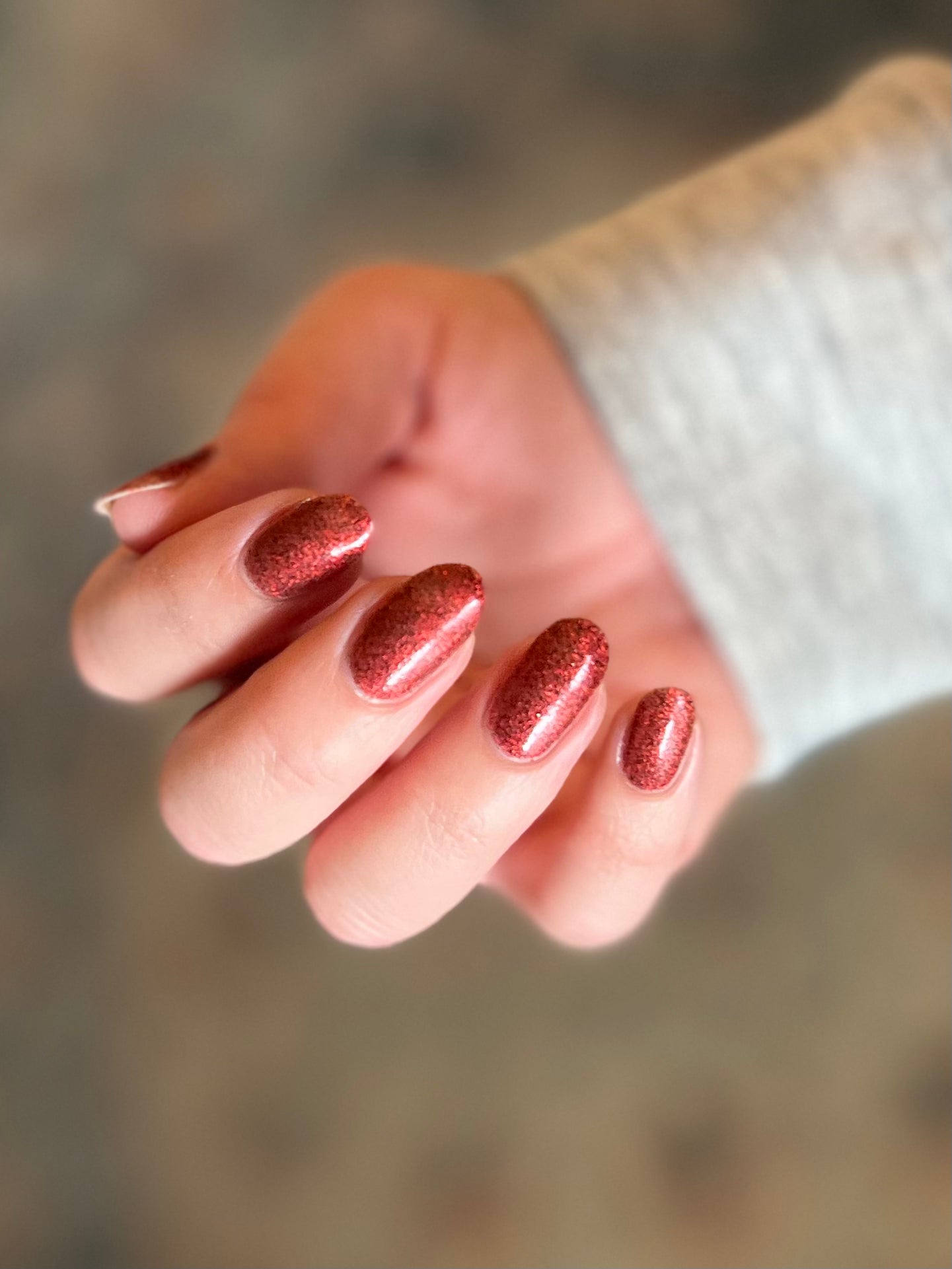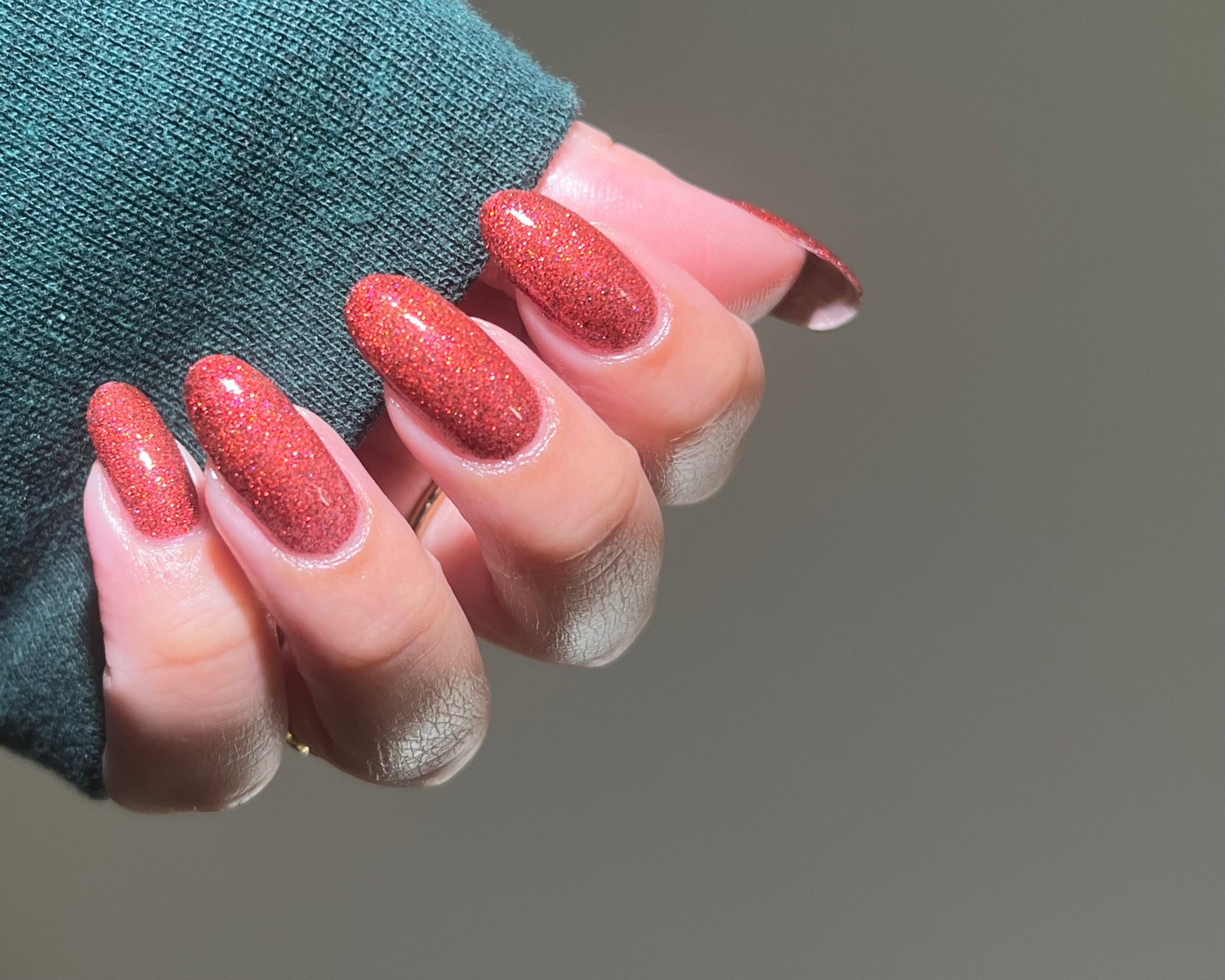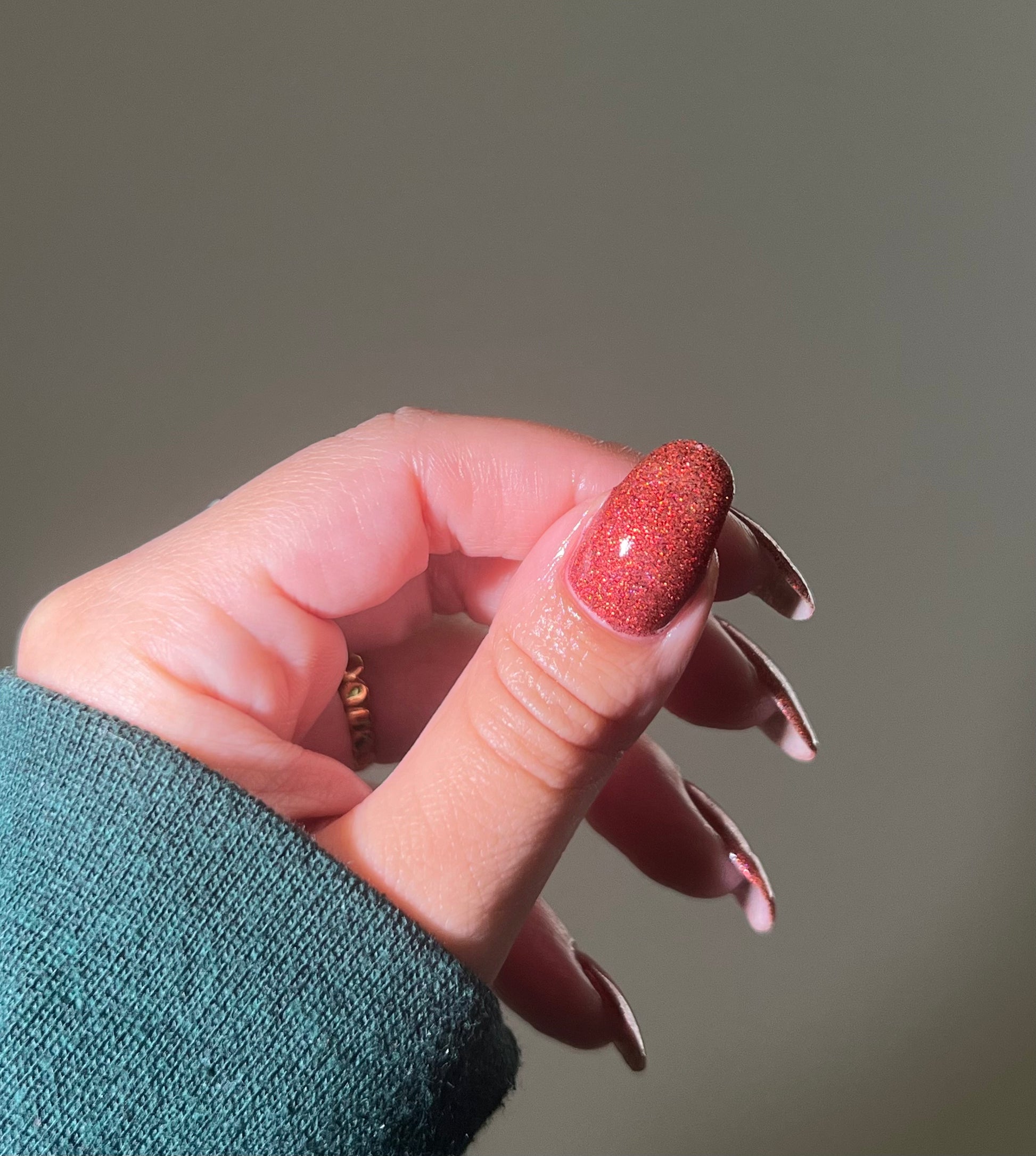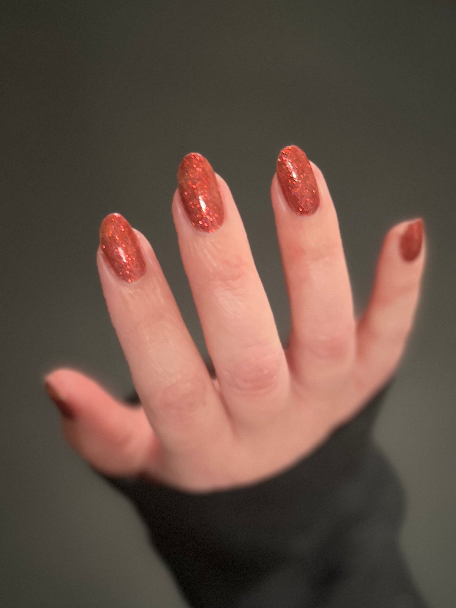This shade can be sponged on in 1-2 coats or opaque in 3-4 coats with normal application. This particular glitter shade is slightly sparser so that it can be used as a topper over your favorite red, black or red-black multi-chrome shade.