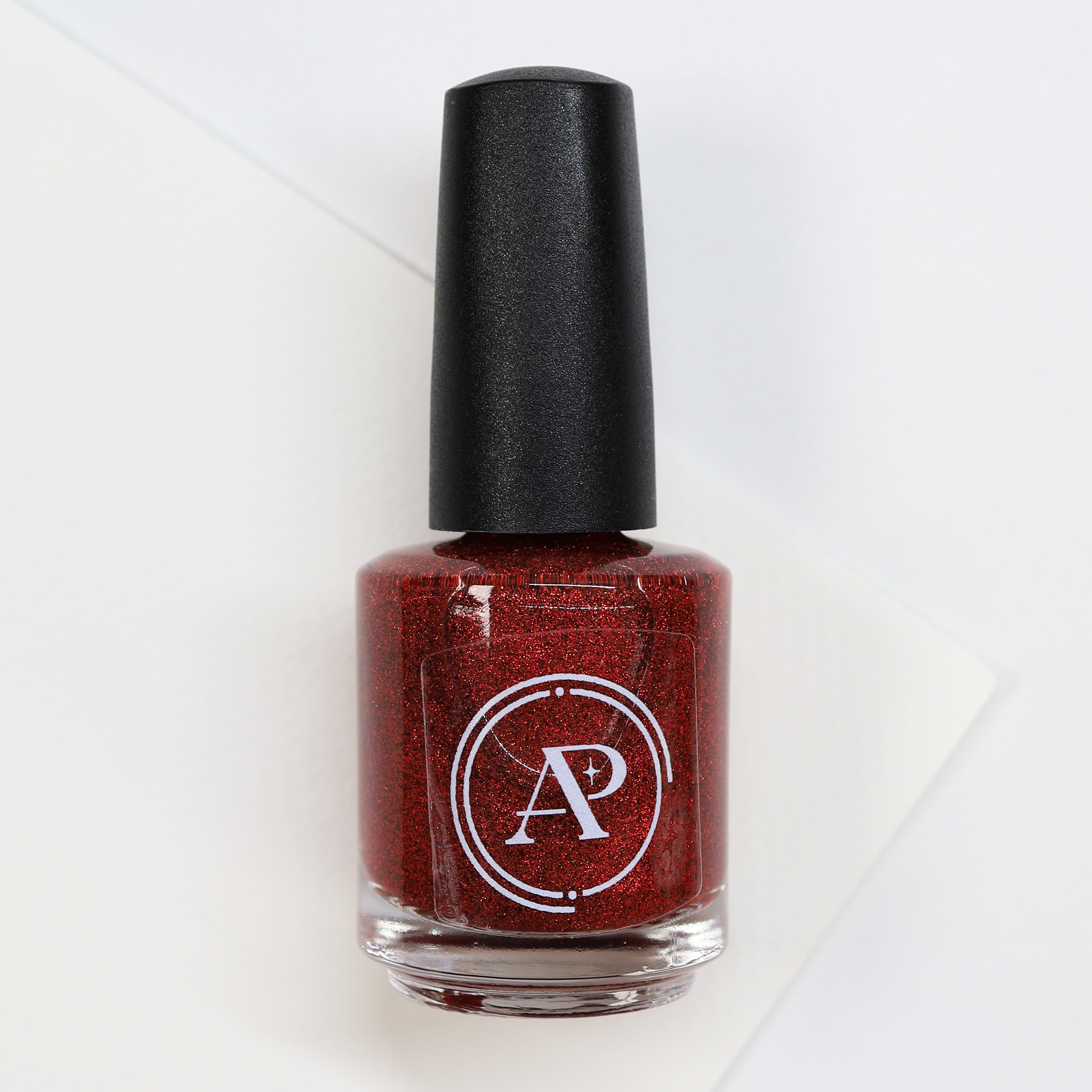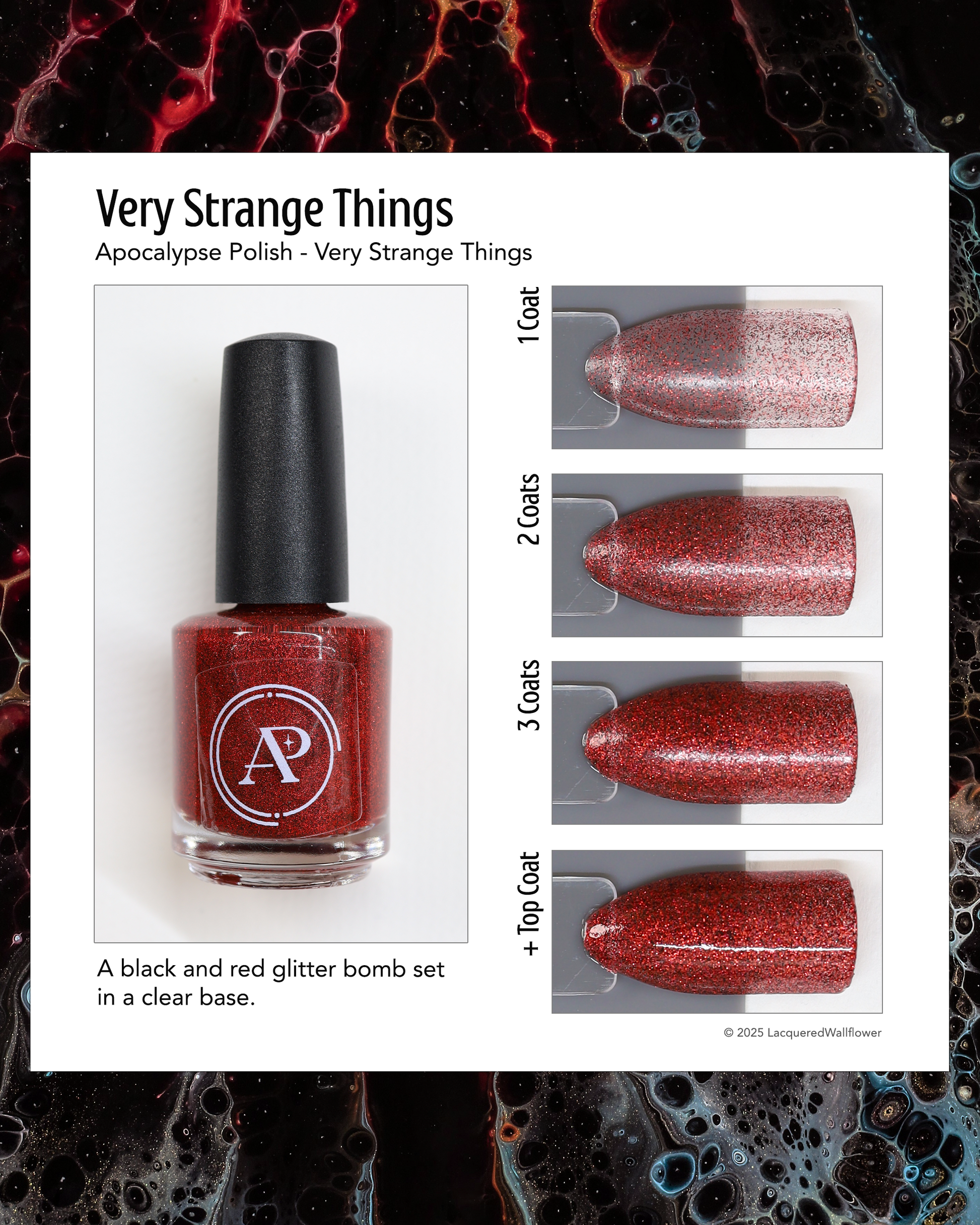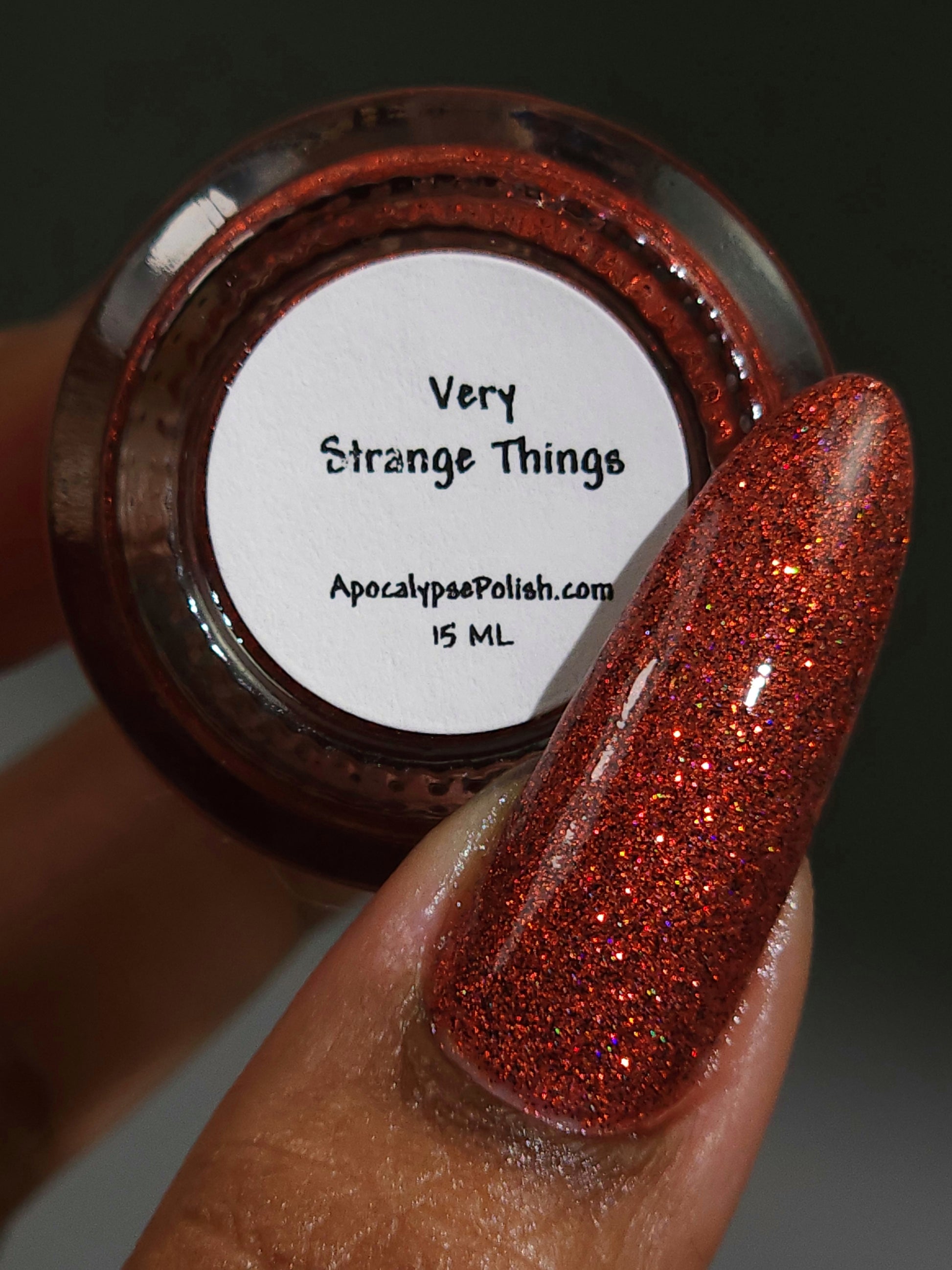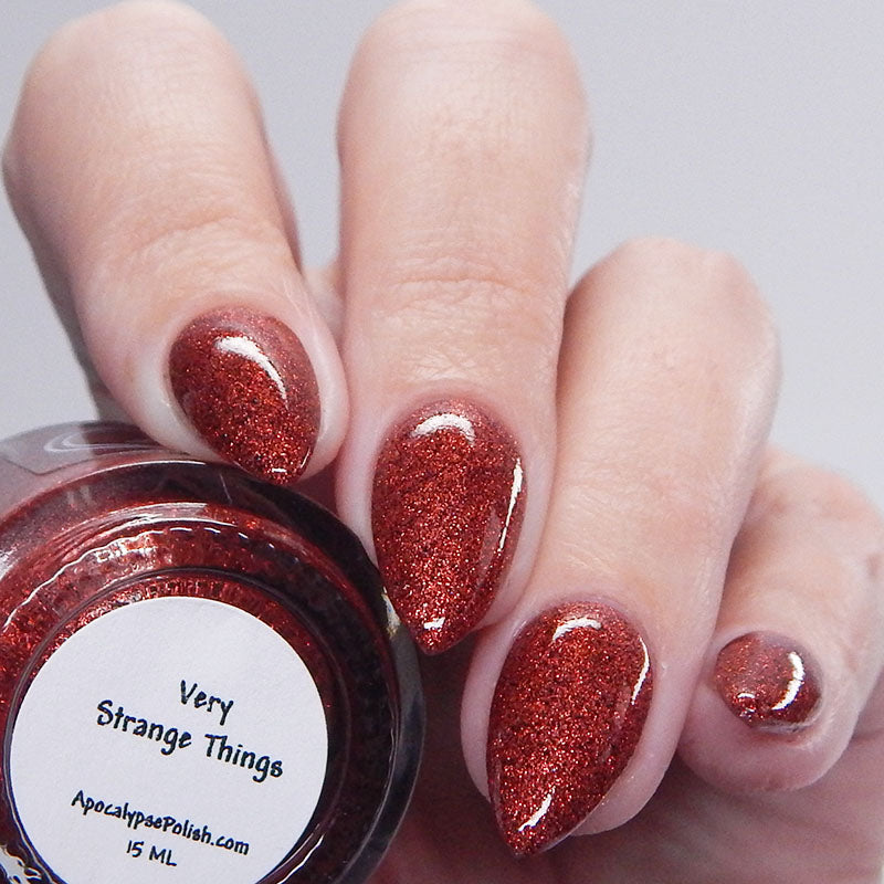 "Very Strange Things" is a glitter polish set in a clear base with holographic red and black micro glitters. 50% red, 50% black, 50% holographic, 100% very strange things. This shade is inspired by the title card of a very popular show. For extra impact, try this one over Dear Billy.